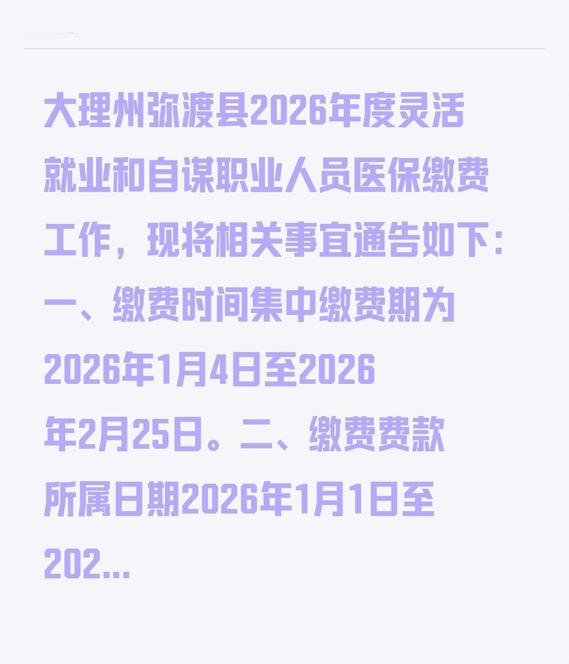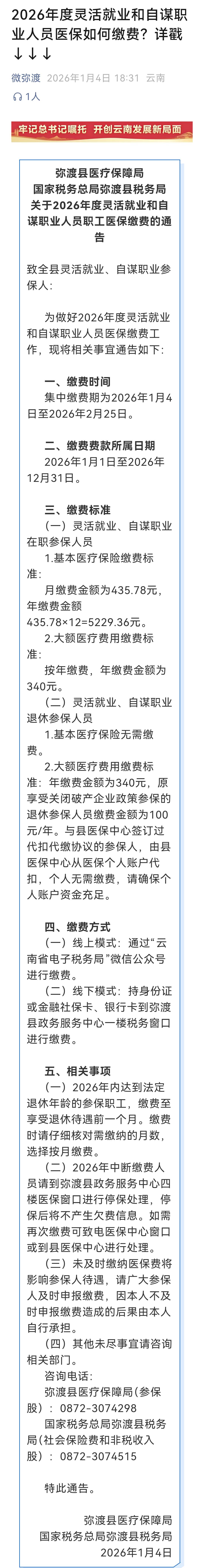 大理州弥渡县2026年度灵活就业和自谋职业人员医保缴费工作,现将相关事宜通告如下: 一、缴费时间集中缴费期为2026年1月4日至2026年2月25日。 二、缴费费款所属日期2026年1月1日至2026年12月31日。 三、缴费标准(一)灵活就业、自谋职业在职参保人员 1.基本医疗保险缴费标准:月缴费金额为435.78元,年缴费金额435.78×12=5229.36元。 2.大额医疗费用缴费标准:按年缴费,年缴费金额为340元。 两项缴费共计5569.37元