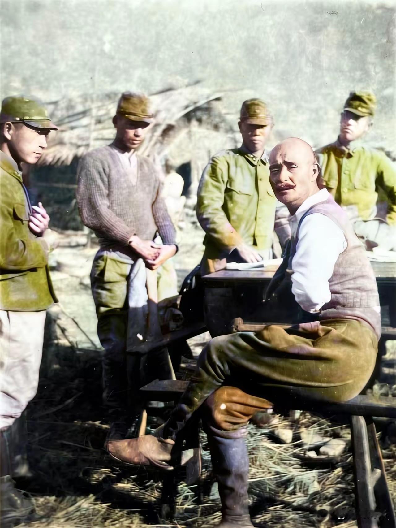 面对着镜头的这个男子,据说是一位苏联的飞行员,此时的他,已经被日本鬼子俘虏了,这张照片中能够看得出来,这个苏联飞行员的岁数可不小了,头发掉的已经没有几根了,感觉他的年龄得有50岁以上,这也间接说明一个问题,在二战时期,有些军人的年龄也是非常大的。在面对这些日本鬼子时,这个苏联飞行员显得很镇定,并没有表现出害怕的样子!
