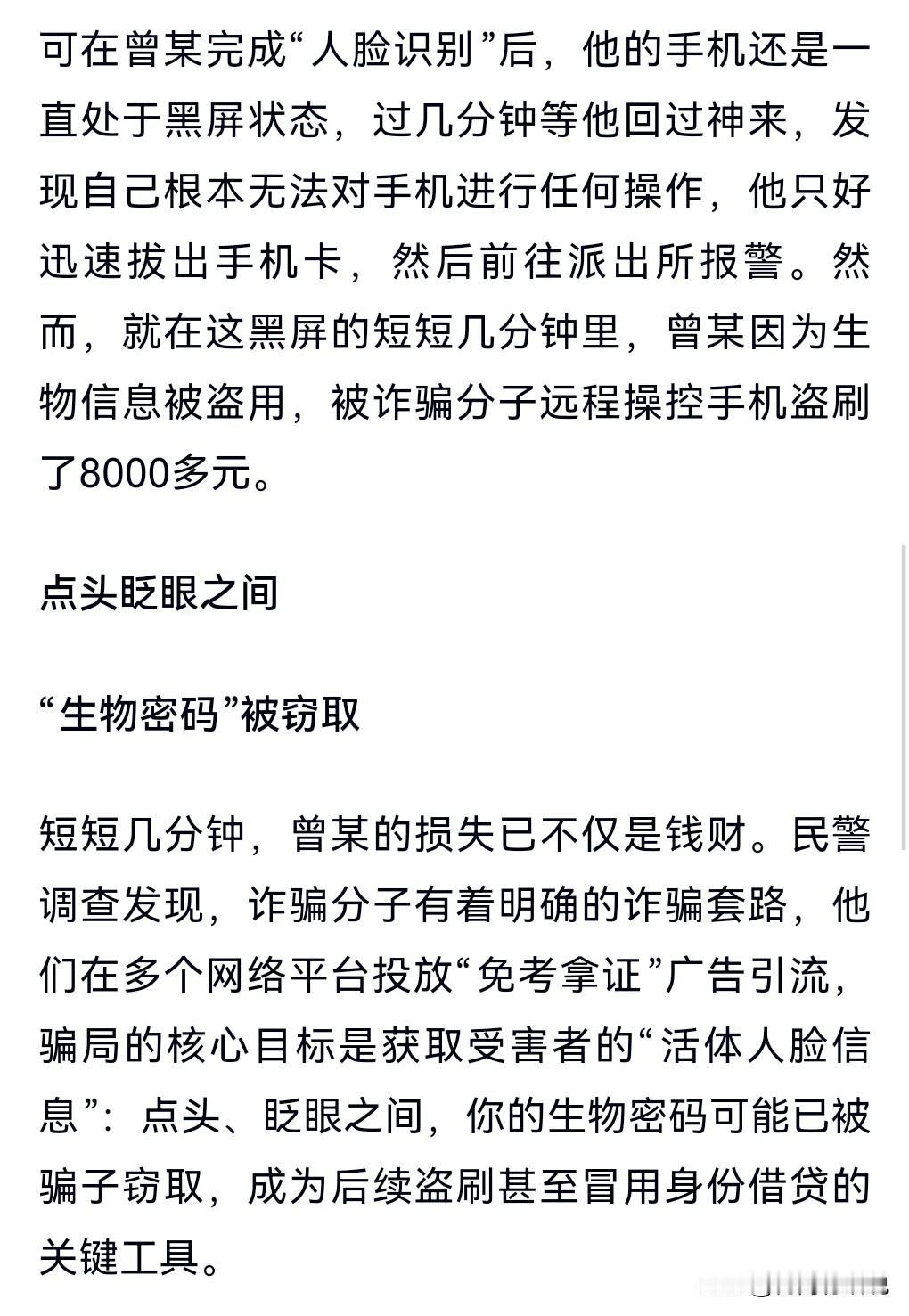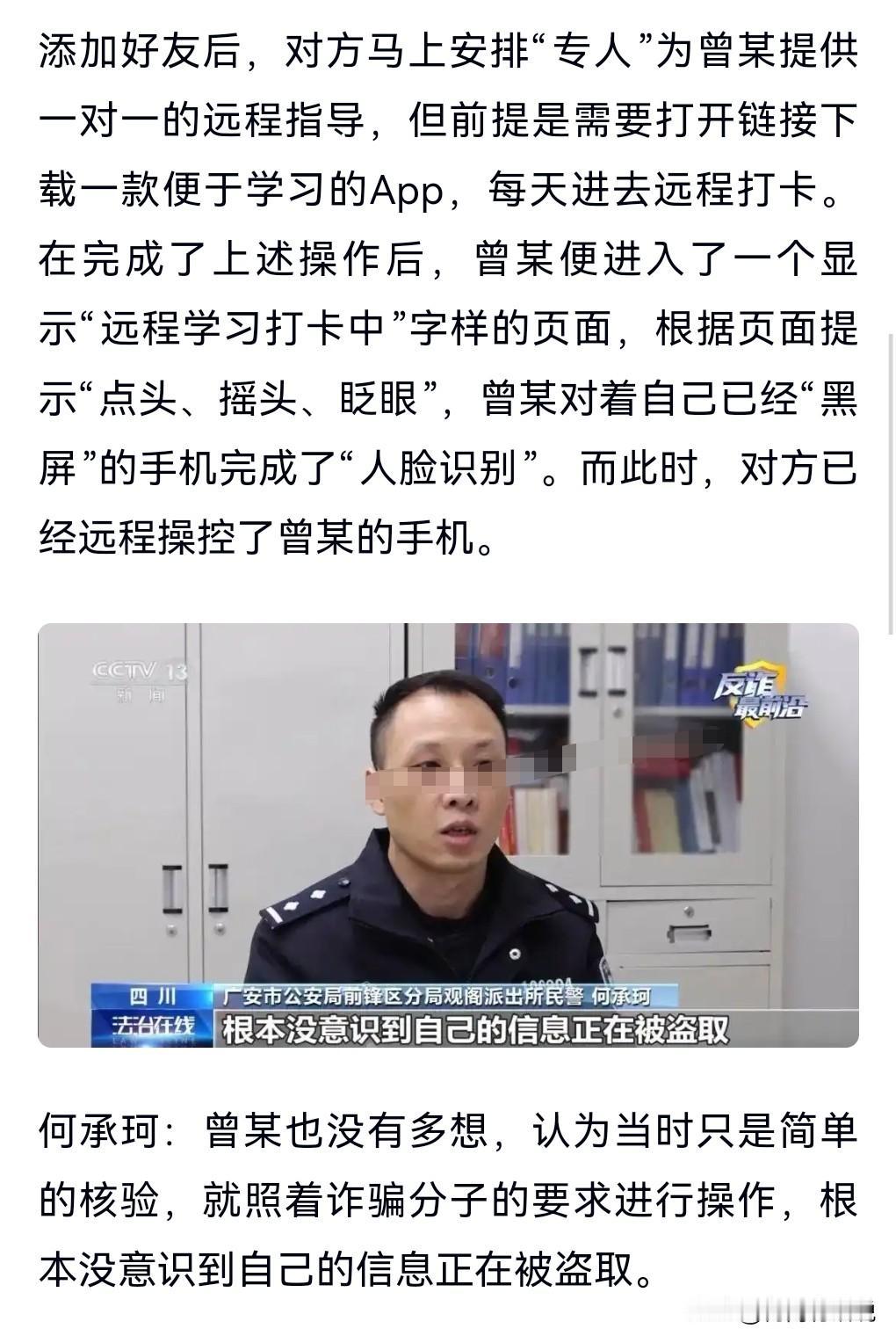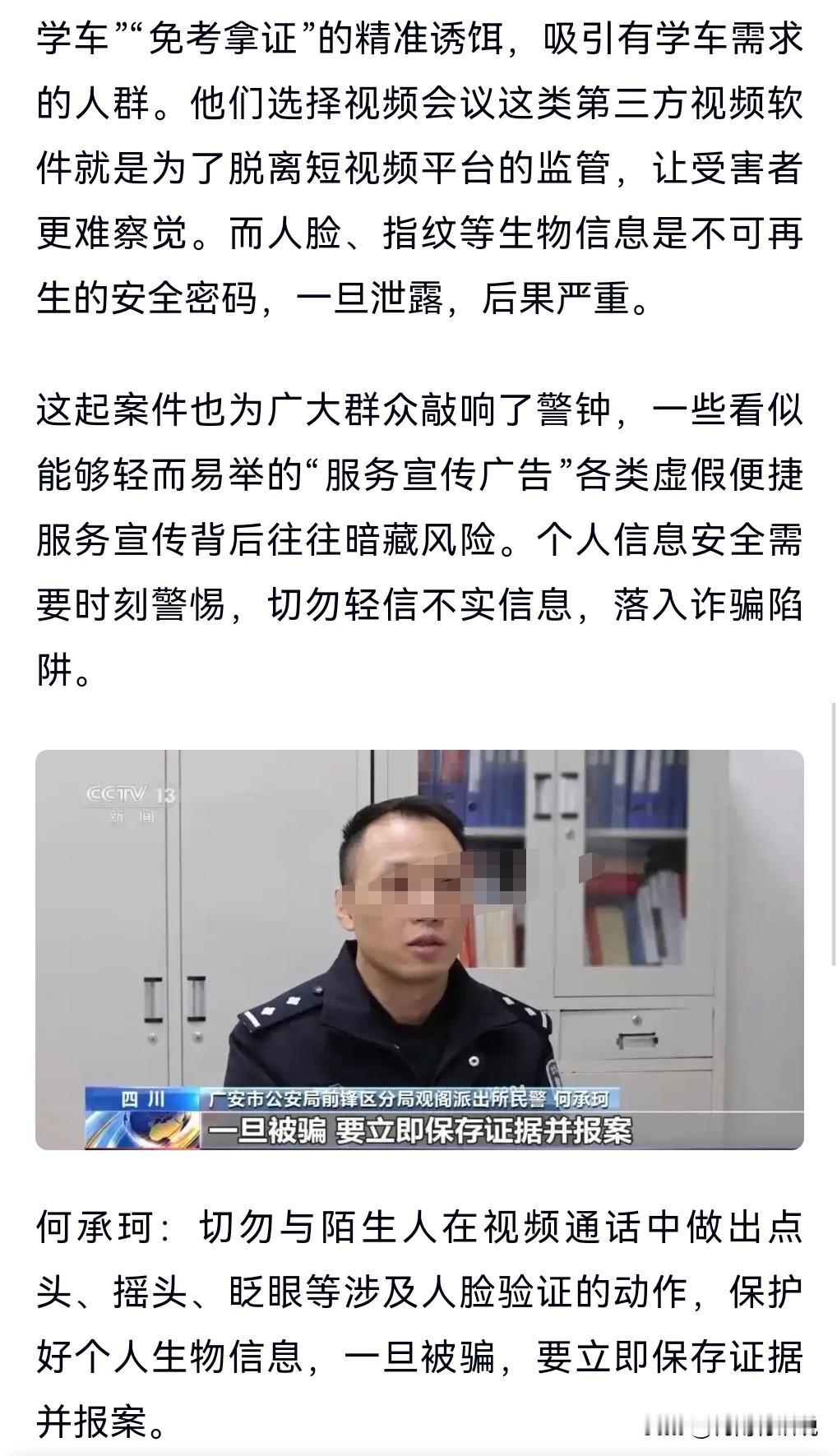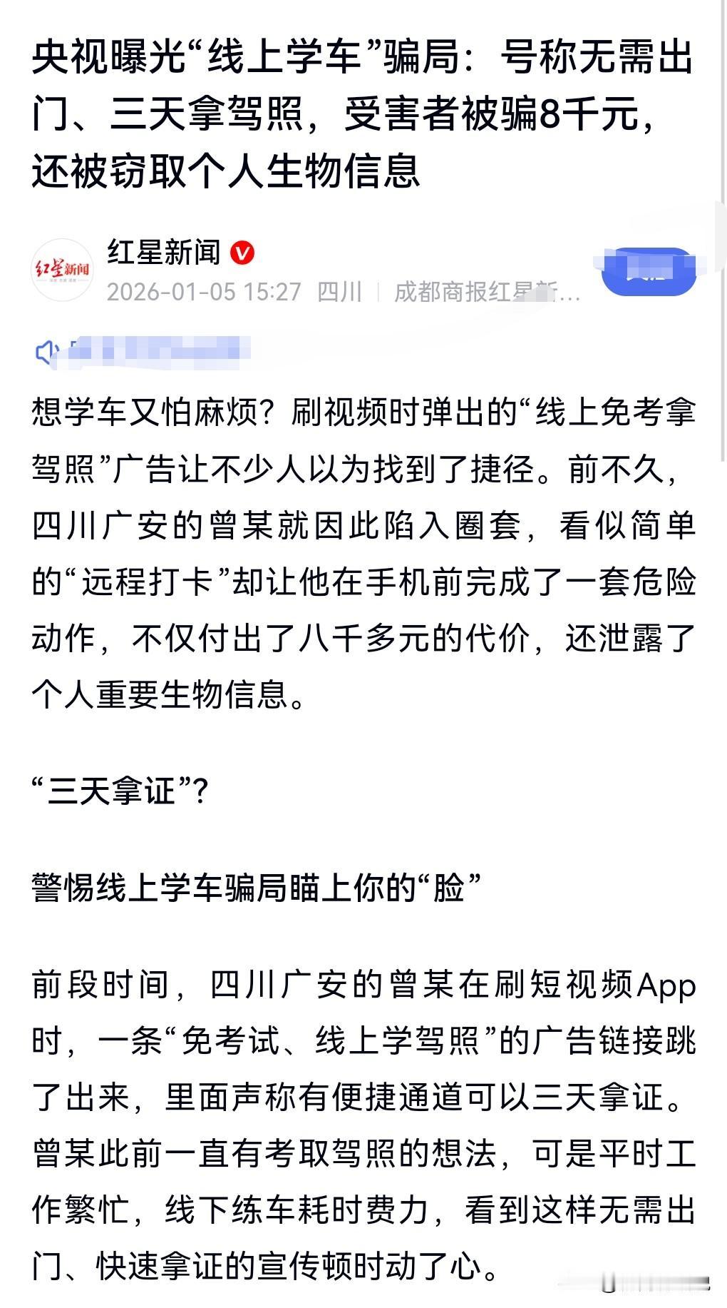 免考试,三天拿驾照?这也有人相信,这就没办法了。 央视曝光“线上学车”骗局。 网上有诈骗说线上免考拿驾照,结果让一些人上了当。 被骗者曾某,添加对方为好友后,对方要他下载了一款APP,说是用来线上打卡,下载后没过多久就控制了他的手机,转走了他8000块钱。 通过点头眨眼等动作,完成了人脸识别,这就让对方能够控制账户里的钱了。 所以要小心这个“线上学车”的骗局啊。
