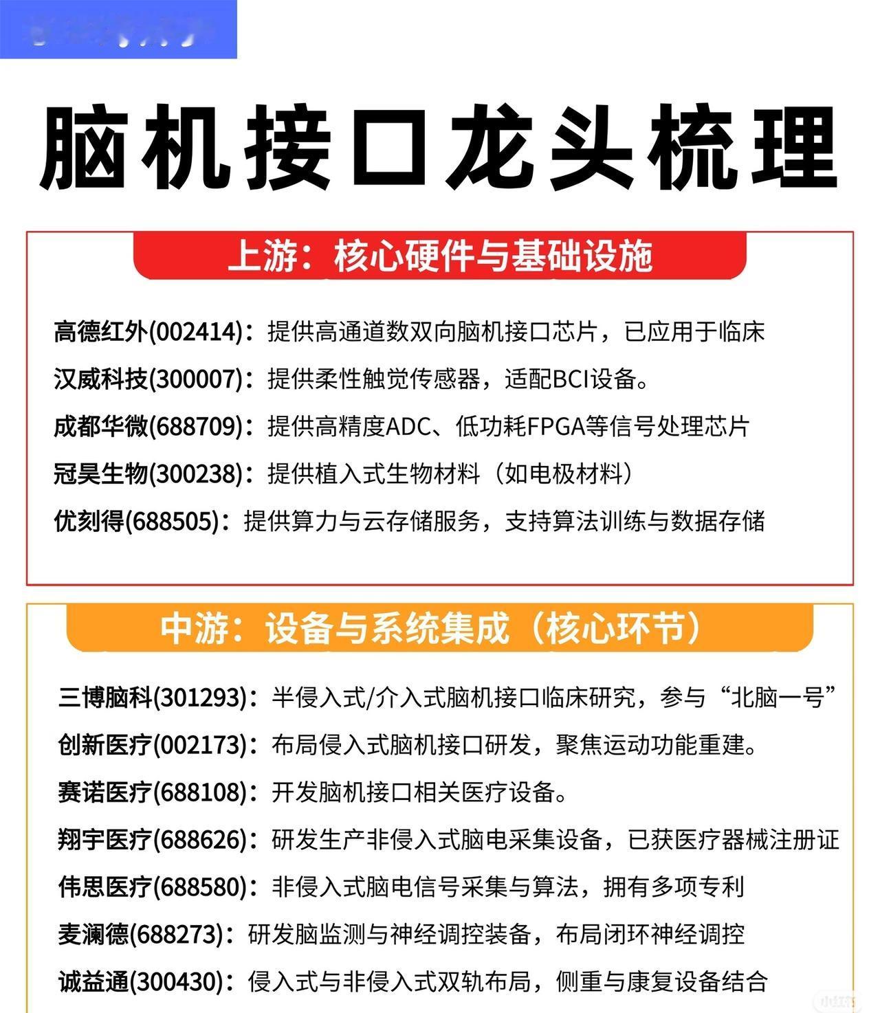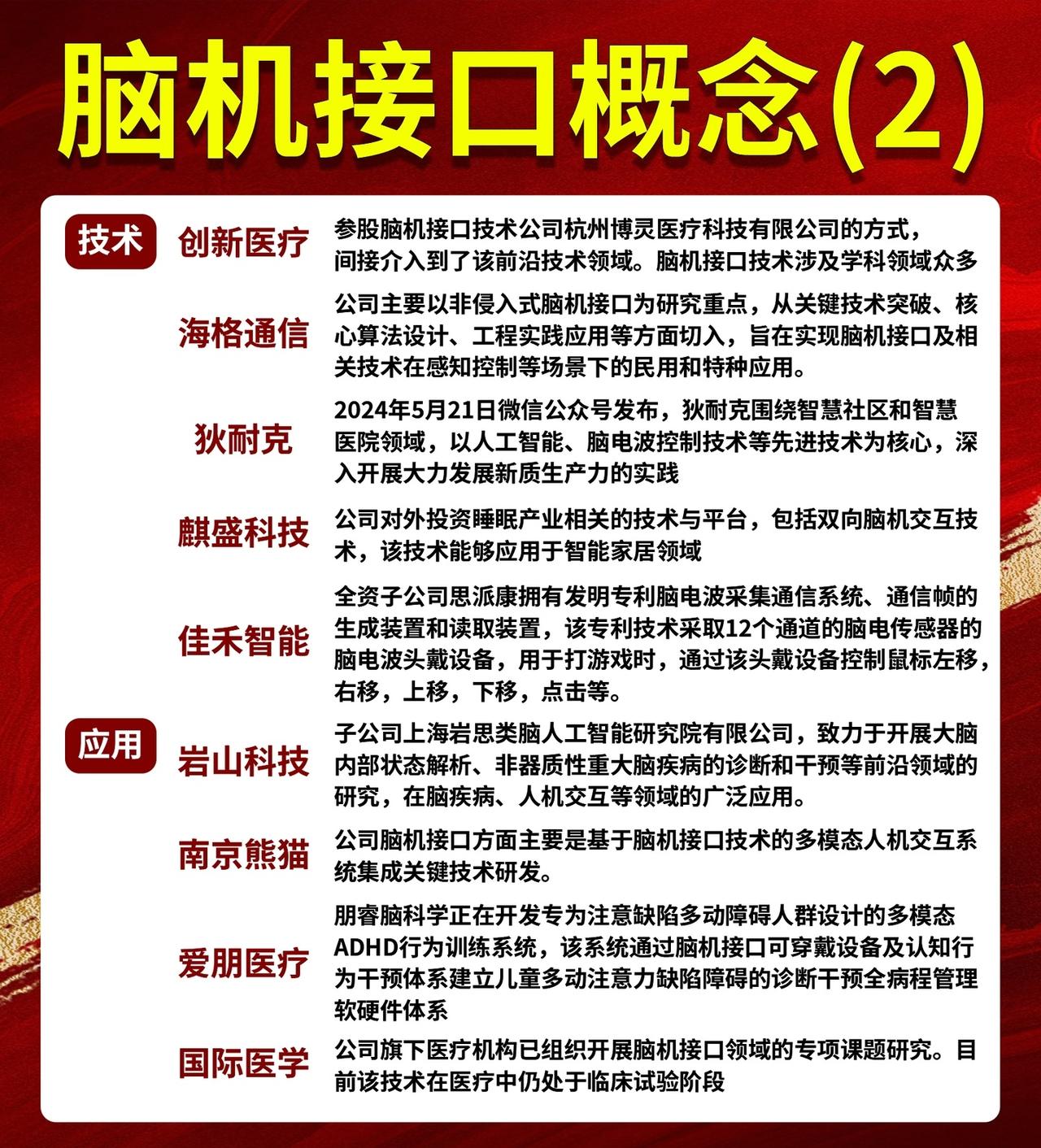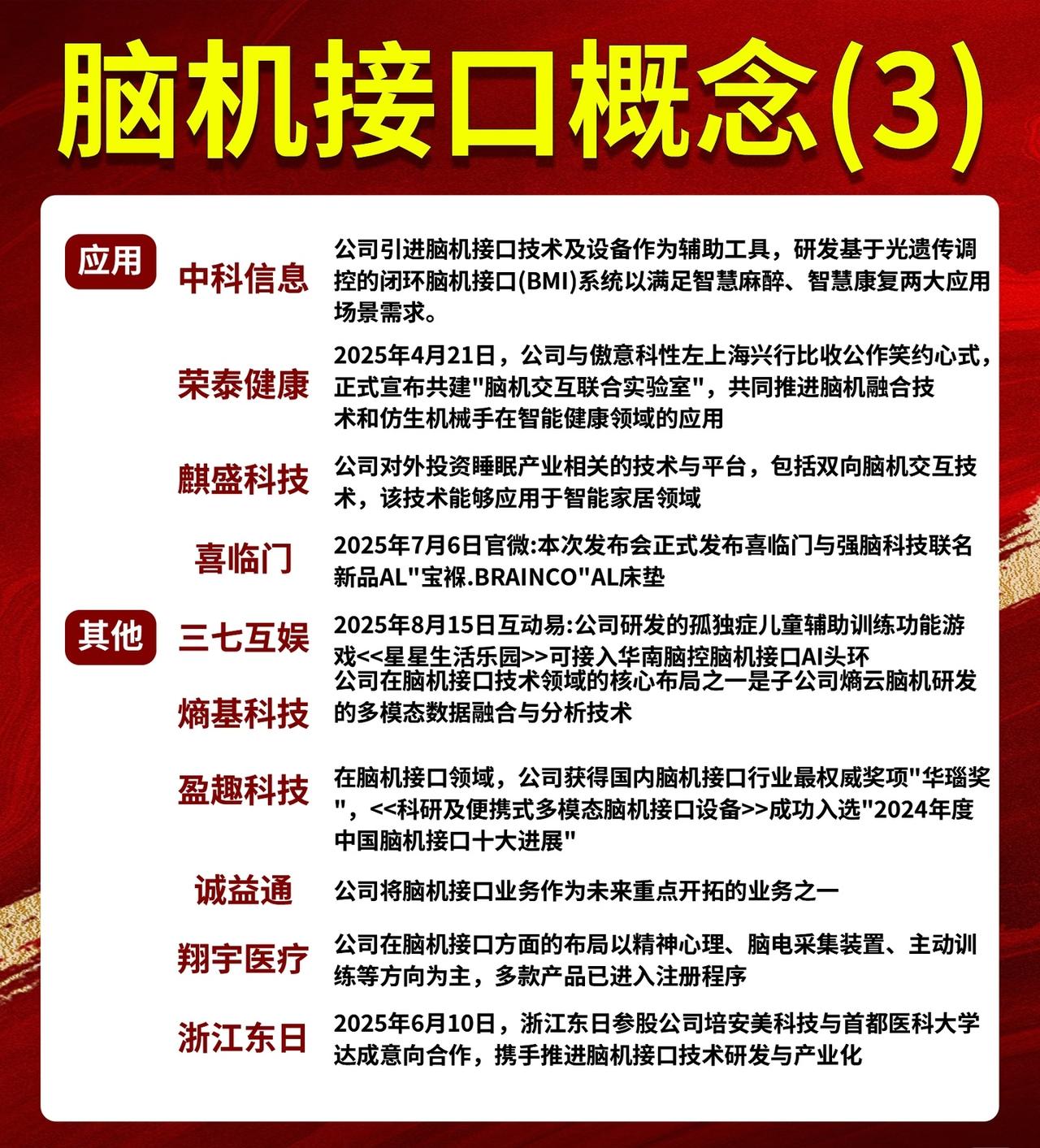 脑机接口概念总结 1. 研究阶段 & 设备 - 研究:三博脑科、国际医学、倍益康等开展临床试验、共建实验室或申报工程中心。 - 设备:汉威科技、盈趣科技、力合科创、东方中科等研发或合作生产脑电监测、植入式系统、测试平台等。 2. 技术 & 应用 - 技术:创新医疗(非侵入式)、狄耐克(脑电波控制)、麒盛科技(双向脑机交互)、佳禾智能(脑电波头戴设备专利)。 - 应用:岩山科技(脑疾病诊断干预)、南京熊猫(多模态人机交互)、爱朋医疗(ADHD训练系统)、国际医学(临床试验)。 3. 应用 & 其他 - 应用:中科信息(智慧麻醉/康复)、荣泰健康(脑机交互实验室)、麒盛科技(智能家居)、喜临门(联名AI床垫)、三七互娱(孤独症辅助游戏)、翔宇医疗(精神心理产品)、浙江东日(研发产业化)。 - 其他:益通将脑机接口作为重点业务。 总体来看: 涵盖科研攻关、设备研发、技术应用三大方向,涉及医疗康复、智能家居、游戏辅助、人机交互等领域,多家上市公司通过合作、投资或自研推进脑机接口产业化。