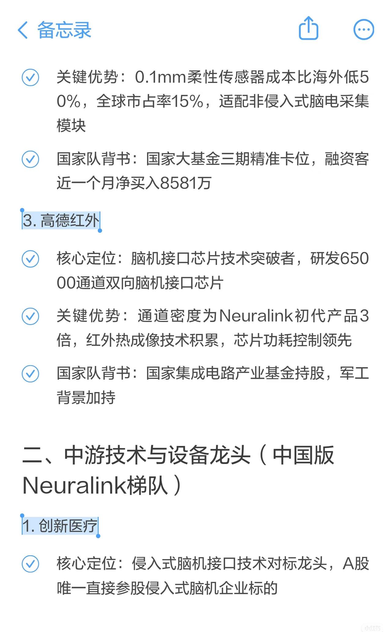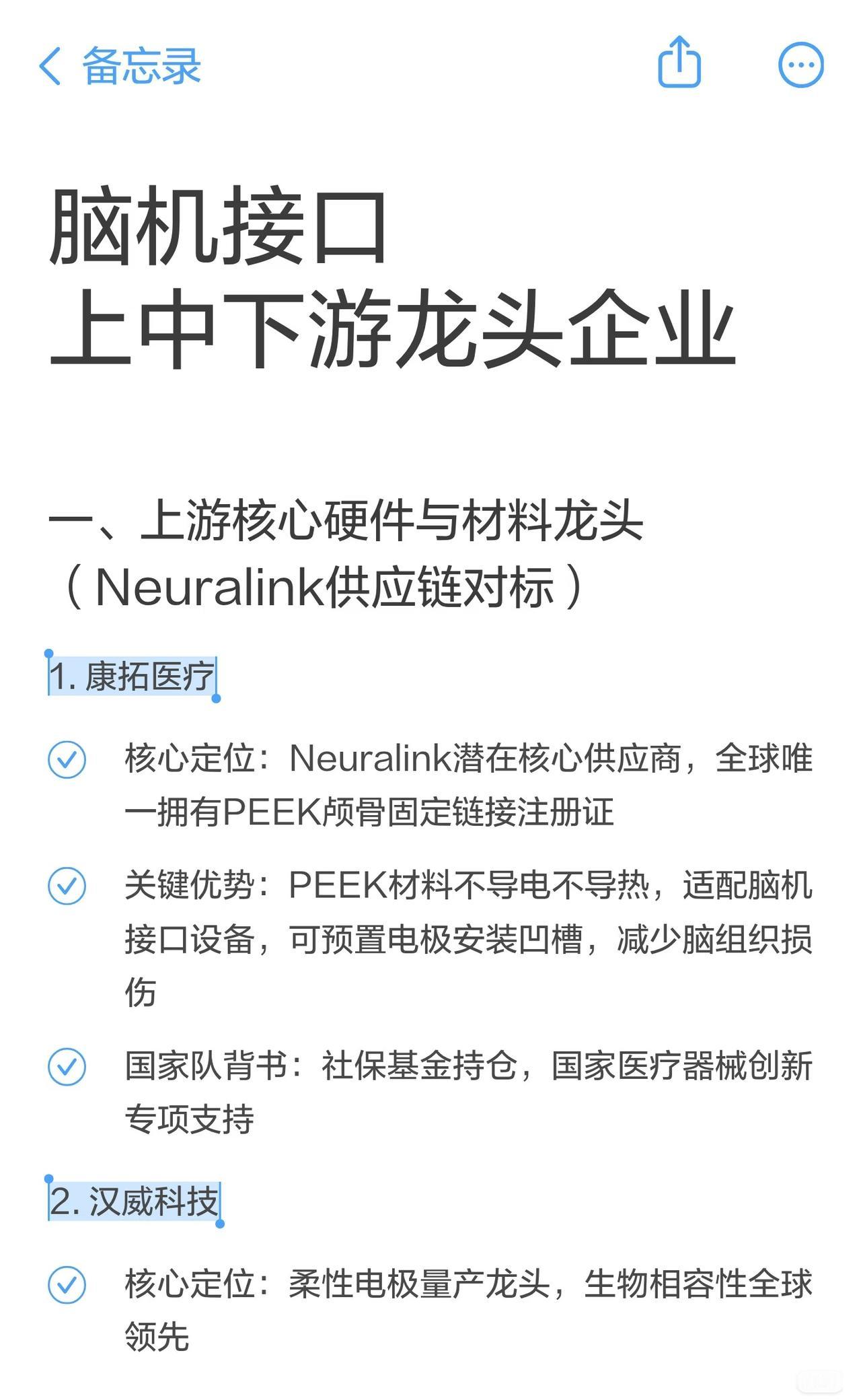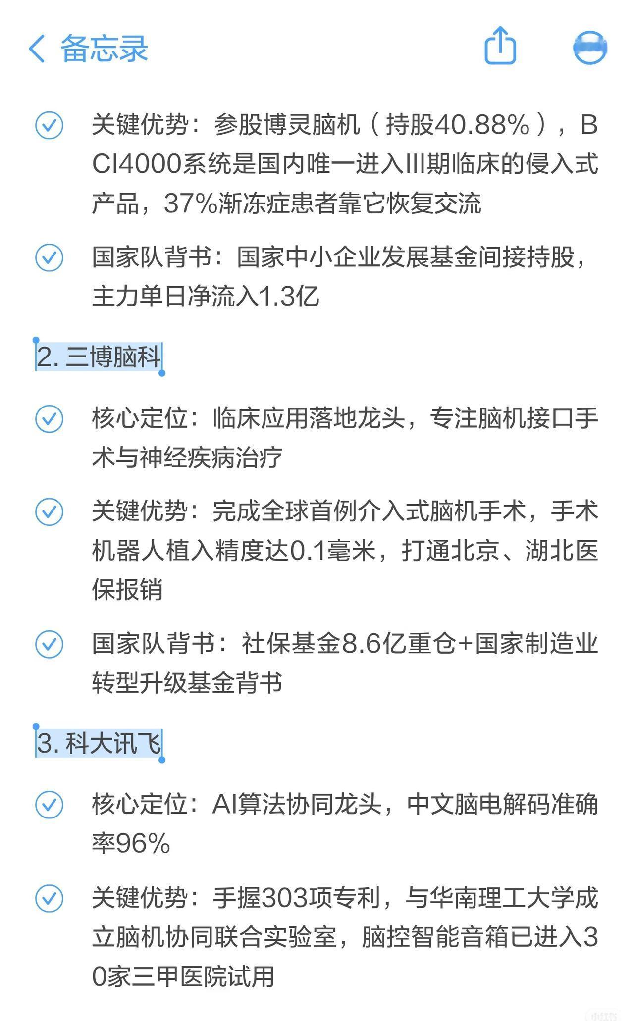 脑机接口概念总结 1. 研究阶段 & 设备 - 研究:三博脑科、国际医学、倍益康等开展临床试验、共建实验室或申报工程中心。 - 设备:汉威科技、盈趣科技、力合科创、东方中科等研发或合作生产脑电监测、植入式系统、测试平台等。 2. 技术 & 应用 - 技术:创新医疗(非侵入式)、狄耐克(脑电波控制)、麒盛科技(双向脑机交互)、佳禾智能(脑电波头戴设备专利)。 - 应用:岩山科技(脑疾病诊断干预)、南京熊猫(多模态人机交互)、爱朋医疗(ADHD训练系统)、国际医学(临床试验)。 3. 应用 & 其他 - 应用:中科信息(智慧麻醉/康复)、荣泰健康(脑机交互实验室)、麒盛科技(智能家居)、喜临门(联名AI床垫)、三七互娱(孤独症辅助游戏)、翔宇医疗(精神心理产品)、浙江东日(研发产业化)。 - 其他:益通将脑机接口作为重点业务。 总体来看: 涵盖科研攻关、设备研发、技术应用三大方向,涉及医疗康复、智能家居、游戏辅助、人机交互等领域,多家上市公司通过合作、投资或自研推进脑机接口产业化。