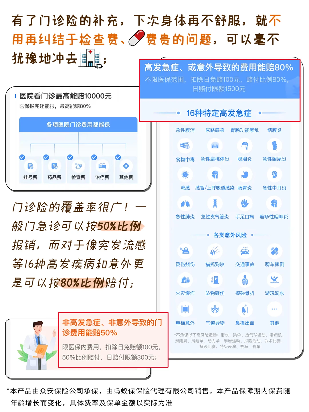 01.应对“低额高频”花费:哪怕每次花费不高够不上医保的起付线,这时候就可以让门诊险出马了,一般日常小病小痛扣除100免赔额后可按50%比例赔付,而对于像突发流感、肠胃炎等16种高发疾病和意外更是可以按80%比例赔付,而且还是不限次报销!