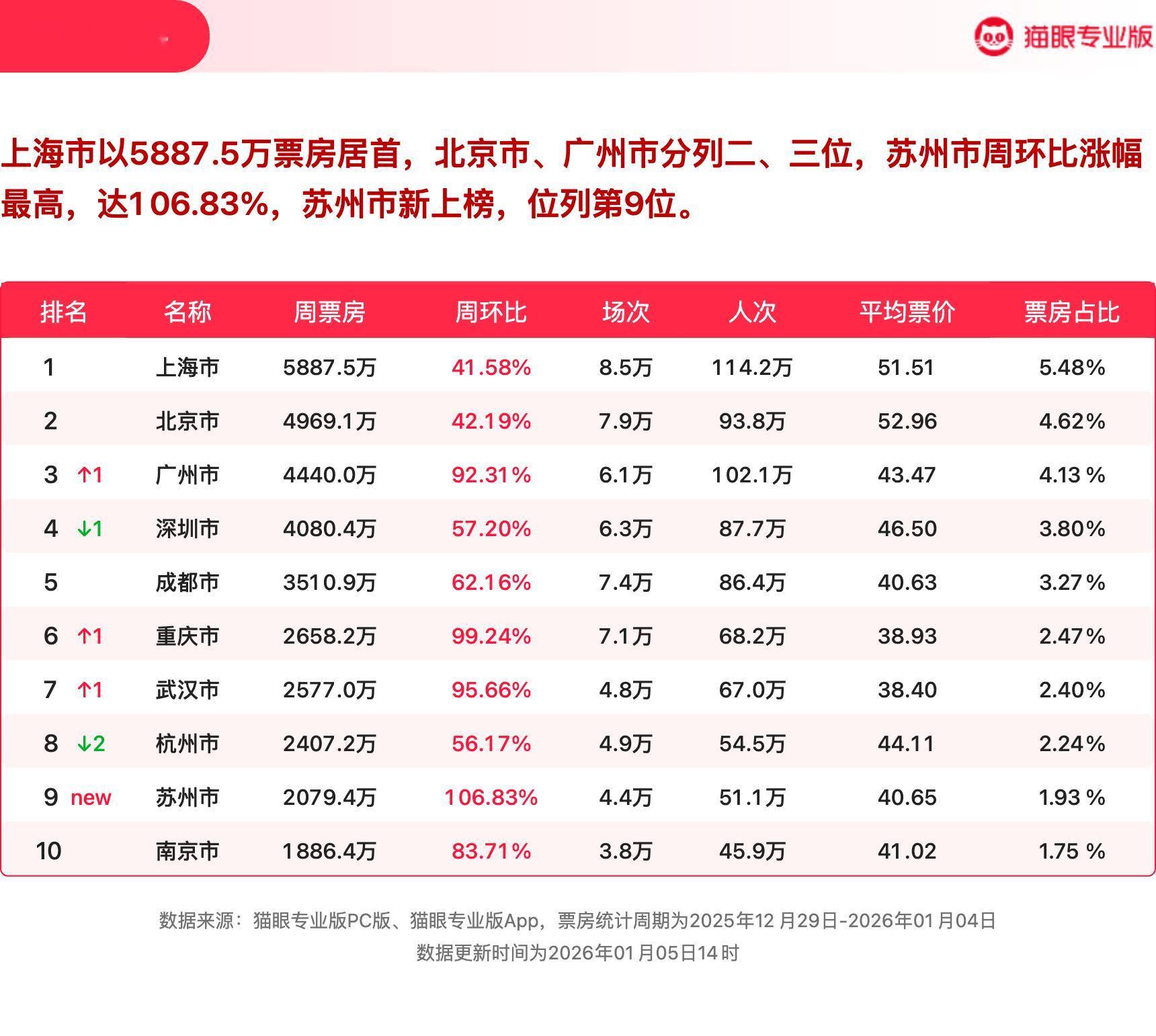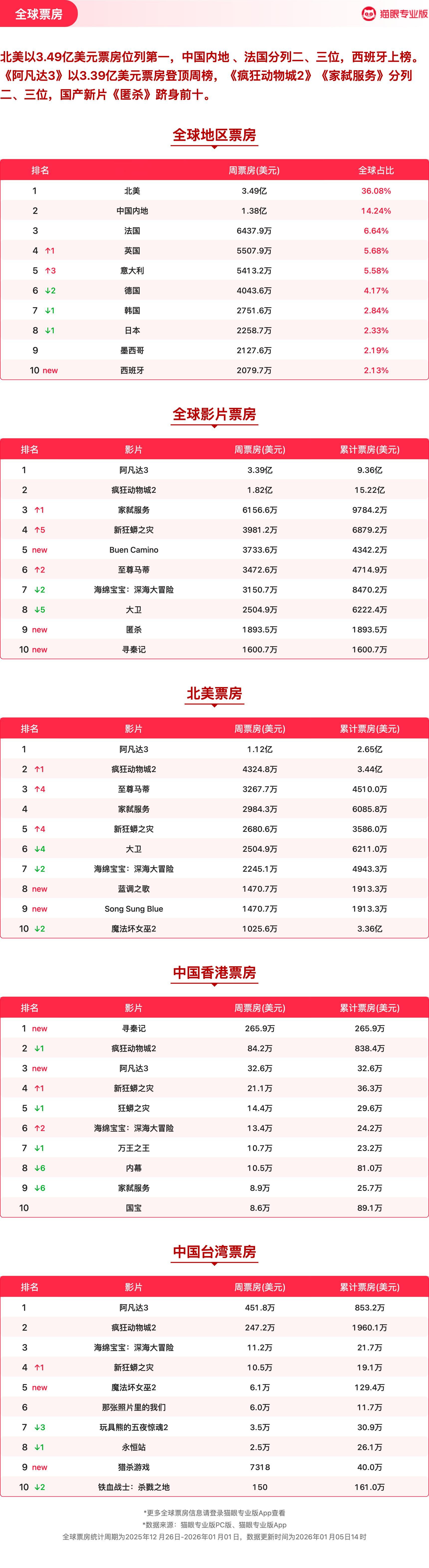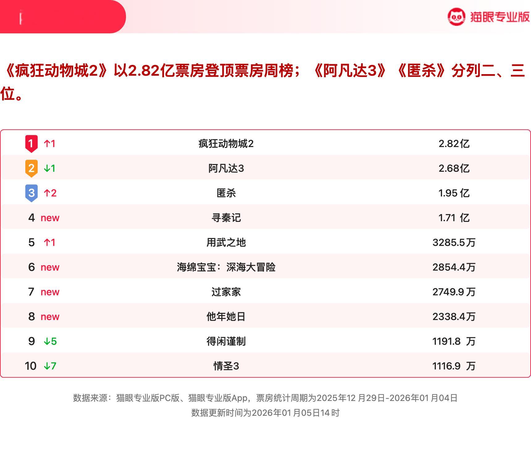 猫眼第52周电影周报 猫眼专业版第52周电影周报发布📒:周票房10.73亿,《疯狂动物城2》获票房周冠🏆,《阿凡达3》《匿杀》分列二三位。