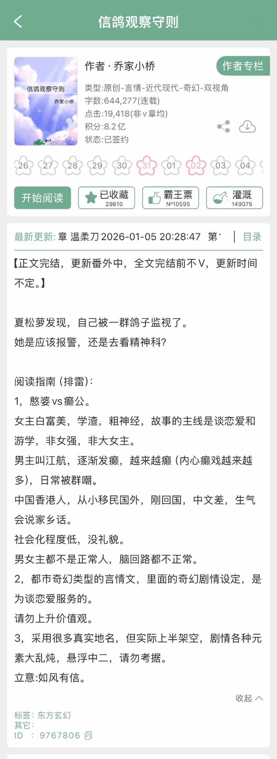 《信鸽观察守则》乔家小桥▫️夏松萝x江航▫️都市玄幻夏松萝在发现自己被一群鸽子监视了之前都以为自己是一位平平无奇的啃爹躺平咸鱼富三代,发现自己被鸽子监视了,同时又得知一位大律师金栈被鸽子抓伤了,夏松萝直觉这一切异常或许金栈知道。金栈确实知道,但他知道的东西从此颠覆了小夏的世界观。金栈是一位有着青鸟神力的信客,他手上有一封来自未来的信,信是小夏从未来寄回来给她的丈夫江航的。可是夏松萝此时并不认识江航…为了搞清楚这一切,小夏只能拜托金律师去查江航到底是谁。更巧合的是,在金栈带着他查到的信息来找夏松萝时,江航此前刚好故意弄坏了小夏家的水管还装成维修工来给她修水管,三人组正式碰头了!可是从小家破人亡过着颠沛流离生活的江航生性多疑,根本不相信金栈和夏松萝的话,甚至怀疑是半桶水的信客和刺客小夏给他做的局。谁都无法说服谁,于是他们决定出发去新疆找掮客Queen这个中间人来核实信息。在新疆的这一程真的是很颠覆的一段经历,从现代科学社会又重新进入了一段奇幻的旅程,即便是在现代社会也依旧有着奇门十二客的传承,而每一门“客”都有着自己的天赋神通,通过血脉来传承。从未来寄回来的那封信开始,慢慢地将一场持续了七百多年的两个阵营之间的战争展开,而夏江金三人为了阻止悲剧的发生已经重开了两个周目,这是最后一次机会了。故事看似很沉重,其实看的过程并没有这个感觉,反而是觉得太欢乐了,我真的控制不住笑得跟抽筋似的~男女主是天生一对的癫公颠婆,还是文盲cp,整天被金律师挖苦没文化,而金律师也被人嫌弃是个半桶水的废物信客,大家互相鄙视都有光明的未来~金律师虽然巨毒舌,可他就是男女主的爱情保镖啊,没他这个家得散!!因为男主真的很难搞,说话难听很没礼貌,没有金律师从中调和,江航哪怕作为普通人中的最高战力可能都会被打死:)不过江航又是一个重度恋爱脑,虽然总是给自己安排一些奇奇怪怪绿帽剧本,他坚信自己是从别人手中把夏松萝抢过来的!!他很早之前就对小夏一见钟情了,为了接近小夏多次弄坏了她家的东西想上门维修,可没想到夏爸全能自己修哈哈哈哈!后来得知小夏是他未来的老婆就直接把她当老婆看了,直接化身恋爱脑,世界醋王,一旦涉及到小夏的事就零帧起手开始发癫。小夏躺平了二十年,突然发现自己身负重任,要救老爸,还得救未来老公,最后发现还得救自己,只能迎难而上了。她的刺客天赋在江航一次酒后撒娇后被激发,虽然她只是刚觉醒的刺客,但她的天赋极强,人又很聪明,学武的时候进步神速,基本看一遍就会,还能融会贯通。她对江航的动心过程也是有迹可循,一开始真的可讨厌这个拽拽的香港仔了,甚至怀疑自己怎么会看得上他这样的人。在后来的相处过程中发现江航除了说话难听脾气不好之外都是优点,人长得帅又贼靠谱,喜欢上他是不可避免的事。