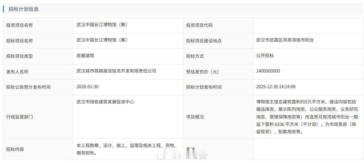 这座国家级博物馆在汉启动招标! 近日获悉,武汉中国长江博物馆(筹)项目招标计划已于近日正式公布。该项目选址于武昌区月亮湾城市阳台,规划建设的主馆总建筑面积约5万平方米,功能布局涵盖藏品库房、展示陈列空间、公众服务设施、业务研究用房及管理保障区域等核心板块。此外,项目还将对原月亮湾城市阳台一期工程盖下空间进行改造,涉及面积达6336平方米(不计入容积率),改造内容包括保留现状的市政泵房功能升级及配套用房优化等。据公开信息显示,该项目预估发包价高达14亿元人民币(1400000000元)。