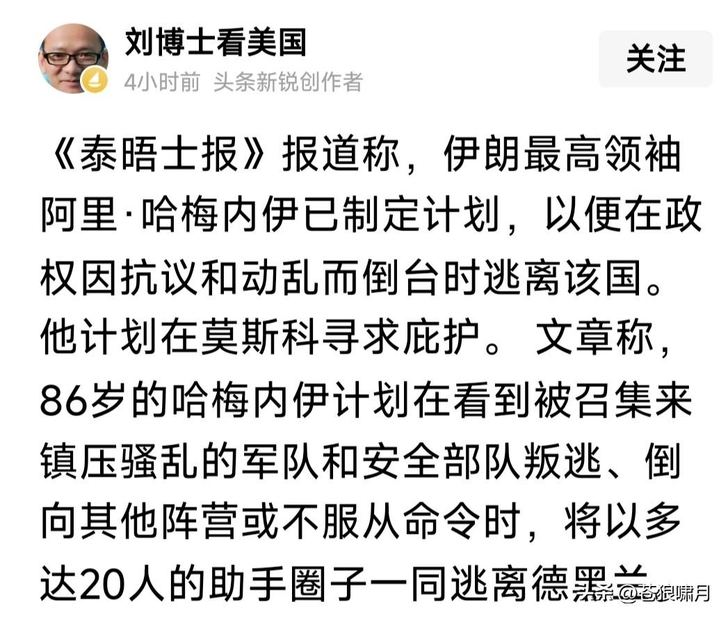 再次看到此消息,让人不得不信!哈梅与20余人助手,已制定撤离伊朗的计划,待出现局势不可控时行动。 此前看到有人披露,还有点半信半疑。这次刘博士引自英国权威媒体,“泰晤士报”消息,应该基本属实了! 近期以来,伊朗局势确实混乱。网上不断爆出各大城市,无数民众游行示威,甚至与革命卫队发生冲突消息。 伊朗这是怎么了?美以从中作乱吗?美国情报机构“中情局”,以色列摩萨德都很厉害,他们想搞乱谁,就无孔不入搞渗透,策动反对派作乱搞垮谁! 这一招屡见不鲜,比如伊拉克利比亚叙利亚,包括这次突袭委内瑞拉抓获马杜罗!都是事先渗透策动的结果! 关键问题是,如果伊朗出问题,鹅就在中东失去立足点,该地区以后就是老美的地盘了!此事让鹅情何以堪? …………