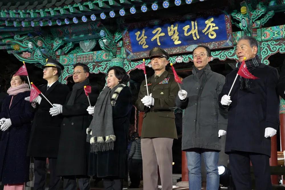 2025年12月31日,美国陆军第19远征保障司令部司令朴镇少将,在韩国大邱举行的达古别大钟仪式上,与大邱社区的重要领导人并肩站立。这一年度传统标志着新的一年的开始,并提供了一个回顾过去一年的时刻。 朴少将出生于韩国,后来移民美国。