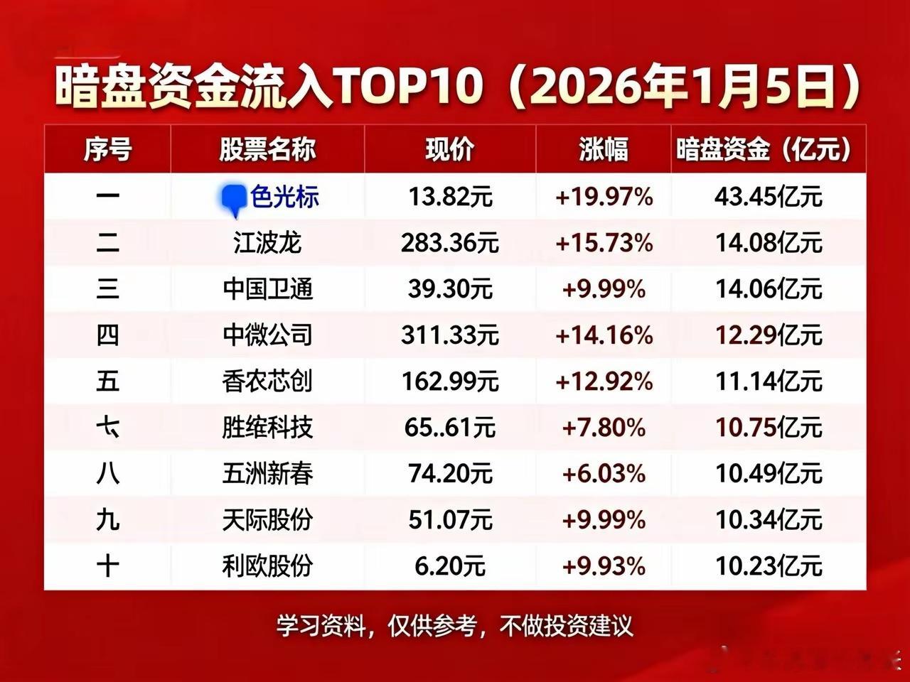 暗盘资金流入 TOP10(2026 年 1 月 5 日)一、蓝色光标 现价13.82元 涨幅+19.97% 暗盘资金43.45亿元二、江波龙 现价283.36元 涨幅+15.73% 暗盘资金14.08亿元三、中国卫通 现价39.30元 涨幅+9.99% 暗盘资金14.06亿元四、中微公司 现价311.33元 涨幅+14.16% 暗盘资金12.29亿元五、香农芯创 现价162.99元 涨幅+12.92% 暗盘资金11.52亿元六、信维通信 现价65.61元 涨幅+5.82% 暗盘资金11.14亿元七、胜宏科技 现价310.00元 涨幅+7.80% 暗盘资金10.75亿元八、五洲新春 现价74.20元 涨幅+6.03% 暗盘资金10.49亿元九、天际股份 现价51.07元 涨幅+9.99% 暗盘资金10.34亿元十、利欧股份 现价6.20元 涨幅+9.93% 暗盘资金10.23亿元学习资料,仅供参考,不做投资建议。