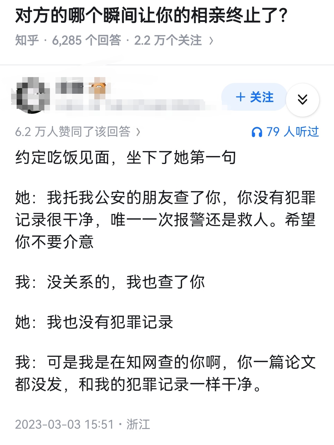 女:姐妹们,遇到个虾头男,相亲还查我知网,避雷啊