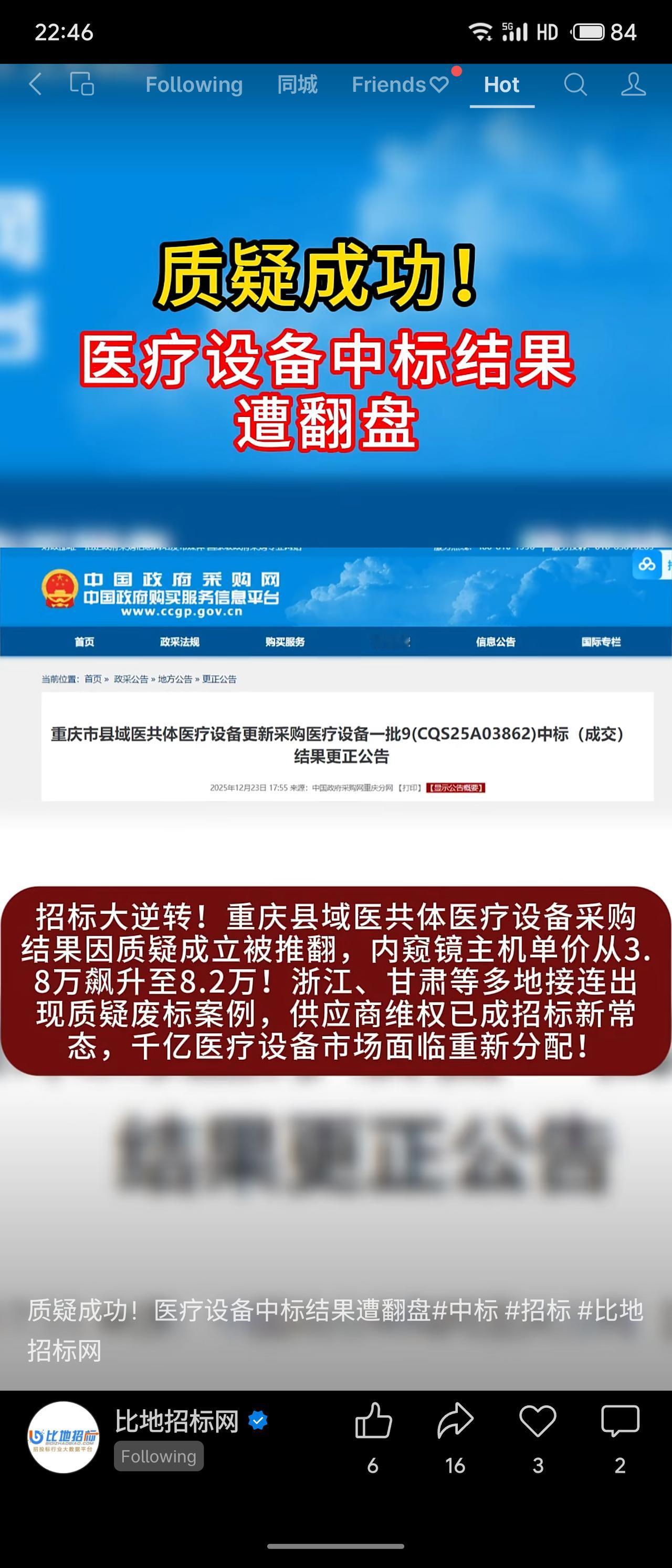 重庆一医疗设备采购项目因供应商质疑,原中标结果被推翻,核心设备单价大幅上涨。多地出现类似案例,显示供应商维权正改变招投标生态。