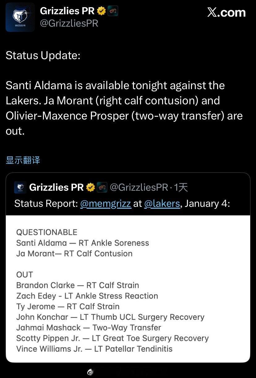 官方:阿尔达马今晚可以出战,莫兰特(右小腿挫伤)和普罗斯将将缺席比赛。灰熊vs湖