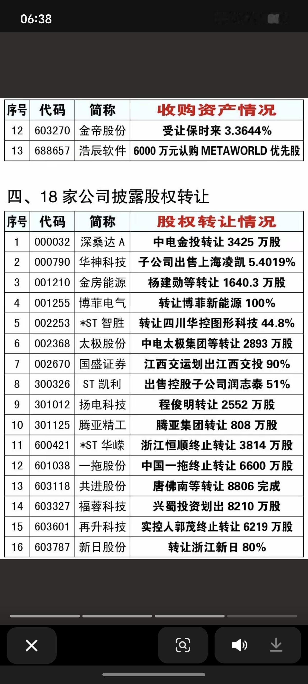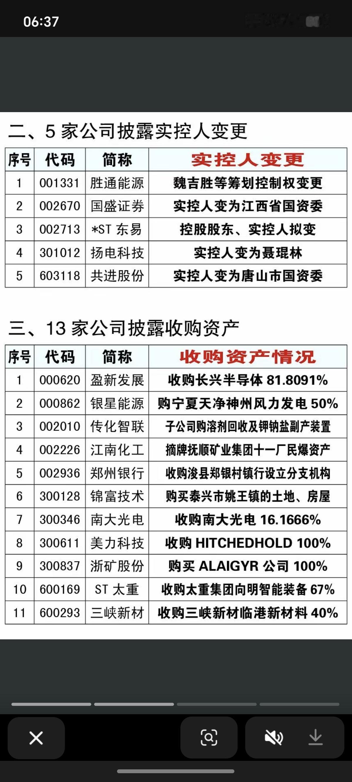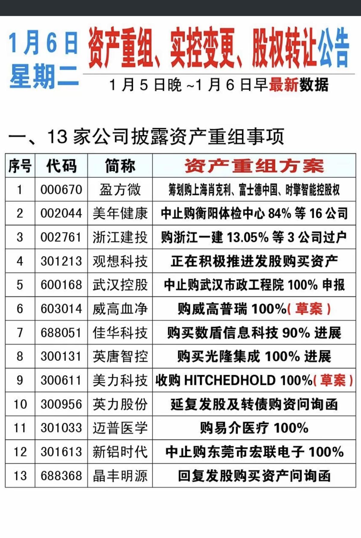 1.6周二 最新:资产重组,实控人变更,回购股份,股权转让公告! 13家公司披露资产重组事项,5家实控人变更,13加收购资产,18加披露股权转让