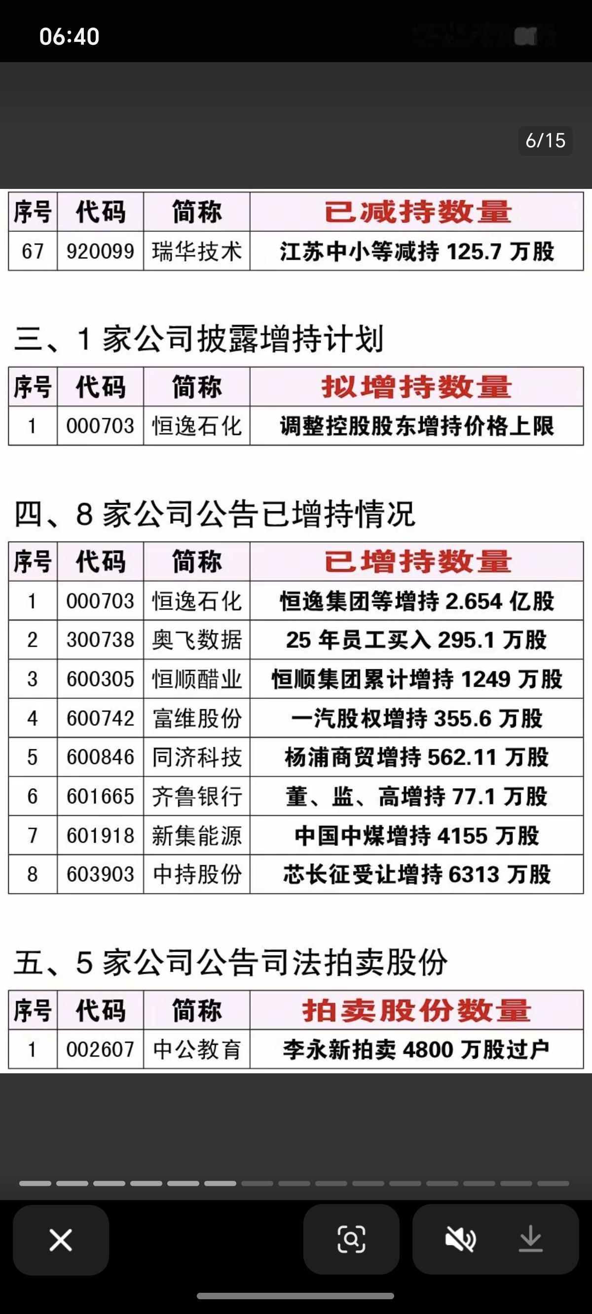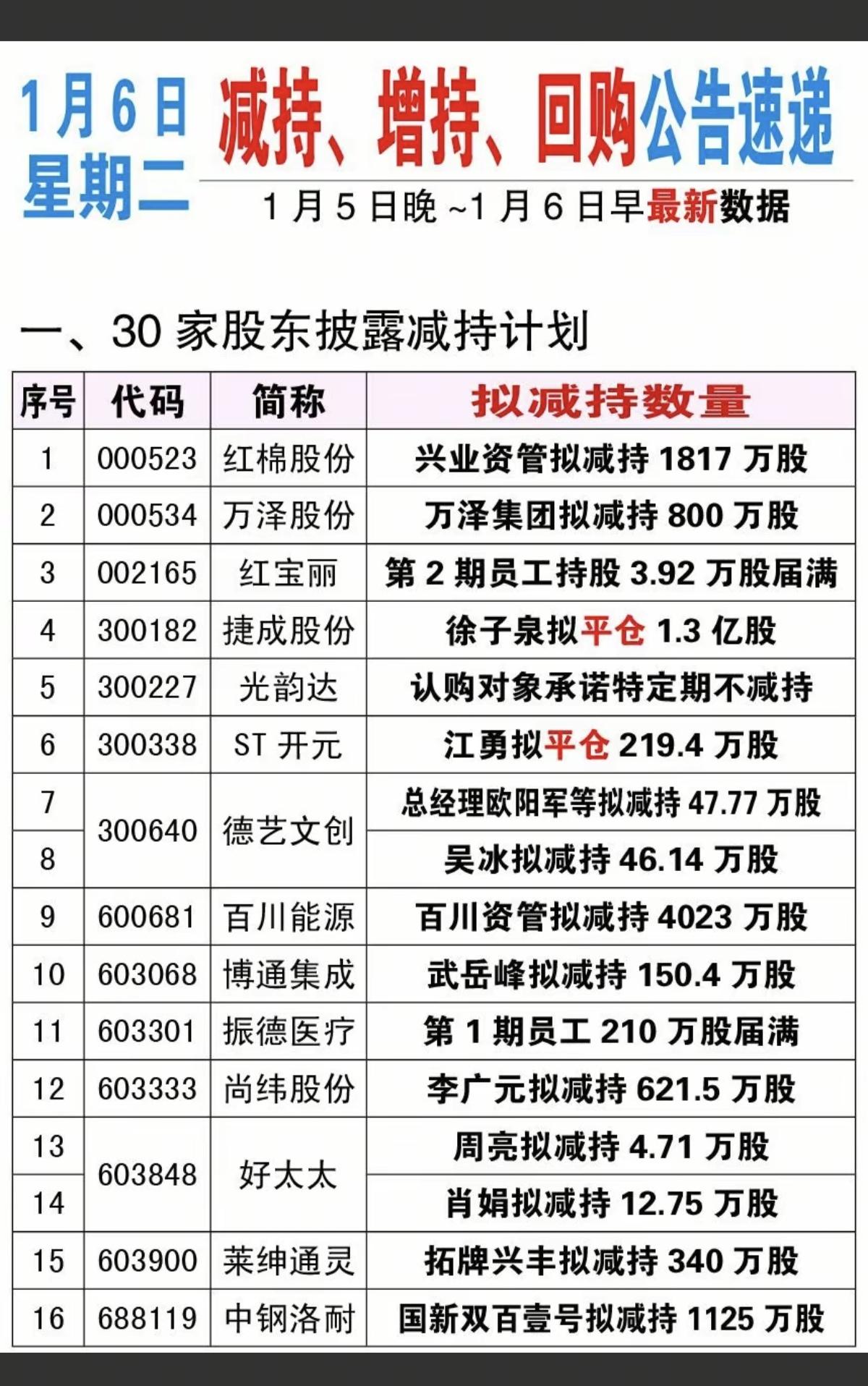 1.6周二 最新:增持,减持,回购公告! 一、30家公司披露减持计划 二、1家公司增持 三、3家公司回购计划 四、5家公司法拍股份