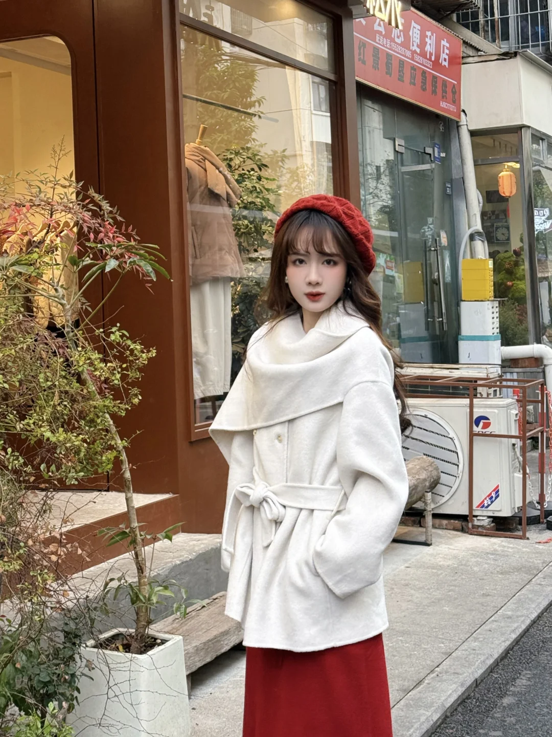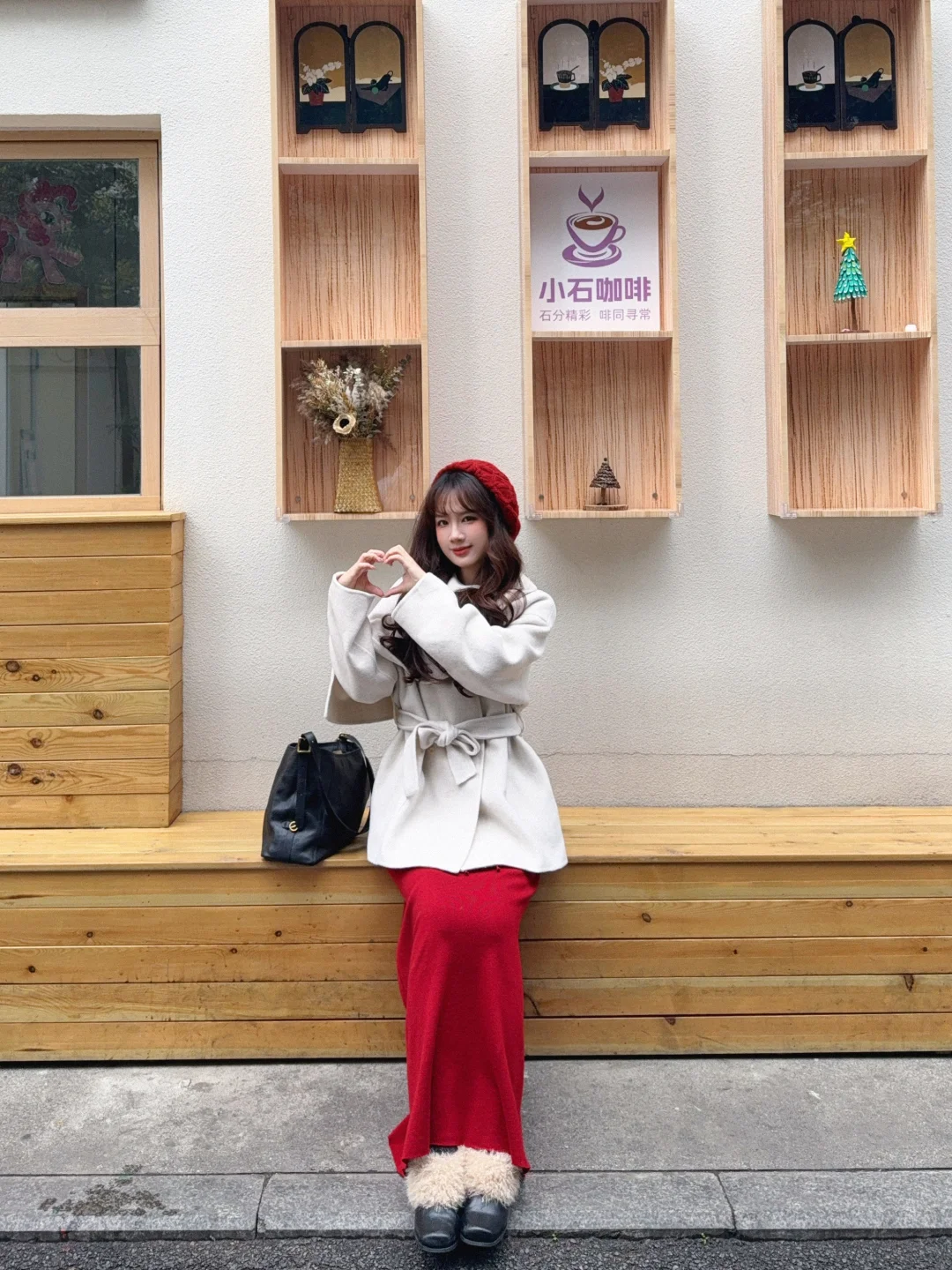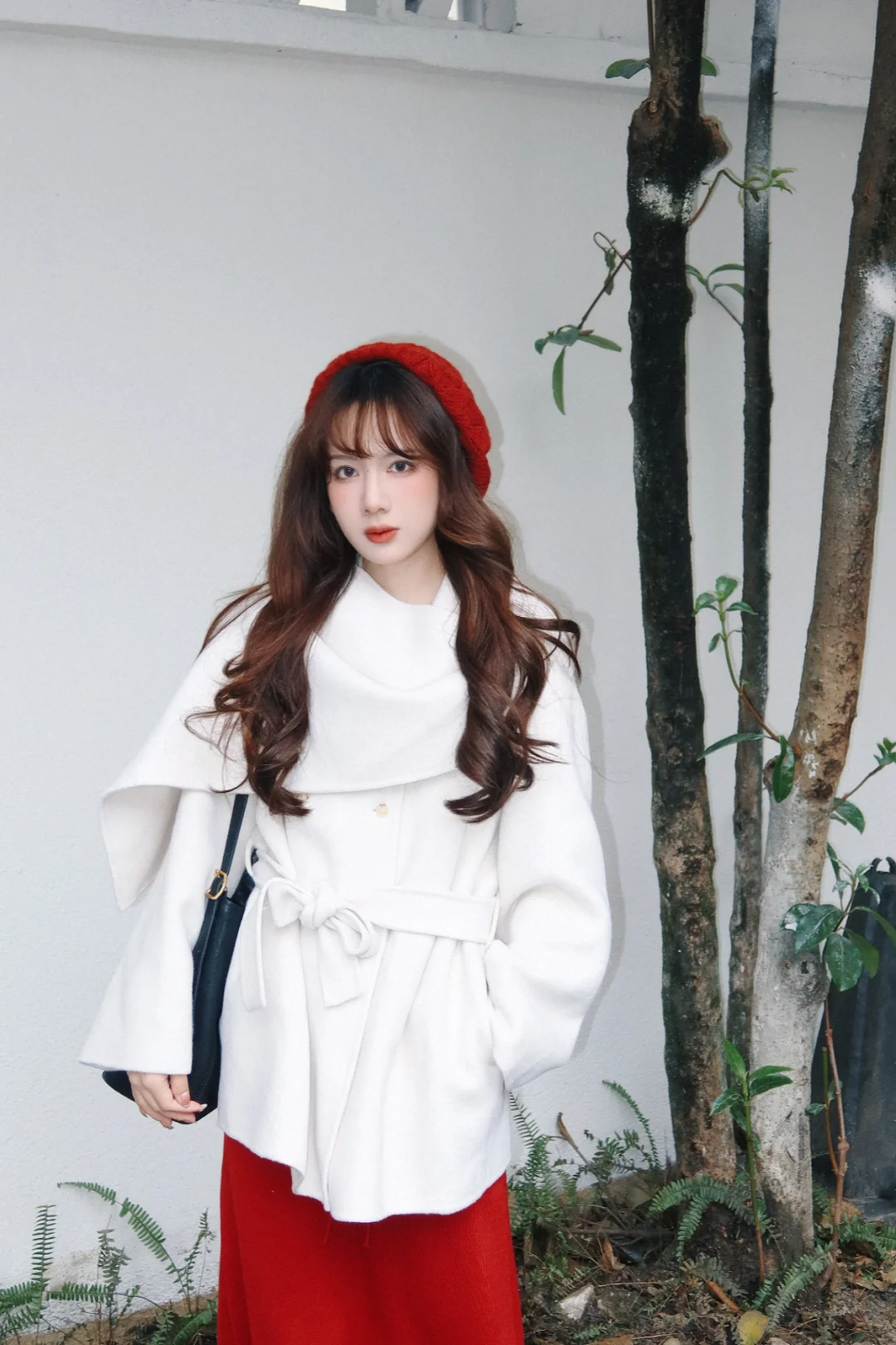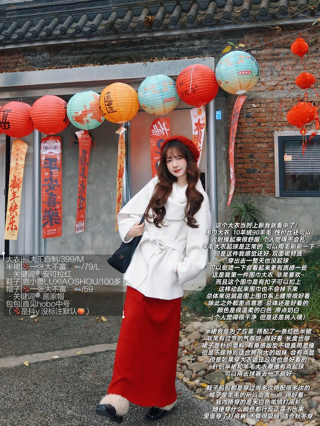 168/104左右 第一件围巾大衣 非常满意呀哈哈哈 没有选择常规搭配 搭配了一条红色半裙 很适合过年过节穿 非常有氛围感 (少面积的红色没有非常挑人 我一般新年穿搭都是考虑部分红色或者用红色配饰点亮整体) 围巾大衣的搭配思路 其实可以参考我之前出过白大衣搭配思路(差不多) 不过围巾大衣更适合光腿穿骑士靴(小个子很显比例) 还可以搭配一些有垂感的半裙(黑白灰棕红蓝之类的) 下摆也可以搭配丝绒针织质地的裙子 很显贵 除了红色 白色其实搭配很多亮色系都很出彩 比如蓝色粉色黄色绿色之类的 上下呼应即可 这套想要不出错 (觉得自己拿捏不住红色的) 把下装换成黑色裙子或者黑色拖地裤也可以的 帽子也考虑黑色或者白色 这样就是比较日常的大衣穿搭了 也是很有气质的一套 可以尝试一下~