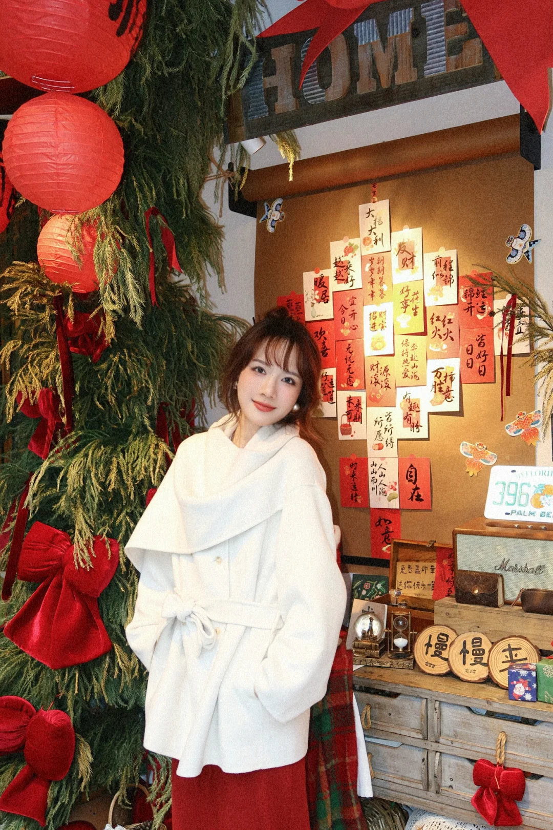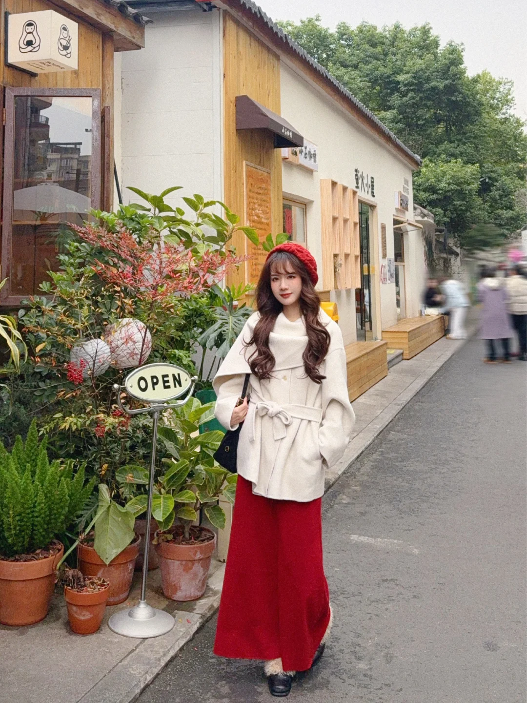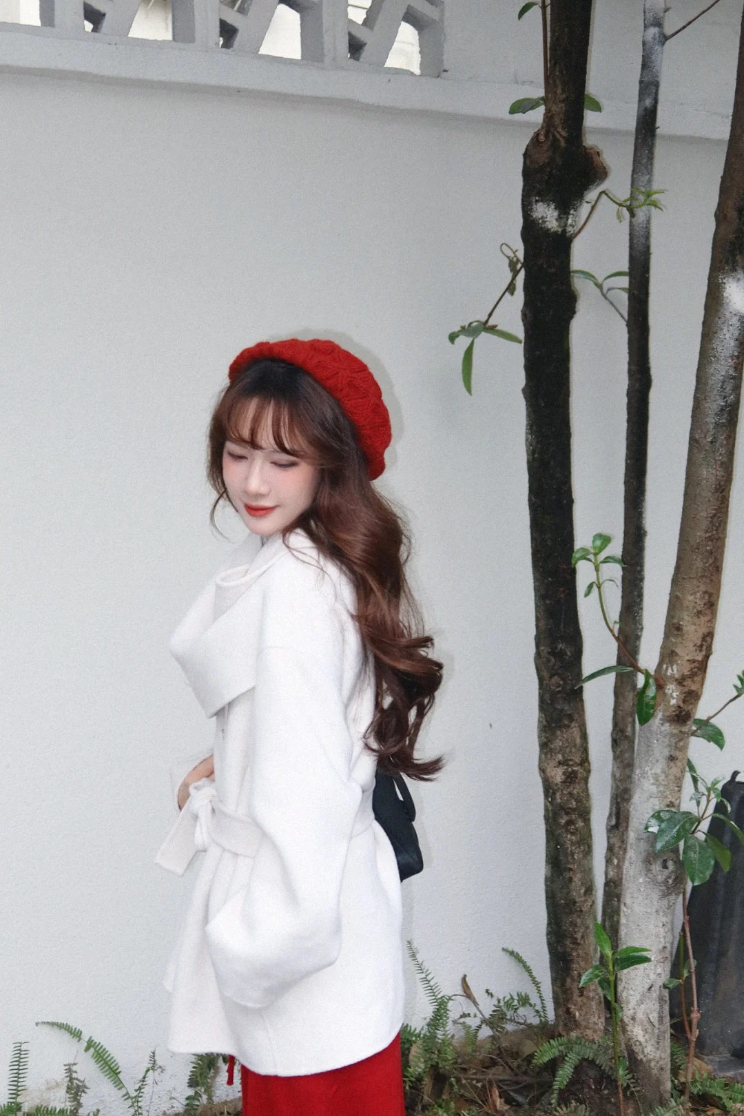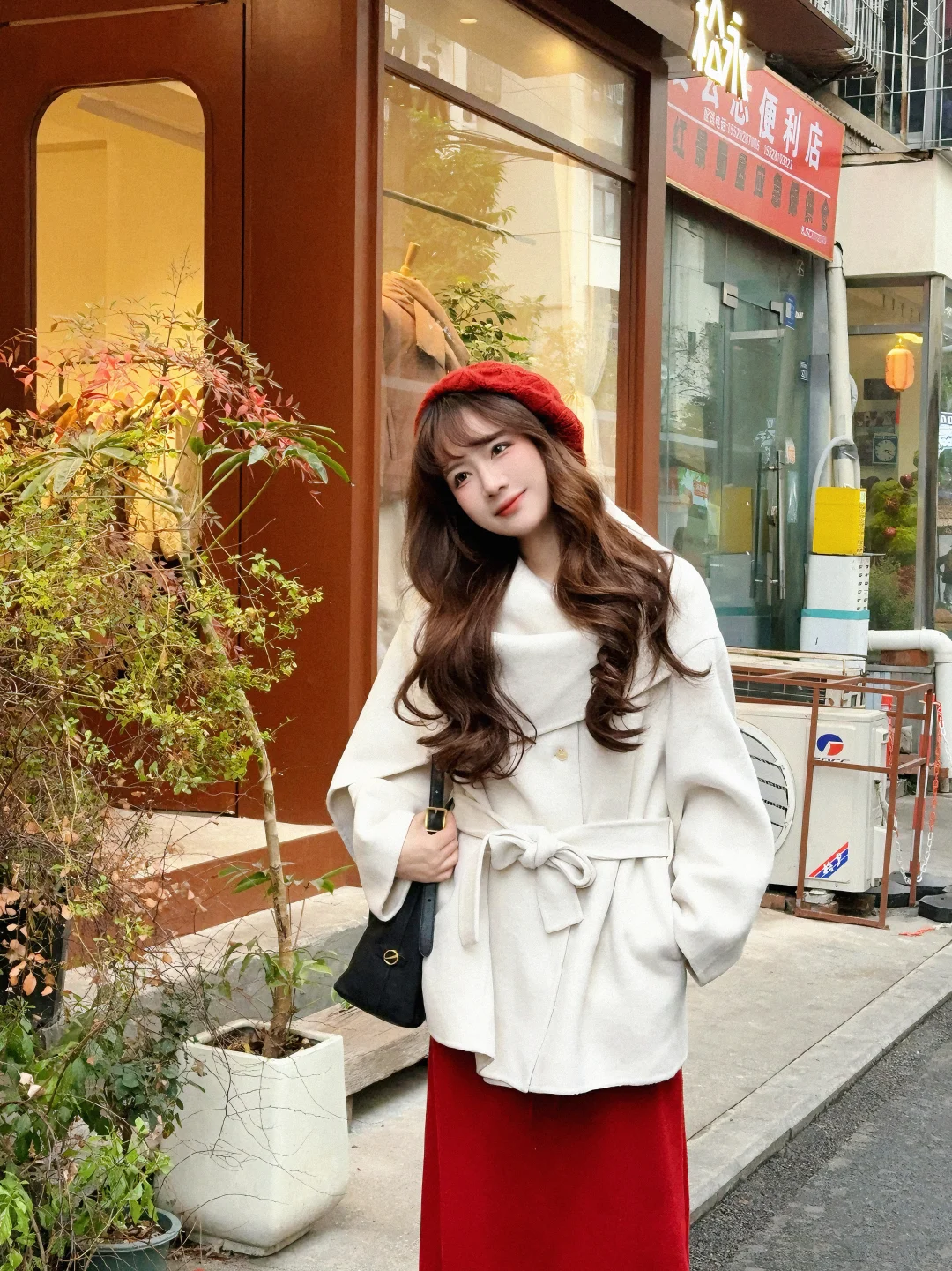 168/104左右 第一件围巾大衣 非常满意呀哈哈哈 没有选择常规搭配 搭配了一条红色半裙 很适合过年过节穿 非常有氛围感 (少面积的红色没有非常挑人 我一般新年穿搭都是考虑部分红色或者用红色配饰点亮整体) 围巾大衣的搭配思路 其实可以参考我之前出过白大衣搭配思路(差不多) 不过围巾大衣更适合光腿穿骑士靴(小个子很显比例) 还可以搭配一些有垂感的半裙(黑白灰棕红蓝之类的) 下摆也可以搭配丝绒针织质地的裙子 很显贵 除了红色 白色其实搭配很多亮色系都很出彩 比如蓝色粉色黄色绿色之类的 上下呼应即可 这套想要不出错 (觉得自己拿捏不住红色的) 把下装换成黑色裙子或者黑色拖地裤也可以的 帽子也考虑黑色或者白色 这样就是比较日常的大衣穿搭了 也是很有气质的一套 可以尝试一下~