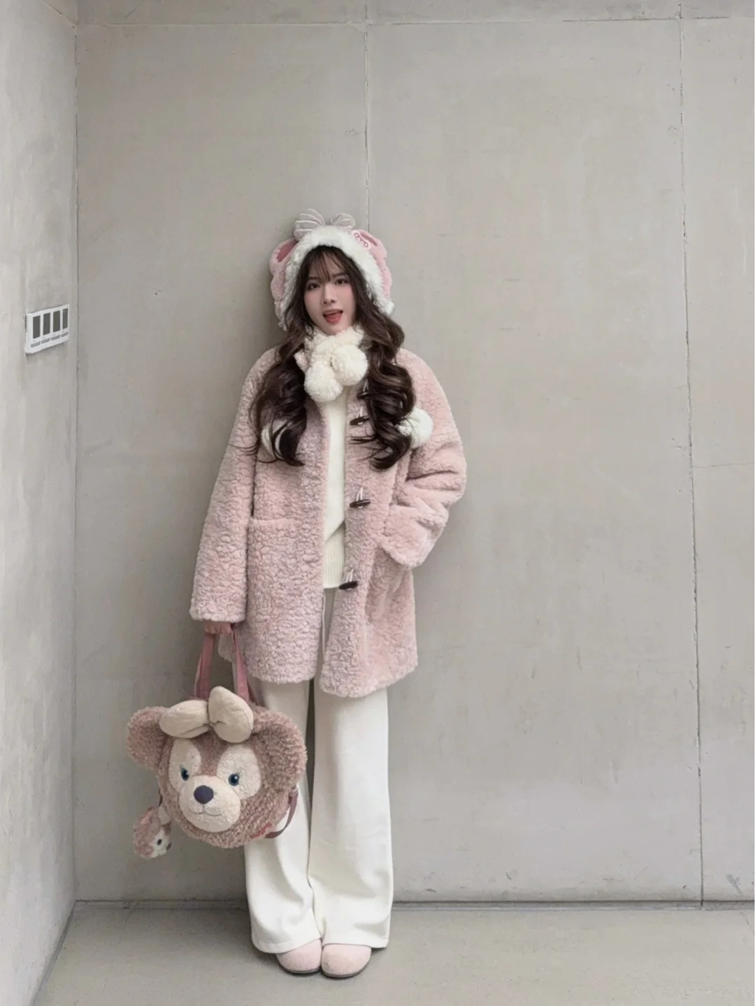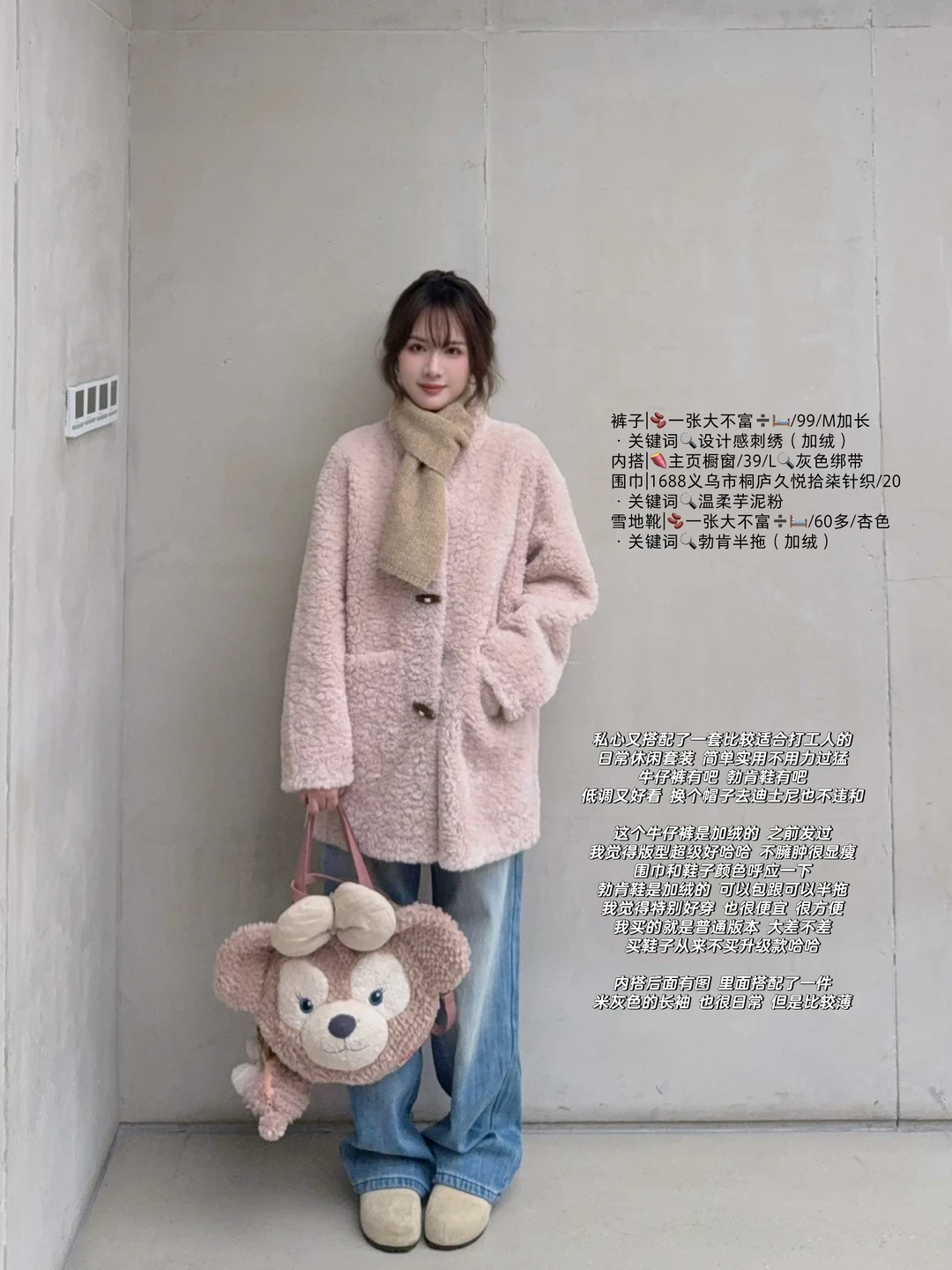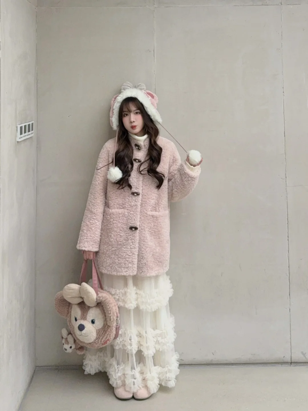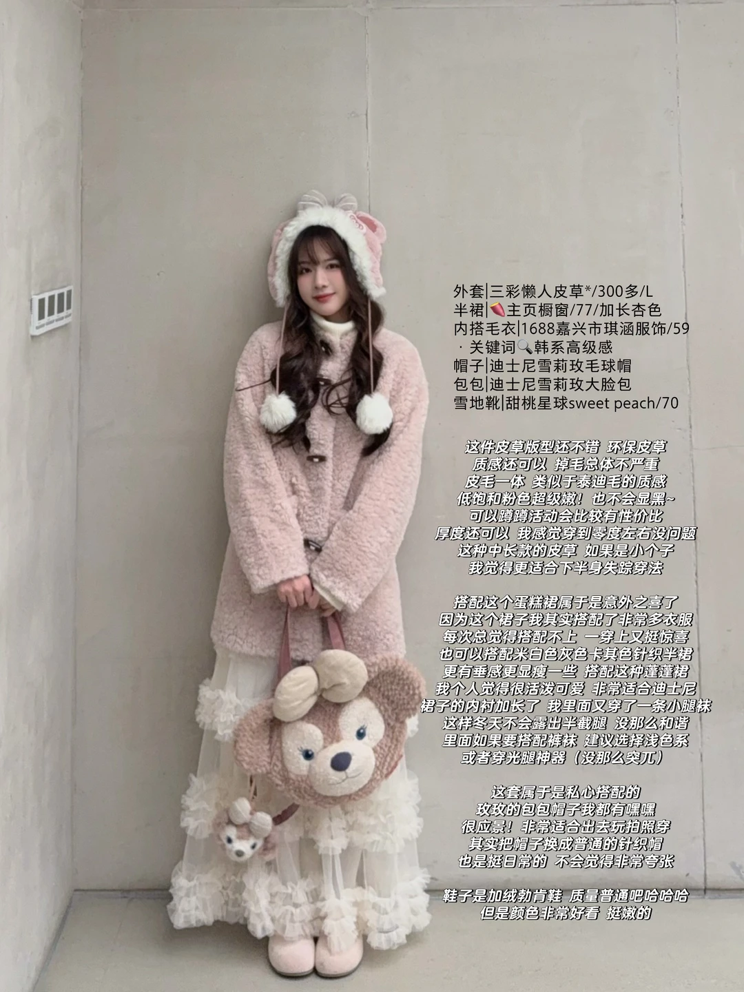 168/104左右 粉色皮草搭配思路呈上 搭配的过程中发现 太适合穿去迪士尼了 玫玫党狂喜哈哈哈哈 什么配件都备齐了 日常穿也完全ok 可日常可隆重的一款 主要是版型还不错 我个人觉得挺好看的 粉色皮草一般都考虑搭配白色蓝色 配饰可以考虑卡其色棕色灰色 都不会违和 个人是觉得嫩粉色搭配黑色有点太深了 一般除非没东西搭 都会考虑浅色系 更和谐 类似的粉色外套大家都可以这样参考哦 这个蓬蓬蛋糕裙真的穿回本了 后面还搭配了很多套 真的很喜欢 像一块小蛋糕🍰嘿嘿(〃'▽'〃)