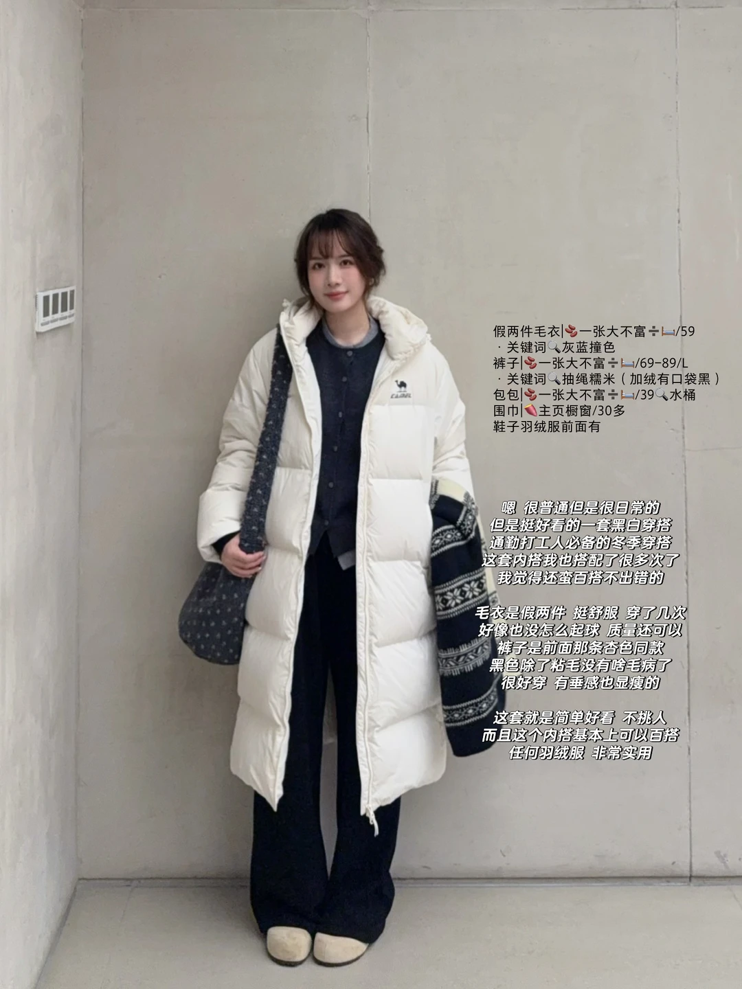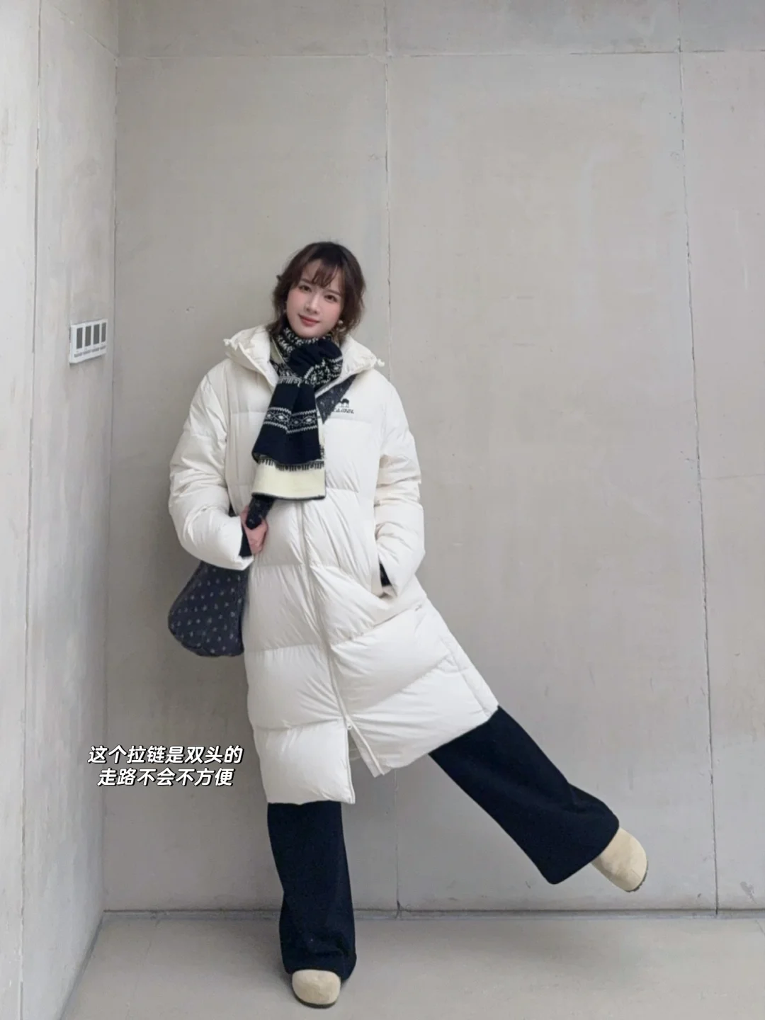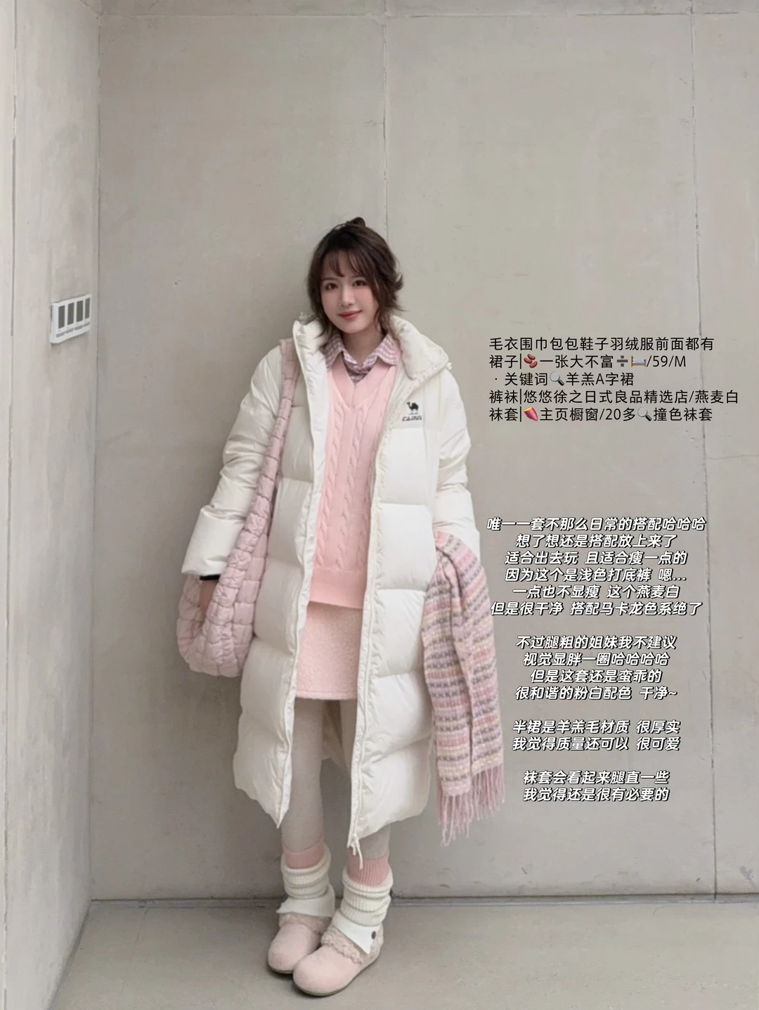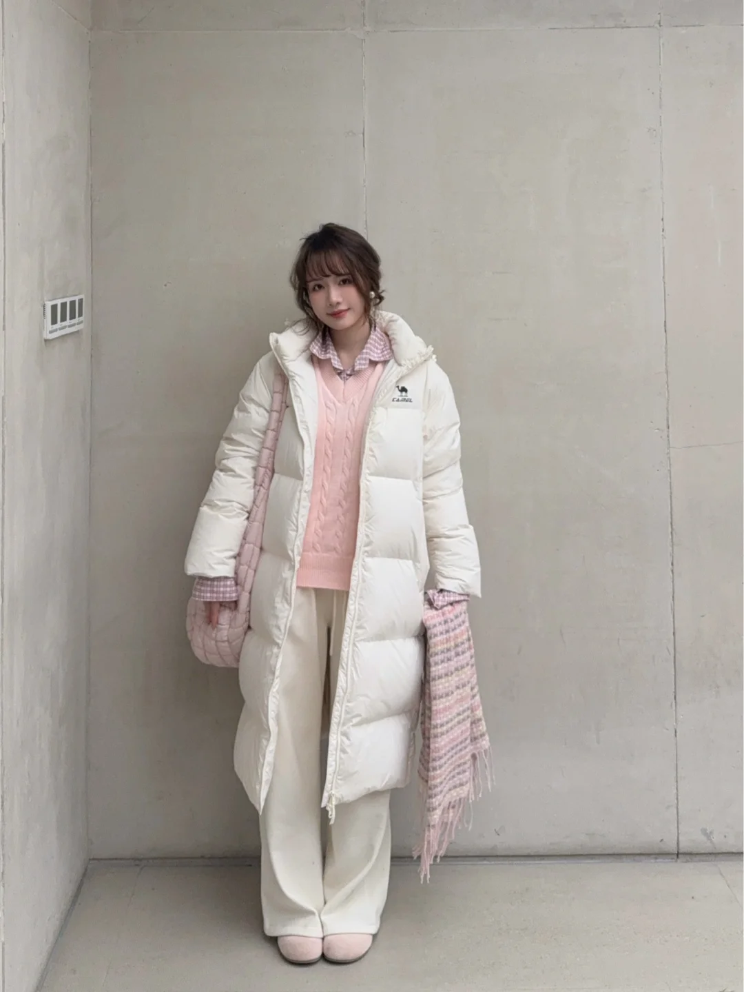 类似的白色米色羽绒服都可以这样搭配 短款白色羽绒服也是同理思路 都可以参考 配色思路是一样的