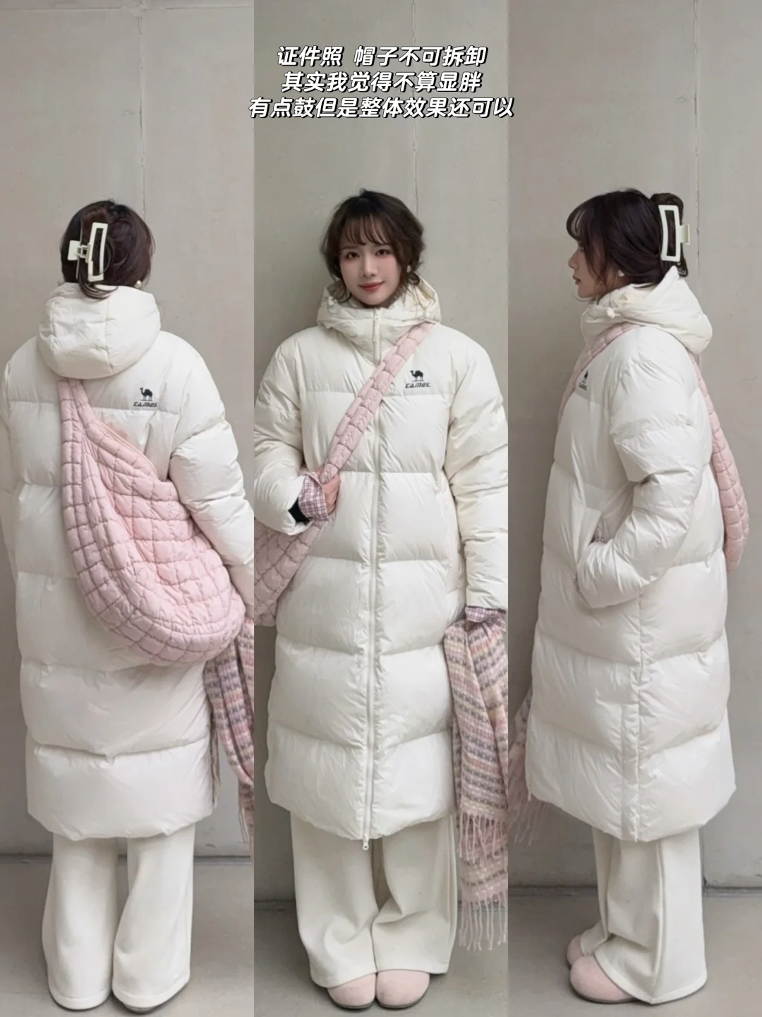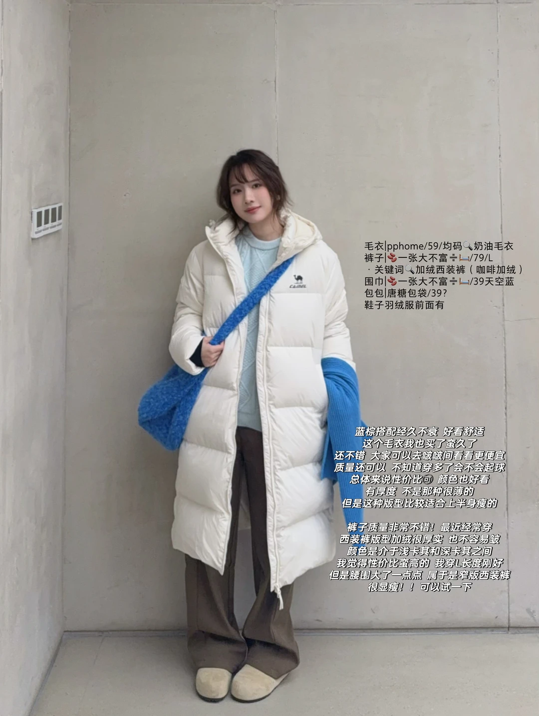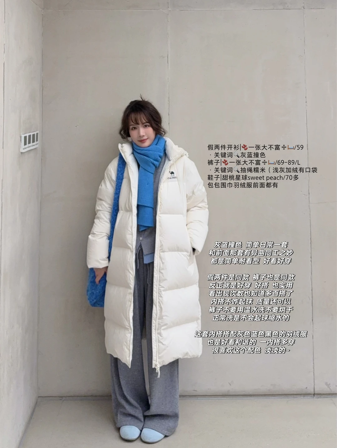 类似的白色米色羽绒服都可以这样搭配 短款白色羽绒服也是同理思路 都可以参考 配色思路是一样的