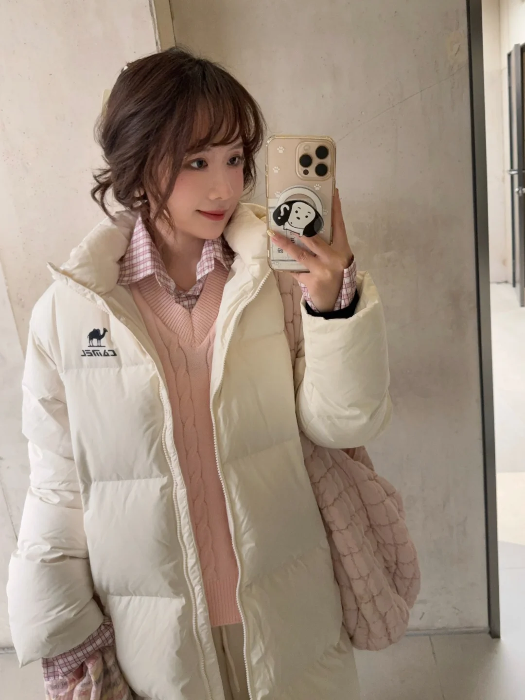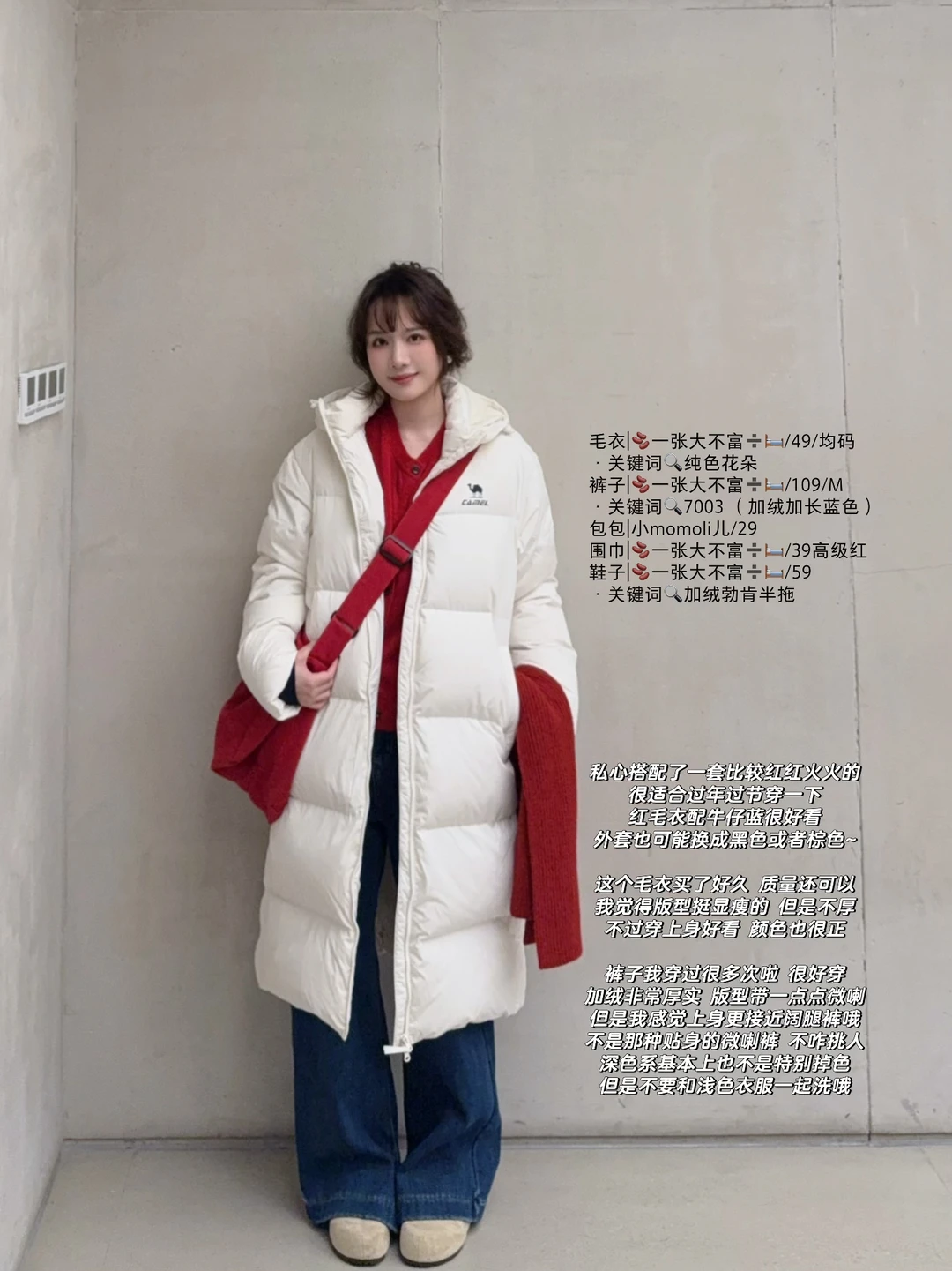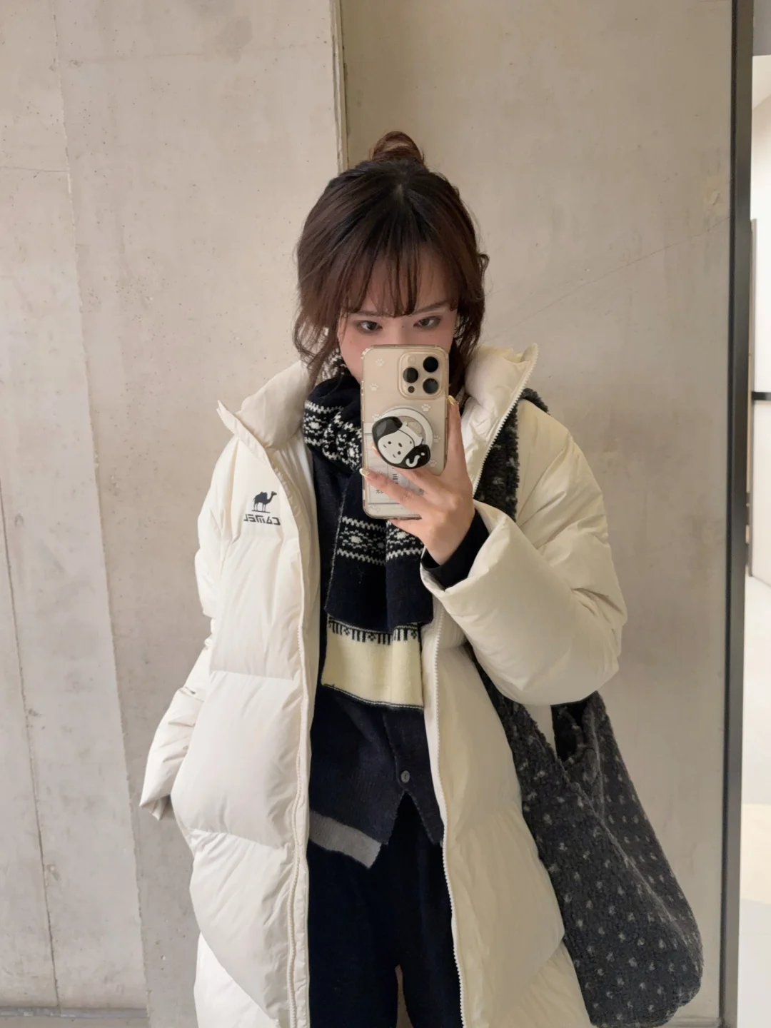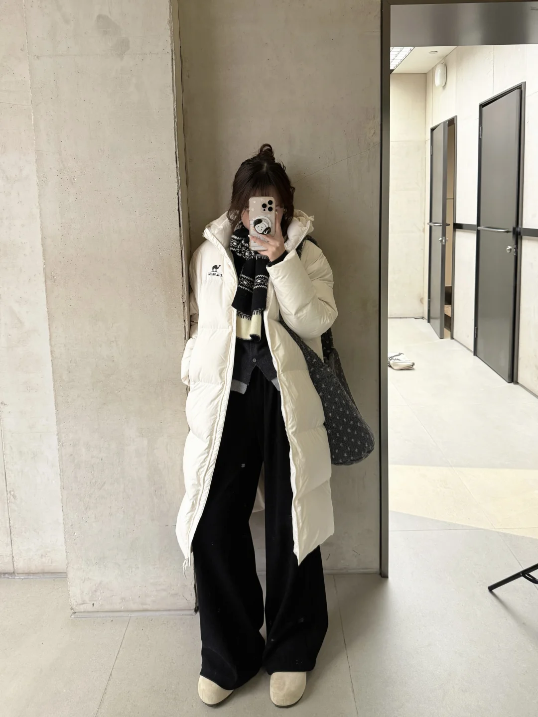 类似的白色米色羽绒服都可以这样搭配 短款白色羽绒服也是同理思路 都可以参考 配色思路是一样的