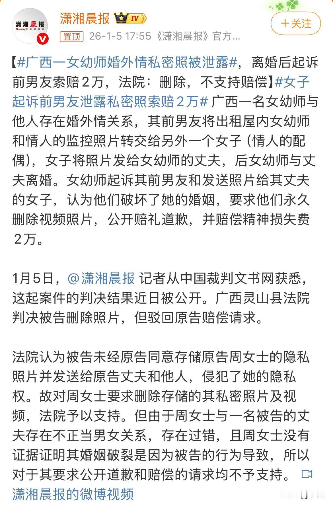 广西灵山县,一个看似平静的小城,一场始于数年前的感情纠葛,在2025年底迎来了一场官司。 故事的中心是一位周女士,她曾是一名幼儿园老师。2019年9月,她受雇于黄某和其丈夫林某某开办的幼儿园。然而,工作关系在2020年变了味,周女士与园长林某某发展成了婚外情关系。这段不正当关系一直持续,为了维系它,林某某在2020年至2024年间,多次向周女士转账。 周女士的生活里还有另一个男人,她的前男友张某。2023年7月,在两人还是情侣时,张某在周女士租住的房屋客厅里安装了一个家用摄像头,并添加了自己查看和录制的权限。关键在于,周女士称,张某并未告知她关于摄像头授权的这些事。一个月后,2023年8月,两人分手了。但分手后,张某并没有解除他对那个客厅摄像头的查看权限。那个无声的镜头,依旧悬在旧爱的生活之上。 纸终究包不住火。林某某的妻子黄某,察觉到了丈夫的异常。丈夫心不在焉,金钱往来说不清,女人的直觉让她心生寒意。她开始调查,最终将线索指向了丈夫幼儿园里曾经的那位女老师。 2024年12月,黄某做了一件决定事态走向的事。她通过微信,联系上了周女士的前男友张某。我们无从知晓他们对话的具体内容,但结果赤裸而冰冷:张某将摄像头拍下的、周女士在客厅的私密照片提供给了黄某。根据庭审信息,这些照片内容是周女士与林某某在客厅的画面,但并非裸照。 拿到“证据”的黄某,在2025年1月20日(或25日,不同报道略有出入),将这些照片发送给了周女士丈夫的微信。可以想象那个时刻——手机屏幕亮起,陌生的头像发来不堪入目的图片,自己的妻子与另一个男人……对一个丈夫而言,这是核爆级的打击。 婚姻的堤坝瞬间溃决。周女士与丈夫的婚姻关系随即破裂。与此同时,黄某也对自己丈夫的背叛采取了法律行动。早在2024年12月,她就起诉要求确认丈夫林某某赠与周女士钱财的行为无效。法院判决赠与合同无效,要求周女士返还八万四千余元给黄某。 2025年4月,周女士选择报警。派出所认定张某、黄某侵犯隐私权的违法事实成立,对二人各处五百元罚款。但这并未平息风波。周女士将前男友张某和情人妻子黄某一同告上法庭。 在起诉状中,周女士的描述充满痛苦:“张某未经允许私自设置其个人对摄像头查看、录制监控内容的授权,已然形成对原告私密空间、私密部位的刺探与窥视。” 她更指控张某将截图交给黄某,是为了“达成破坏原告家庭之目的”。 她描述自己的精神状态:“整天精神恍惚、寝食难安、抑郁失眠”,并恐惧这些私密影像已被传播给更多人,甚至可能流上色情网络平台。她要求法院判决二被告立即删除所有私密照片和视频,在朋友圈公开道歉15天,并赔偿精神损害抚慰金2万元。 被告席上的两人,给出了他们的说法。 前男友张某辩称,自己查看监控有权限,因为那出租屋是他承租的。这个理由试图将监控行为合理化。 而黄某的辩词则更直接地指向了周女士的软肋。她说,自己把照片转发给周女士的丈夫,“目的是核实她与黄某丈夫出轨的事实,没有其他恶意”。在她看来,自己只是将一个残酷的真相,递给了最有权利知道的人。 广西灵山县人民法院的法官审理了这起错综复杂的案件。 法院首先确认了一个基本事实:隐私权受法律保护。张某未经同意存储并转发私密照片,黄某进一步传播,这些行为确实构成了对周女士隐私权的侵犯。因此,法院支持了周女士要求删除相关私密照片和视频的诉求。 然而,判决的转折点在于“过错”二字。 法院明确指出,周女士与被告黄某的丈夫林某某存在不正当男女关系,“对于本案的发生存在过错”。更重要的是,法院认为,周女士提供的证据不足以证明她的婚姻破裂完全是张某和黄某的行为导致的。 基于这两点,法院做出了一个看似矛盾却意味深长的判决:支持删除照片,但驳回了周女士要求公开赔礼道歉和赔偿2万元精神损失费的诉讼请求。 一纸判决,为这场闹剧画上了法律的句号,却抹不去它留下的满地狼藉。 周女士失去了婚姻,背负社会议论,虽然在隐私权上得到了部分支持,但她的过错被法律记录在案,赔偿诉求也被驳回。 黄某用极端手段揭露了丈夫的背叛,虽在“核实事实”的目的上得到法庭一定程度的考量,但其行为越过了法律边界,被认定为侵权并受了处罚。她赢回了丈夫赠出的钱财,但破碎的夫妻感情如何计算? 至于张某,那个安装摄像头的前男友,其行为动机成谜。是余情未了?是因爱生恨?还是单纯出于某种复杂的利益交换?他的行为最终被法律判定为侵权。 而整个风波中最沉默的两个男人——周女士的丈夫和林某某,他们所承受的背叛与耻辱,他们的家庭所经历的震荡,又该如何平息? 法律保护每个人的隐私权不受侵犯,无论其道德是否完美。但法律同样不会鼓励或完全补偿那些因自身过错而将自己置于风险之中,最终引火焚身的人。
