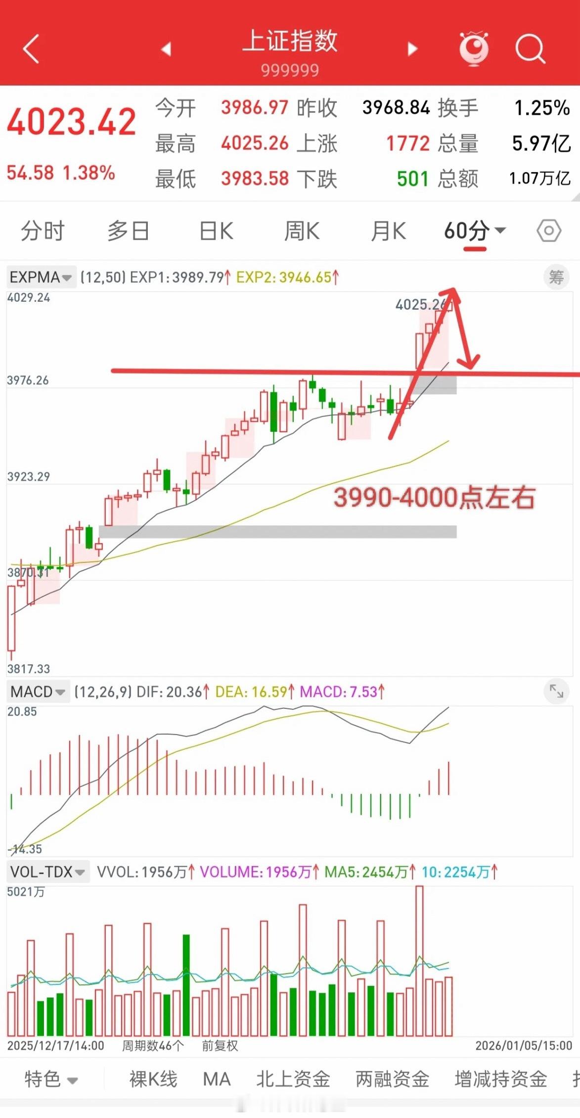 受美股大涨带动,中国核心资产今日全线走高,A股市场亦同步回暖。操作思路与昨日保持一致:当行情逼近前高4034点,甚至实现突破时,都应将其视为减仓时机而非买点。投资者可保留底仓博弈后续冲高空间,但切忌在前高附近盲目追涨。真正的二次上车或加仓窗口,需等待行情回踩颈线位3936点支撑区域,以及日线级别EXPMA白线3950点附近,但从短期走势判断,行情大概率不会下探至该区间。今日可重点关注60分钟级别均线支撑:5日线4005点附近、10日线3985点附近;上方压力则聚焦于4034-4050点区间。整体来看,市场行情会存在反复震荡,不会呈现单边拉升的态势。