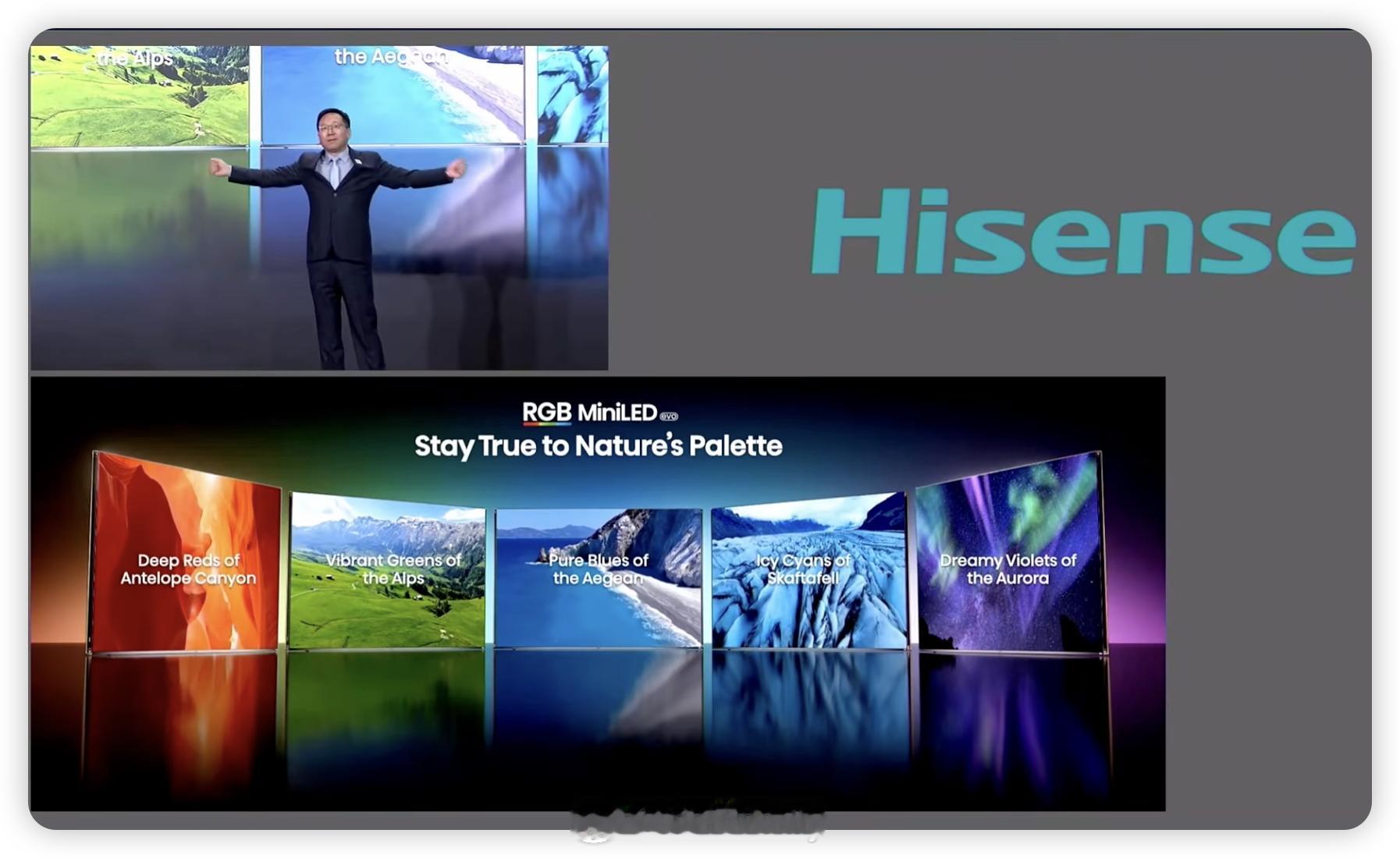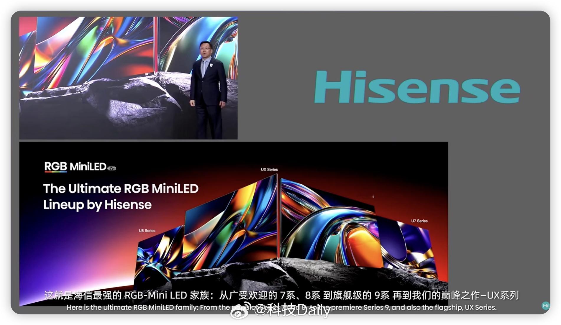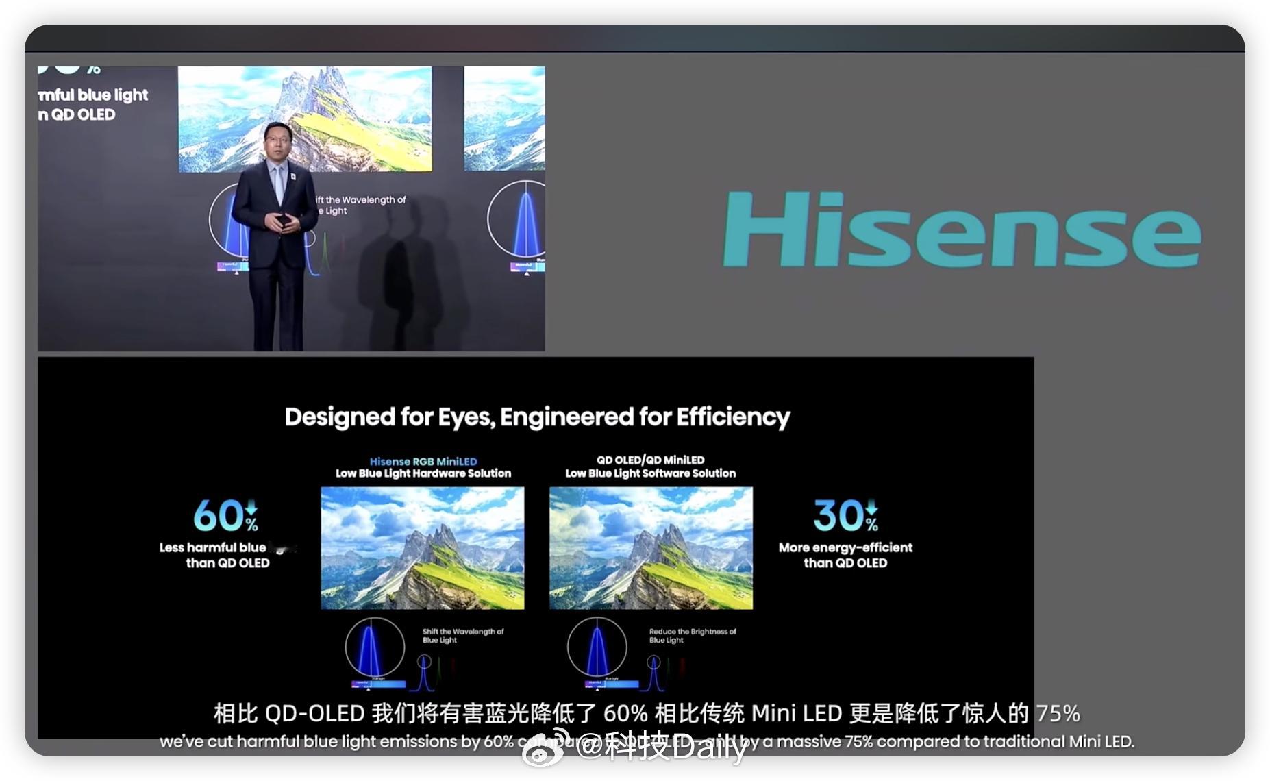 海信CES显示技术发布会。RGB-Mini LED,除了色彩正,还能更护眼!相比 QD-OLED 有害蓝光降低了60%相比传统 Mini LED降低 75%。同时这套技术也是节能标杆,能效提升30%,给足了我们消费者选择,升级的理由。显而易见的优势,全球影游爱好者都必须升级。全新一代RGB-Mini LED,海信持续引领定义!重点:UX是全球首款搭载 RGB-Mini LED evo 的电视,预计今年3月正式上市。