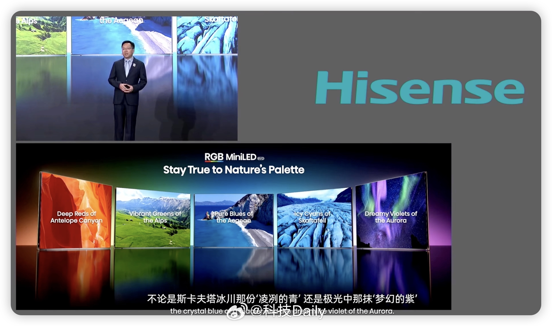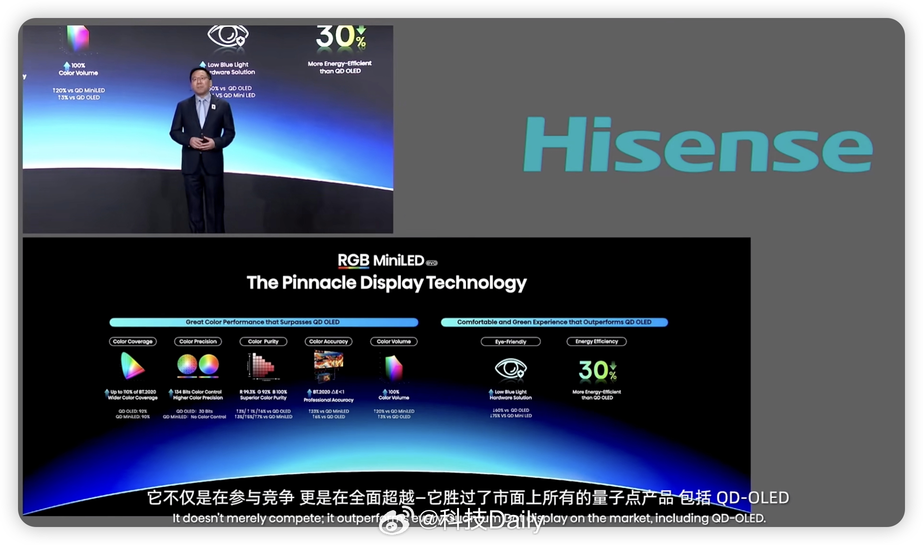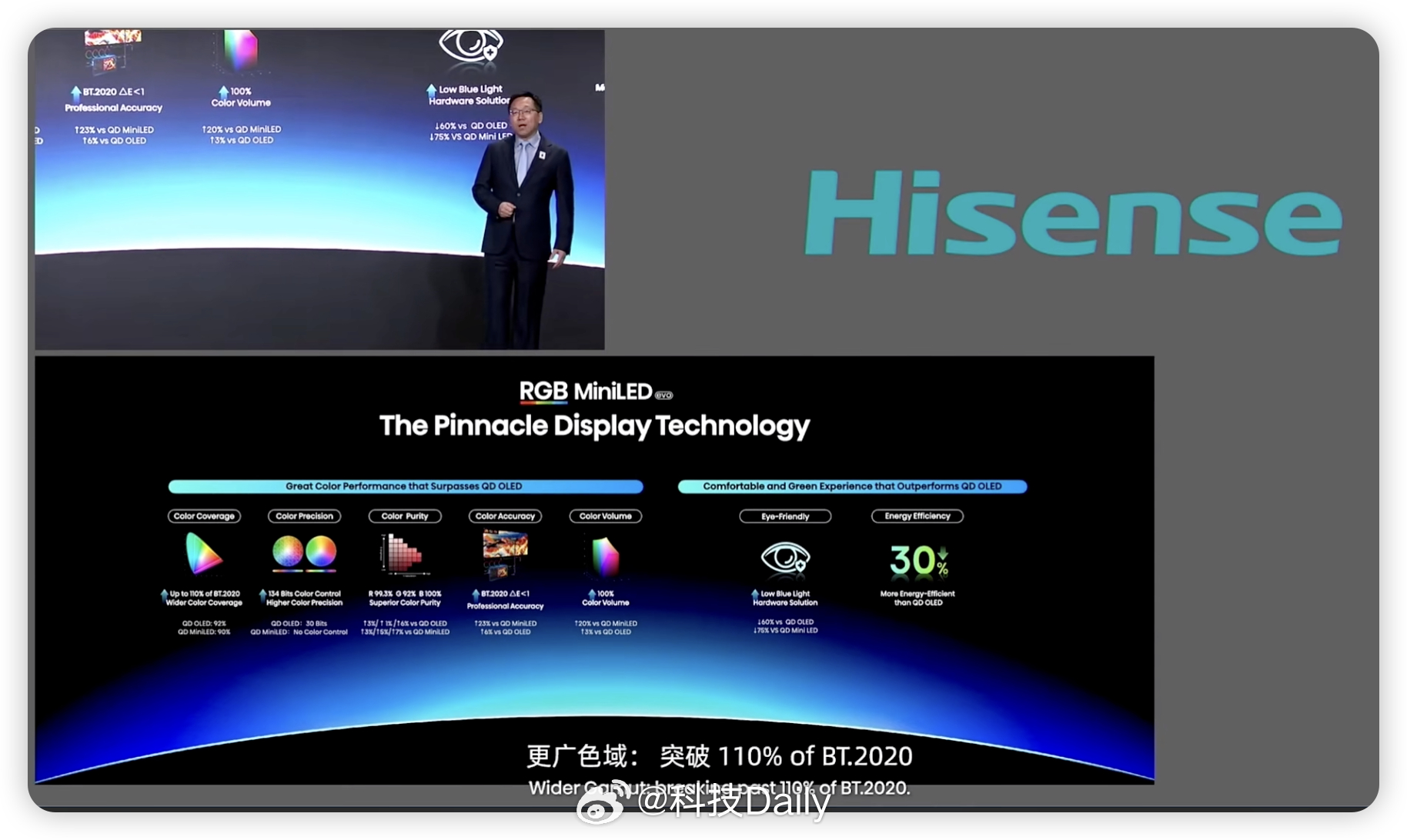 海信CES显示技术发布会。RGB-Mini LED,除了色彩正,还能更护眼!相比 QD-OLED 有害蓝光降低了60%相比传统 Mini LED降低 75%。同时这套技术也是节能标杆,能效提升30%,给足了我们消费者选择,升级的理由。显而易见的优势,全球影游爱好者都必须升级。全新一代RGB-Mini LED,海信持续引领定义!重点:UX是全球首款搭载 RGB-Mini LED evo 的电视,预计今年3月正式上市。