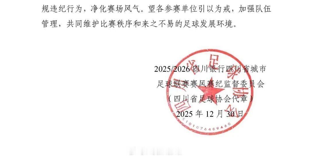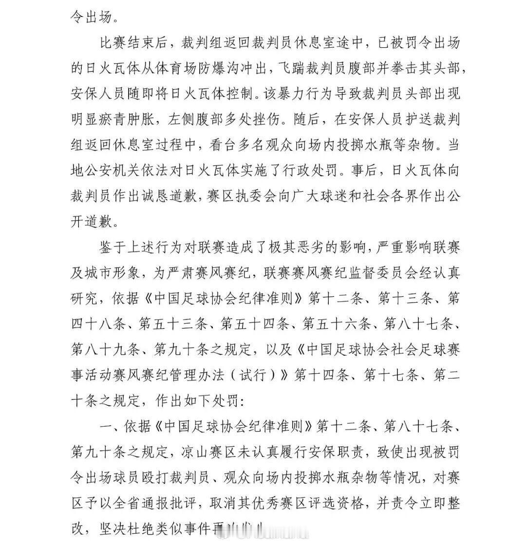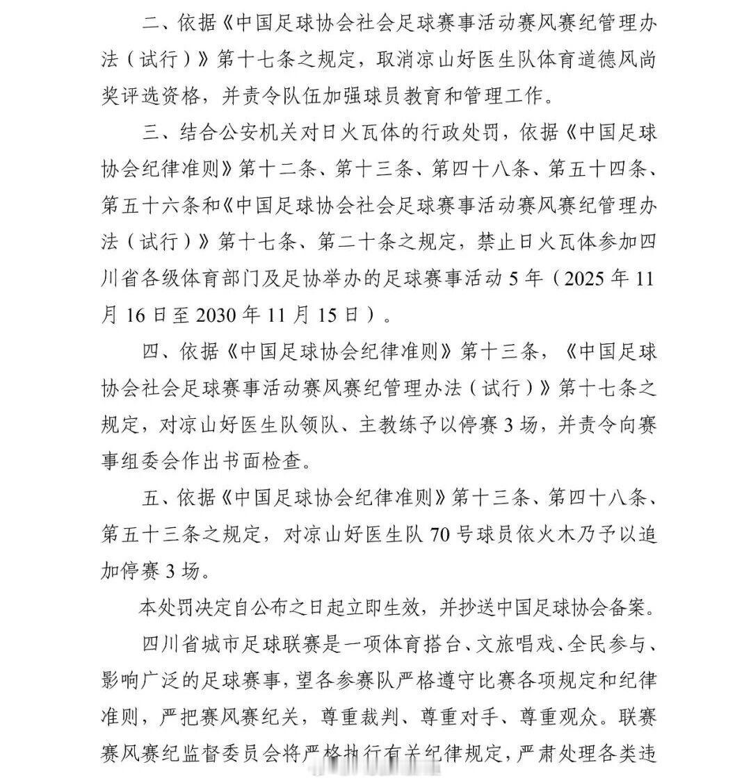 四川省足协今日对外公布了11月15日川超比赛凉山队和对裁判实施暴力行为致使裁判受伤的凉山队球员日火瓦体的纪律处罚决定,决定落款时间为12月30日。其中日火瓦体被禁赛5年,在四川省足协管辖范围内生效,并将抄送中国足协备案。按赛风赛纪相关规定,类似严重违纪行为通常会扩大到全国范围内所有比赛执行。