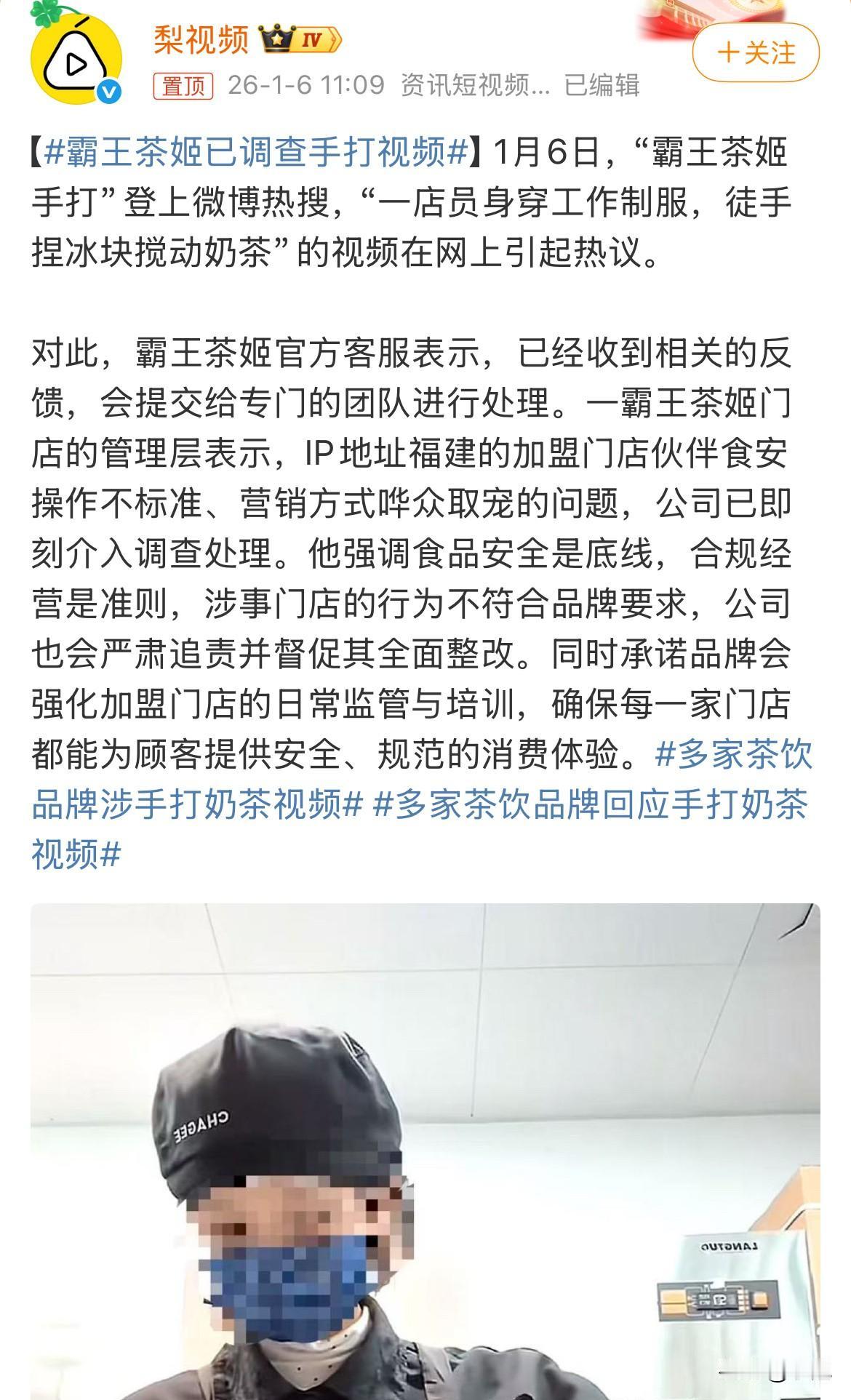 霸王茶姬又上热搜了,这次不是因为新品,而是一段让人看了心里发毛的短视频。 视频里,一个穿着霸王茶姬工作服的员工,没戴手套,直接用手在操作台上捏柠檬片。这还不算完,她接着把手伸进一个奶茶杯里,徒手搅拌起来,动作看起来很熟练。整个画面冲击力很强,和平时店里用工具制作的印象反差太大了。 视频一出来,网友瞬间就炸了锅。很多人直呼“恶心”、“再也不敢喝了”。大家的反应非常一致:这完全突破了消费者对现制饮品卫生底线的基本想象。毕竟,谁愿意喝可能混着别人手汗和看不见细菌的奶茶呢? 就在争议沸沸扬扬的时候,视频发布者,也就是当事人出来解释了。她的说法是,这只是“玩梗”和娱乐模仿。她强调视频是在门店打烊后拍摄的,用的是当天要报废处理的材料,而且自己拍摄前洗过手。 她给视频打上的标签也是“娱乐”,模仿的是“印度奶茶”的风格,本意并非展示真实操作。 不过,这个解释并没能完全平息质疑。有网友翻出了矛盾的说法,指出当事人曾在评论里回复说拍摄时间是“9点未打烊”。这种前后不一,让整个“娱乐摆拍”的说法显得有点站不住脚。 大家质疑的核心变成了:就算材料是报废的,时间是在下班后,穿着代表品牌的工服,在操作区做这样明显违规的动作,真的合适吗? 很多网友认为,这是在拿食品安全这个话题博取流量。 面对汹涌的舆论,霸王茶姬官方迅速作出了回应。客服表示公司“非常重视”,已经详细记录并反馈给相关部门核实。有门店管理层明确指出,这是福建一家加盟店员工的个人行为,公司已介入调查。 官方的定调是:这是个别员工在非营业时段,使用报废材料进行的、不符合规范的娱乐行为,绝非标准操作流程。 霸王茶姬方面强调,所有饮品在正式制作时,必须使用专用工具,严禁徒手接触原料,门店有严格的日常消毒和清洁流程,并有区域督导定期巡查。换句话说,品牌方试图划清一条清晰的界限:视频里的行为是“错误示范”,而不是“日常操作”。 那么,一家正规的现制茶饮店,日常的食品安全规范到底应该是怎样的呢?我们可以参考一下行业里其他品牌公开的标准。例如,有的品牌会要求员工上岗前用“七步洗手法”仔细洗手,消毒水浓度要精准配比,原料有严格的效期管理,甚至操作过程会通过摄像头同步上传云端接受监督。 整个流程从清晨备料到深夜闭店,都有明确的规定,比如未用完的鲜果必须报废并拍照留痕,确保“鲜果不过夜”。对比之下,那段“手打”视频中的操作,与这些成体系的规范显得格格不入。 现在,这件事就摆在这里。 一方是感到被冒犯、觉得卫生底线被触碰的广大消费者。 另一方是坚称这只是“玩梗失误”的员工和强调此为偶发个案、已启动调查的品牌方。 这究竟是一次被无限放大的“小题大做”,还是暴露了即便在非营业时间也绝不应被模糊的“食品安全”红线? 每个人心里,可能都有自己的那杆秤。