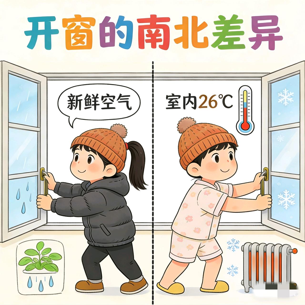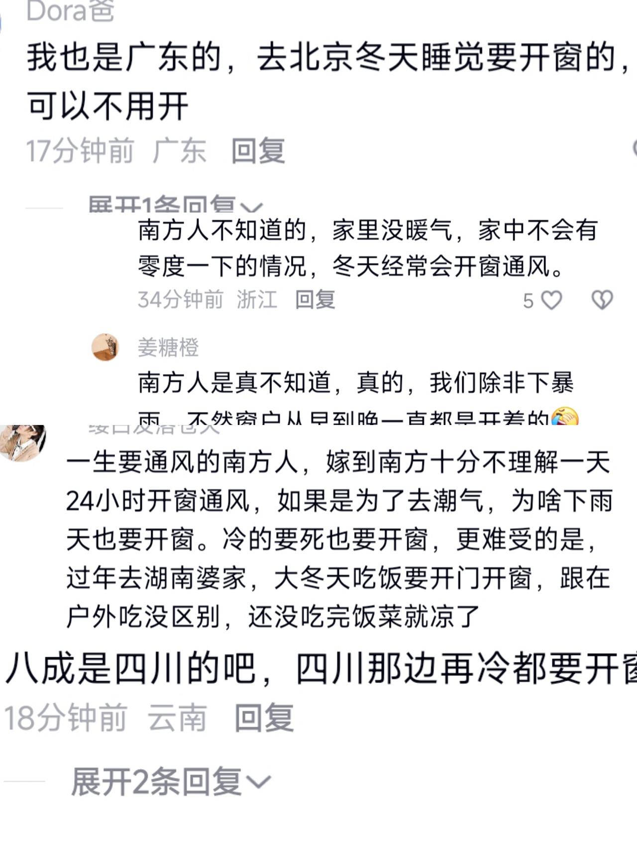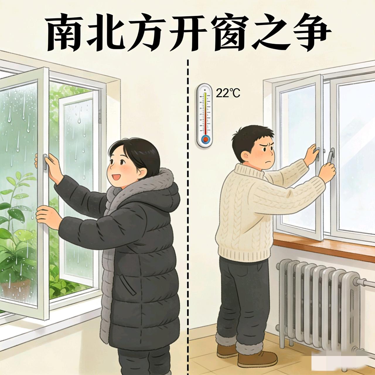 南方北方又开始对账了吗?差异又来了! 这次居然是因为南方游客开窗把东北地暖冻坏这事,我一个北方人太能理解了,东北室外零下几十度,开窗不得把水管都冻裂啊! 但刷评论看到好多南方朋友说,冬天家里还得开窗,我直接看懵了! 现在我住湖北,这冬天冷得我裹着羽绒服,都不想出被窝,窗户从入冬就没开过,实在想不通南方没地暖还开窗,难道真的不冷吗?哈哈…反正我怕冷,我不开! 南方比北方更冷 供暖差异 南方北方能结冰