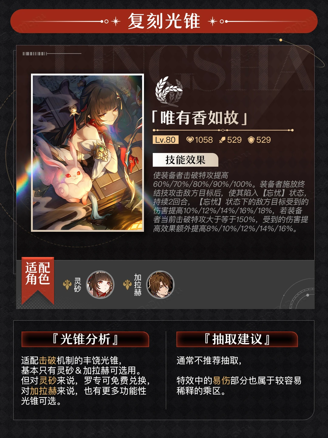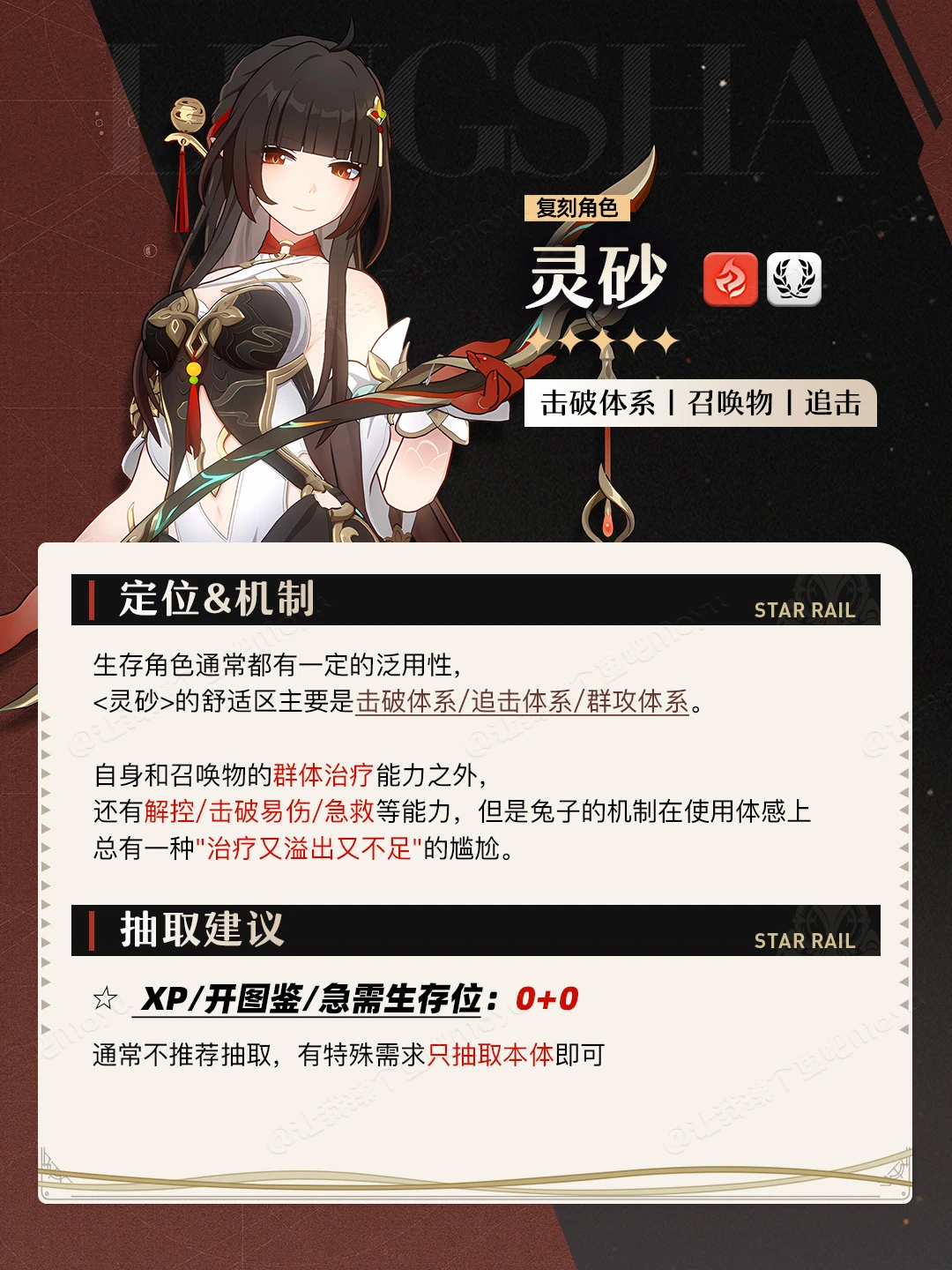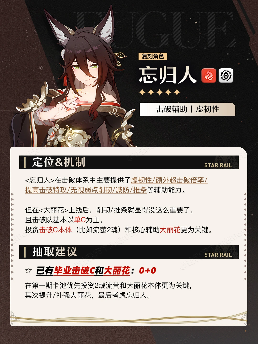 将将!摸鱼驾到!(。•̀ᴗ-)✧ 3.8第二期卡池马上要来啦,继续击破体系! 剩余的2名击破角色将一起上线——『忘归人&灵砂』的抽取建议! 文中包含了配队配装/角色光锥等关键信息! 🔘创作不易,严禁任何商业性转载及搬运 🔘制作难免会有错漏,希望大家多多指出 🔘祝大家都能十连双金!