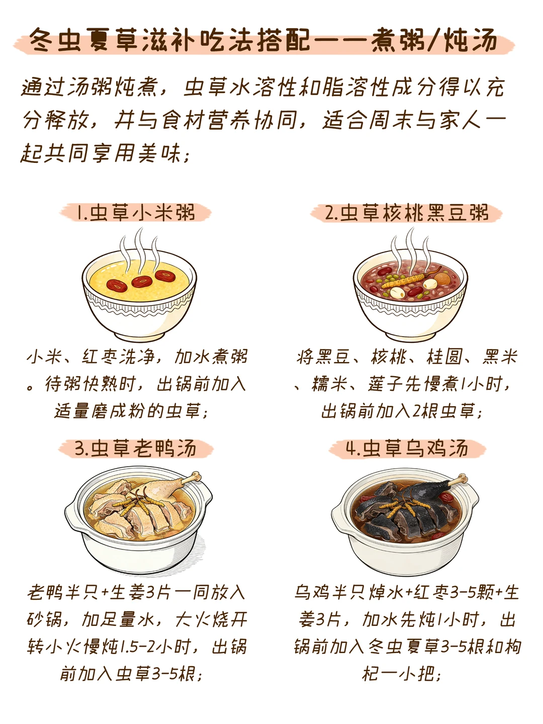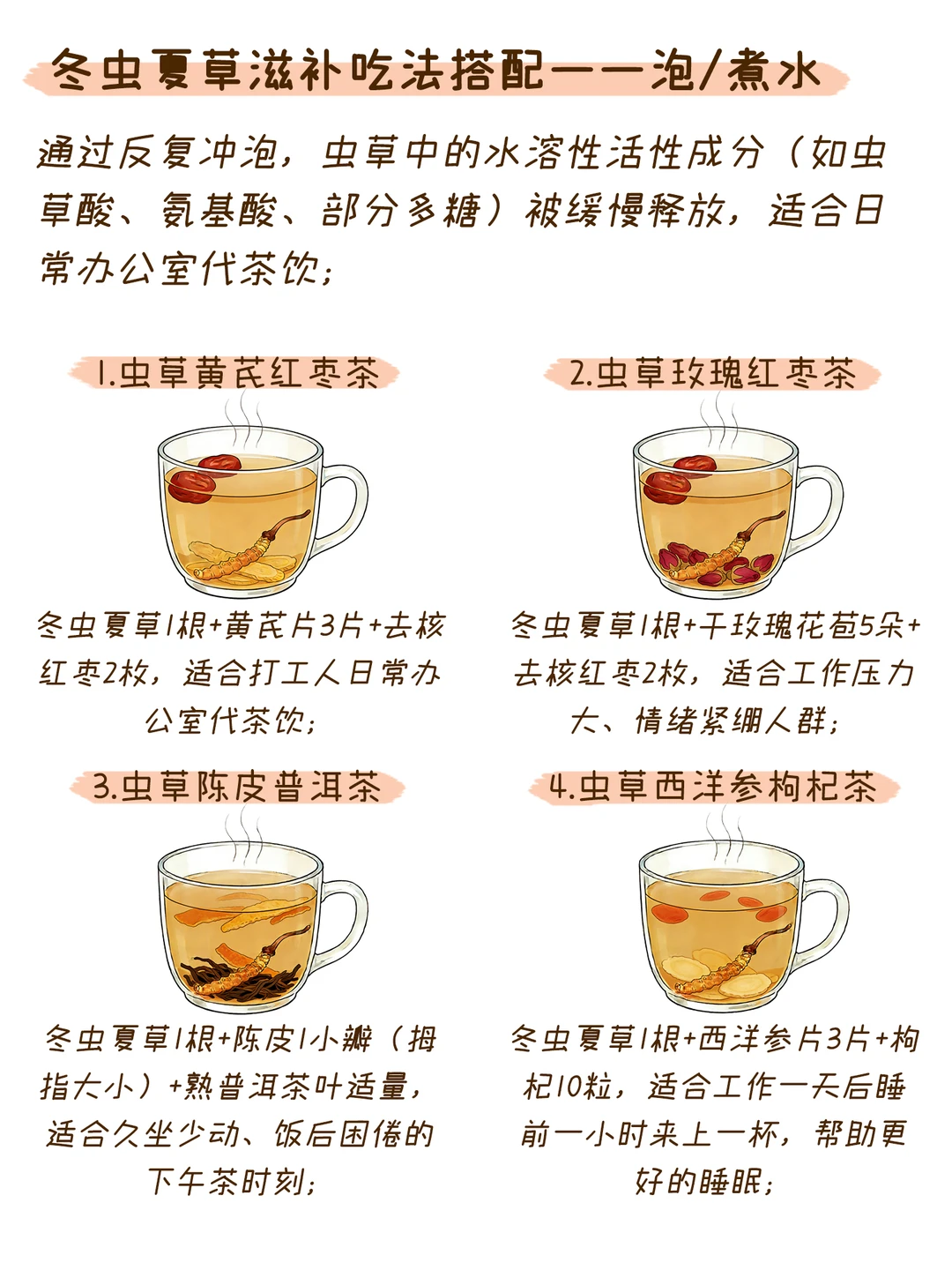 将1-2根虫草用45℃的热水(非沸水)冲泡,盖上盖子闷15分钟以上再饮用;