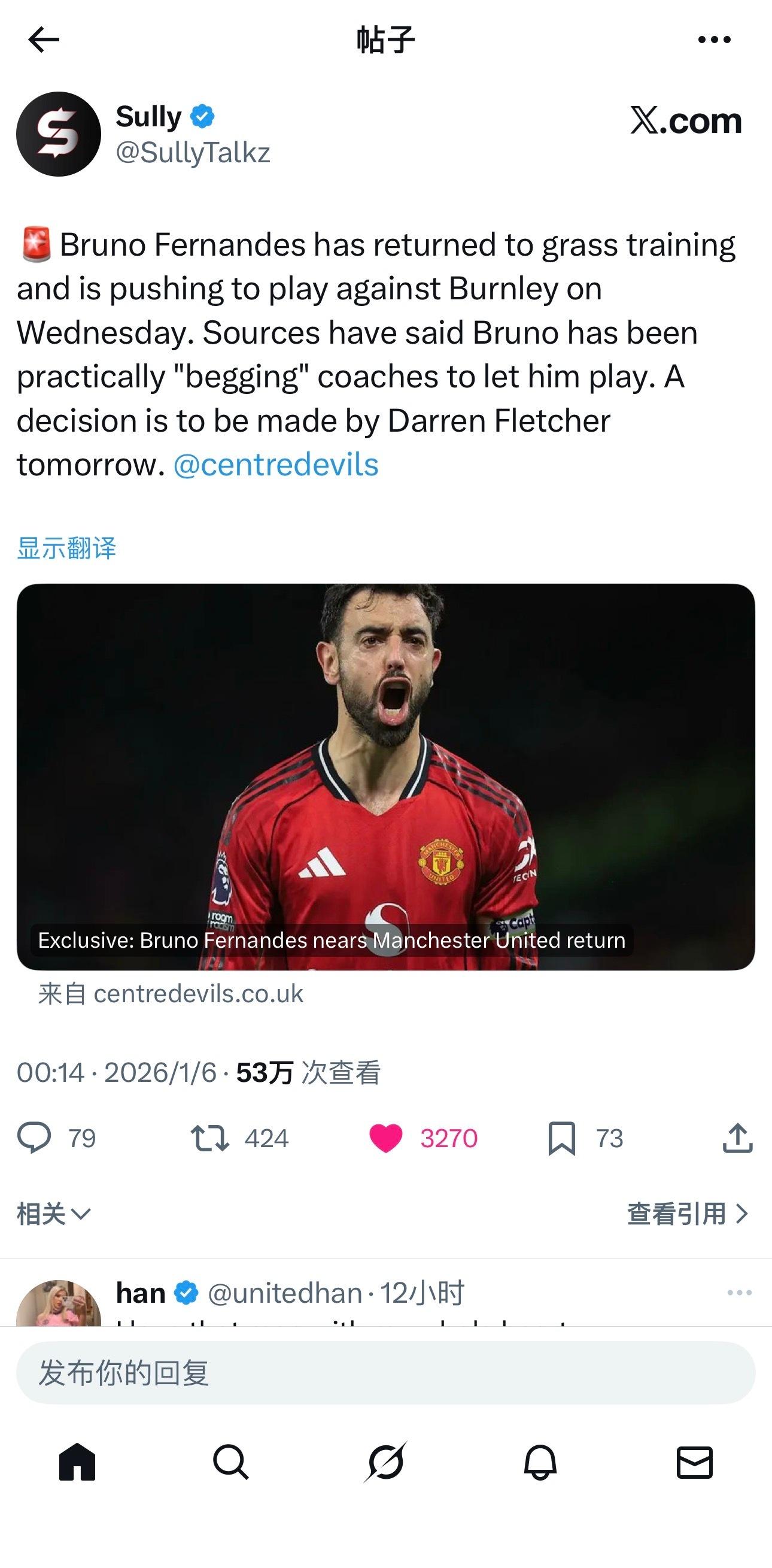Sully:🚨布鲁诺·费尔南德斯已恢复草地训练,正努力争取在周三对阵伯恩利的比赛中上场。消息人士透露,布鲁诺几乎是在"恳求"教练组允许他出场。达伦·弗莱彻将于明天做出最终决定。