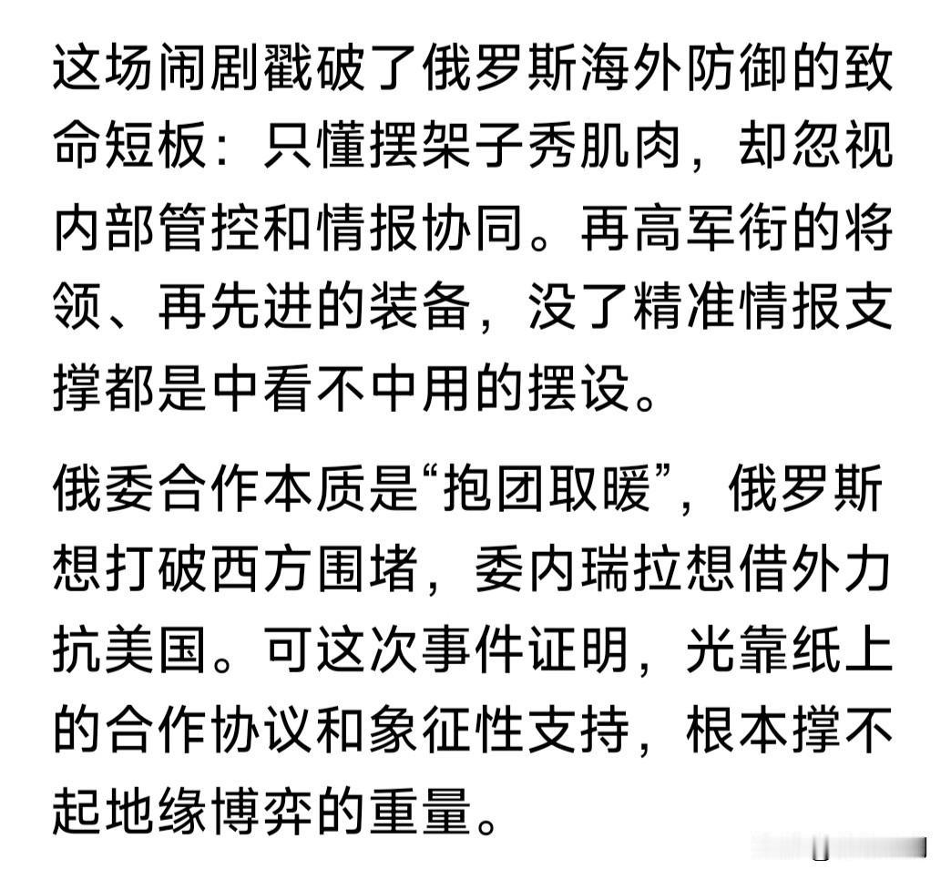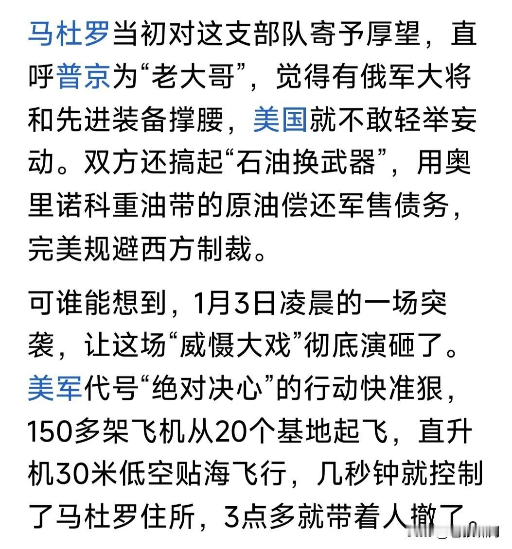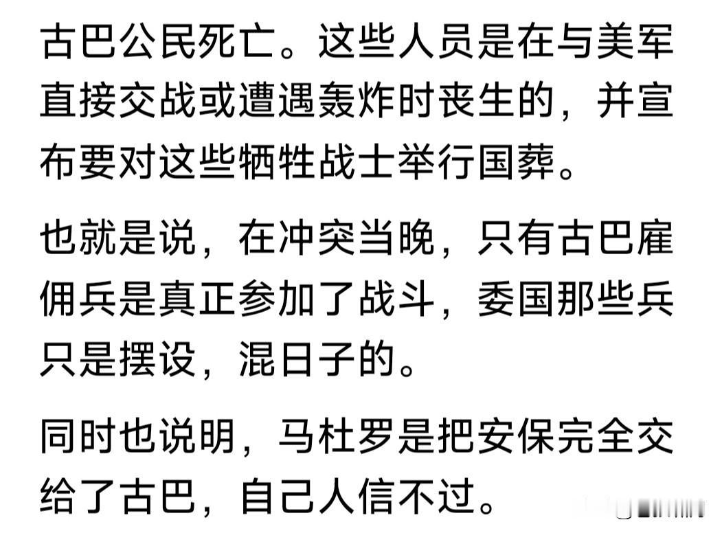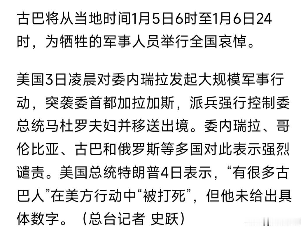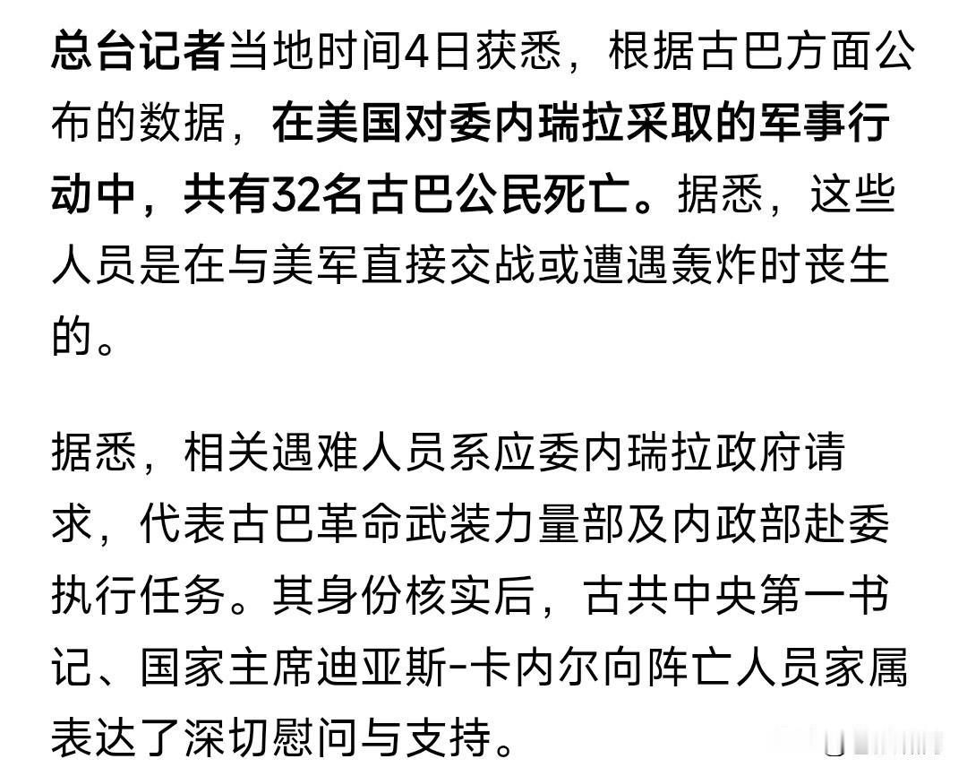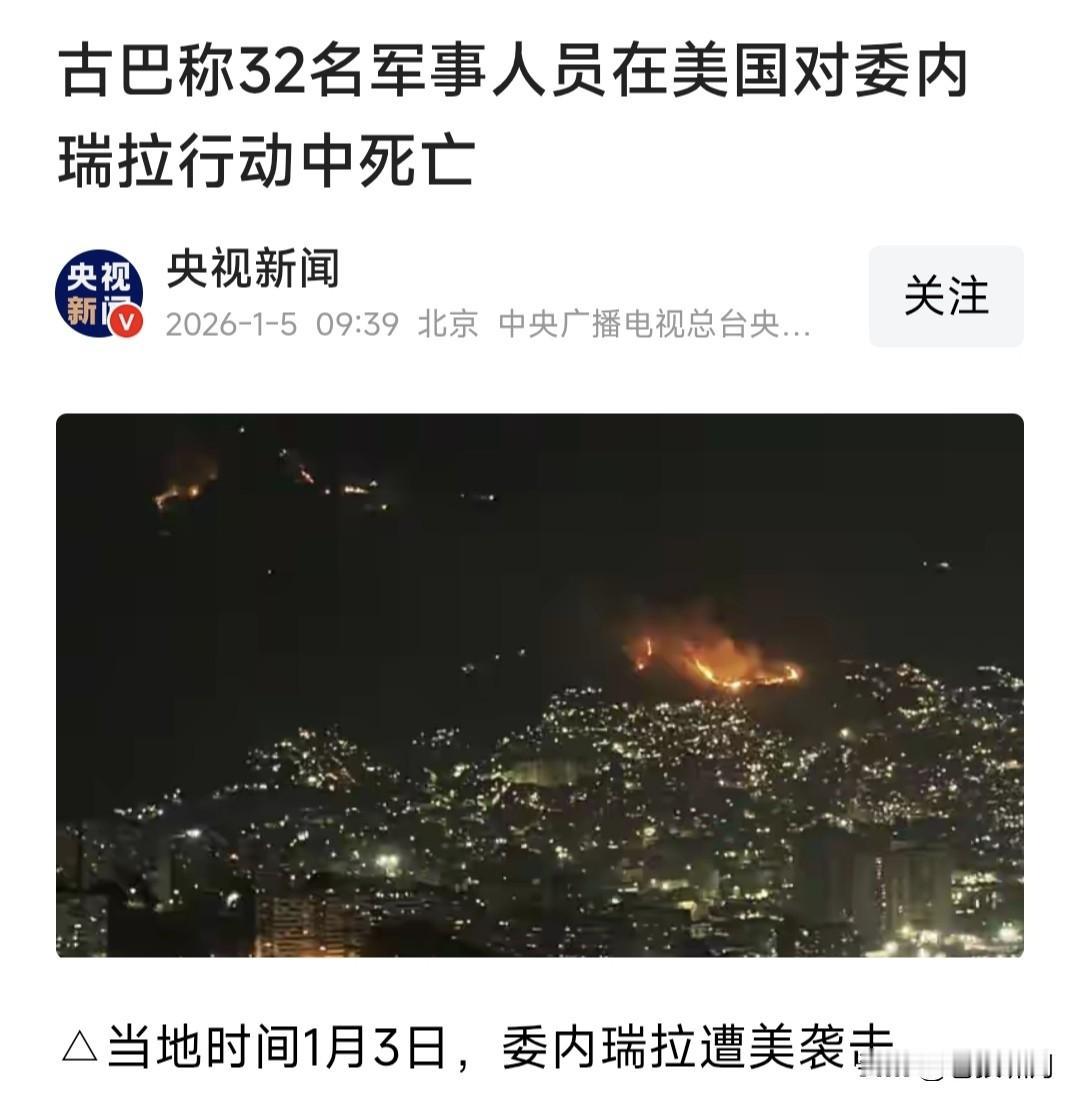央视报道:古巴32名军事人员,在美委冲突中阵亡!古巴高层亲切慰问阵亡者家属,并将为他们举行国葬! 另据消息:这次美委冲突,委方共有40名军人阵亡。其中古巴就有32名,说明当晚美军轰炸与抓捕行动中,古巴军人是坚决抗击美军的主要力量! 不禁令人疑惑:委内瑞拉不是有几十万军队吗?他们都在做什么呢?古巴军人是在哪里阵亡的?是否发生在美军抓捕马杜罗时,抵抗美军而阵亡? 还有委方证实:俄在委驻有120人军事顾问,负责训练委军使用俄供装备。这些装备包括S-300防空系统,铠甲-S1弹炮合一发射装置,5000枚防空导弹。 还负责训练委军使用EPV无人机,应对特种作战,提供情报信号支持,升级防空网络一揽子军事计划。并确定“以石油换武器”交易方案,真是具体周全。 以上准备足够充实,为何会让美军偷袭成功了呢?网络媒体分析原因如下: 1.美军选择凌晨突袭,委军都在睡眠之中猝不及防。空军轰炸造成混乱,特种部队趁机偷袭已查明的马杜罗住所。 2.马杜罗的保卫部队,绝不仅有32名古巴军人!他们可能是内卫安保人员,外围肯定有保卫部队。这些人在干啥? 3.可能美军逼近马杜罗住处才被发现,古巴警卫开始抵抗!但当时停电一片黑暗,美军枪支有夜视仪,而对方没有,盲人摸象全部阵亡,美军毫发无损? 4.至于俄系防空系统,雷达监视系统,弹炮发射系统,为何都无反应,让美军轻易得逞?是停电所致?还是美军电子压制?或者俄系装备好看不管用呢? 不管什么原因,这次美委冲突,都给世界敲响了警钟,应该引起各国警惕了! …………