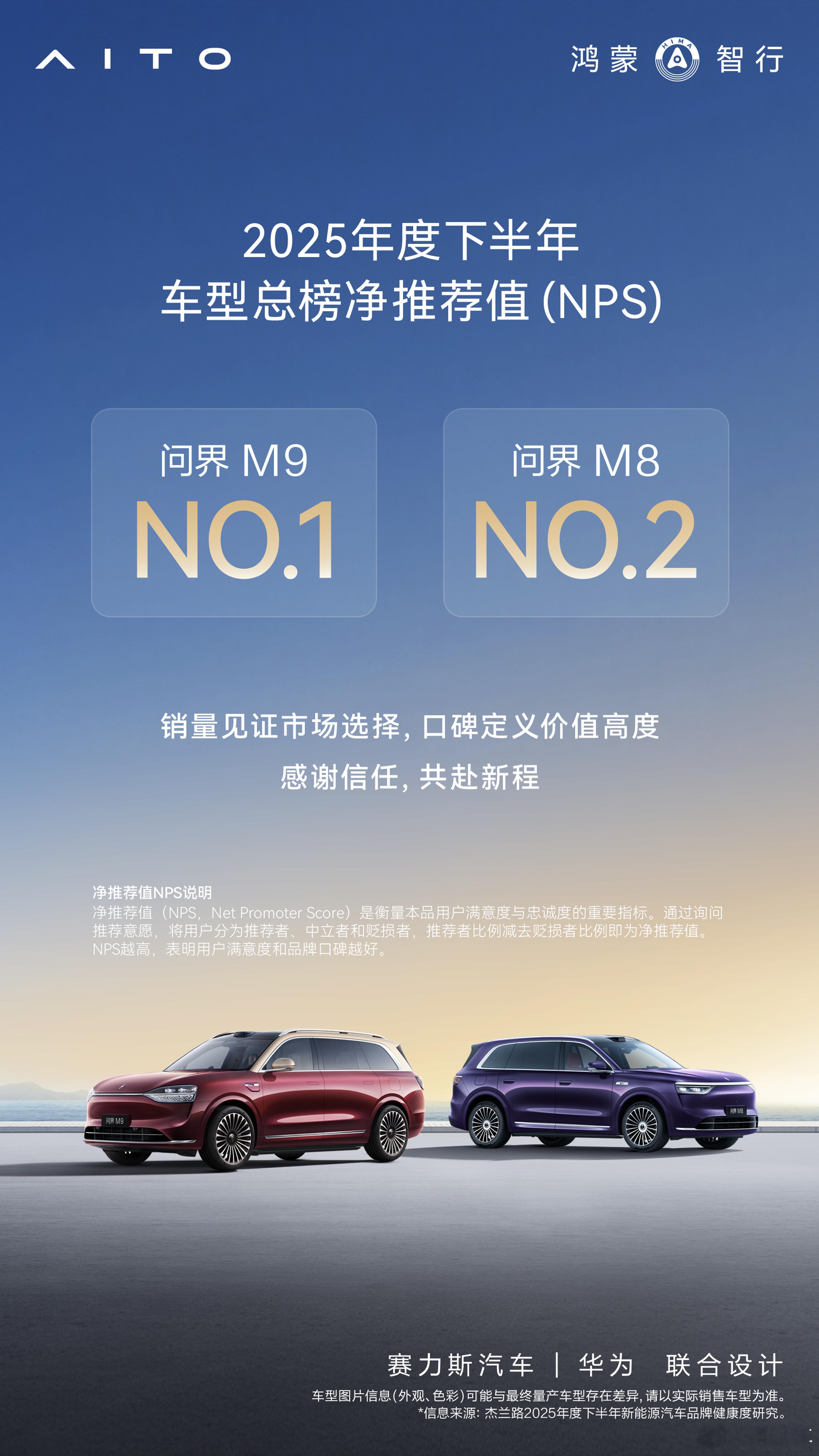 用户口碑是检验品牌的唯一标准!问界凭借卓越的产品和体验,赢得了用户发自内心的推荐。问界M9、M8双旗舰王牌包揽车型总榜净推荐值第一和第二,无疑确立了问界在40-50万级高端市场的统治力买豪华SUV看问界