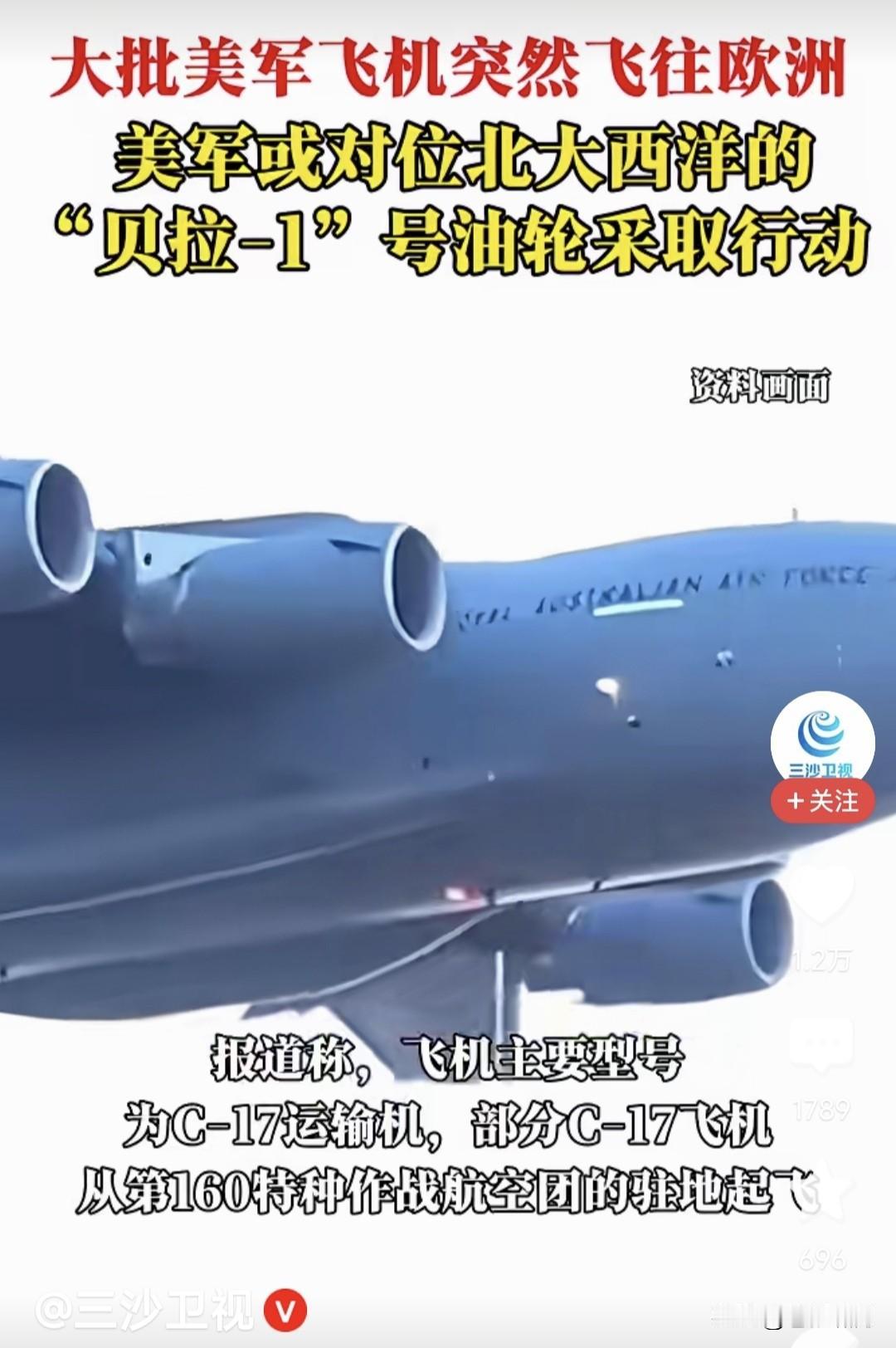 突发!美军大批飞机突然飞往欧洲,主要型号是C-17大型运输机。该机载重77吨,可装载坦克装甲车火炮等军事装备,也可装载连级规模军事人员。 有网友称:美军出动C-17,有可能强行拦截“贝拉1号”油轮。该油轮注册巴拿马国籍,挂巴拿马国旗,曾参与伊朗石油运输。美称其属于俄影子舰队。 此前空载驶往委内瑞拉途中,美军拦截并欲登船检查。该船拒绝,并转身逃跑大西洋。途中向俄连发75次求救信号,并在船身图上俄国旗,求俄保护! 俄随之致信美国,请求不要登船检查!但美方没有回应。这次派出大批运输机飞往欧洲,就是为拦截这艘船吗?这艘船对美国有这么重要吗?天知道。 当然也不一定是这样,美军派大批运输机飞往欧洲,也许并非是针对“贝拉1号”,而是可能有其他重大的事情? 央视最新报道:美国俄乌谈判特使维特科夫与库什纳,将飞赴法国,参加“自愿联盟”为乌提供安全保障会议。 此前泽连斯基曾访美,与川普讨论“俄乌停战协议”,据说取得重大进展,因安全保障有分歧,最终没签署。 这次美特使访法,就是同欧洲盟友与“自愿联盟”,商讨“安全保障”问题!这件事情,不由让人产生联想啊! 谁敢说这些运输机,装载的不是援乌武器弹药?此前美国答应的巡航导弹,一直没有兑现,这次是否兑现了? 当然还有其他武器,比如海马斯火箭炮弹,爱国者防空系统!这些都是乌急需的,川普也许态度转变,又要大力援乌了?是否如此?且看后续报道。 …………
