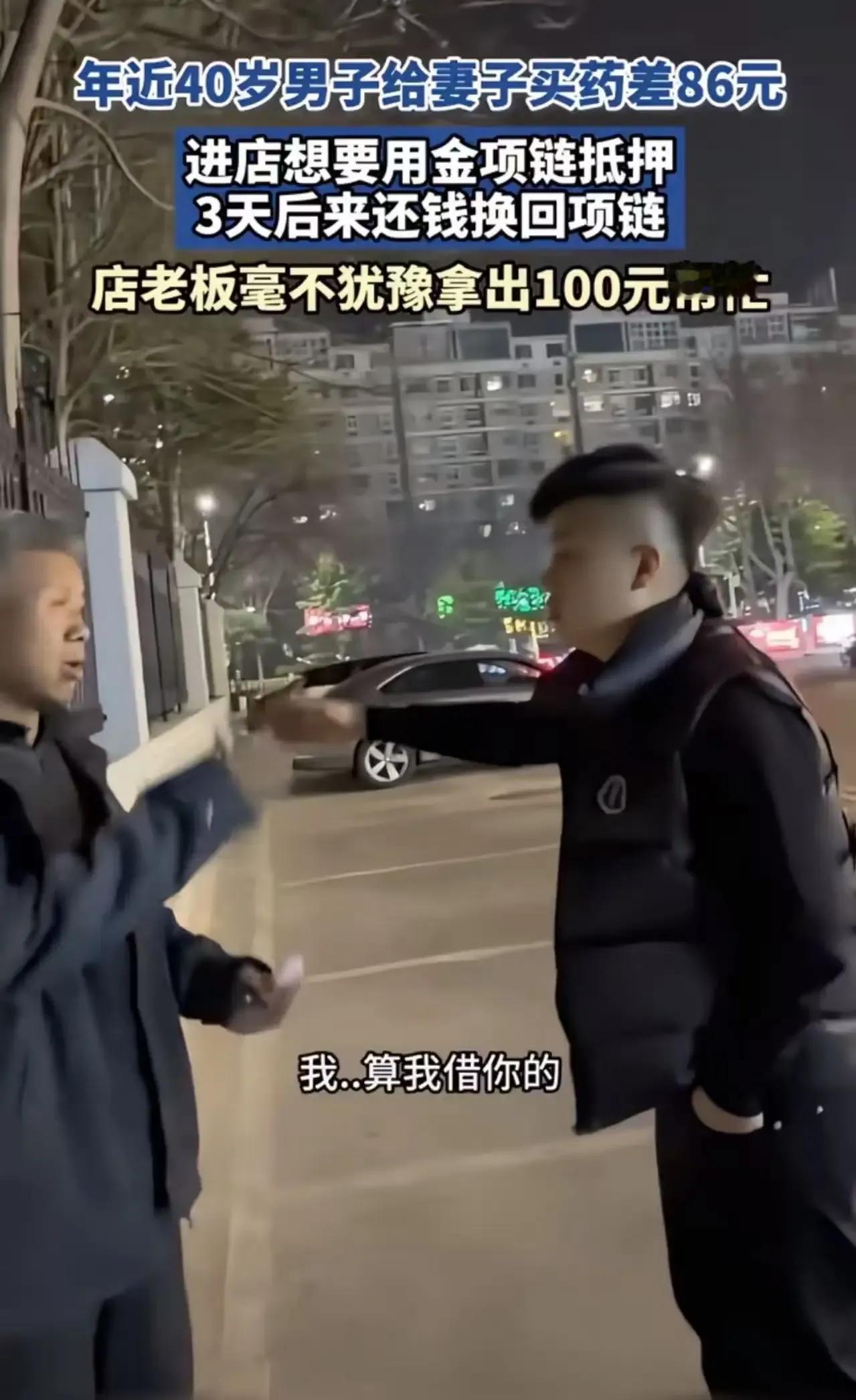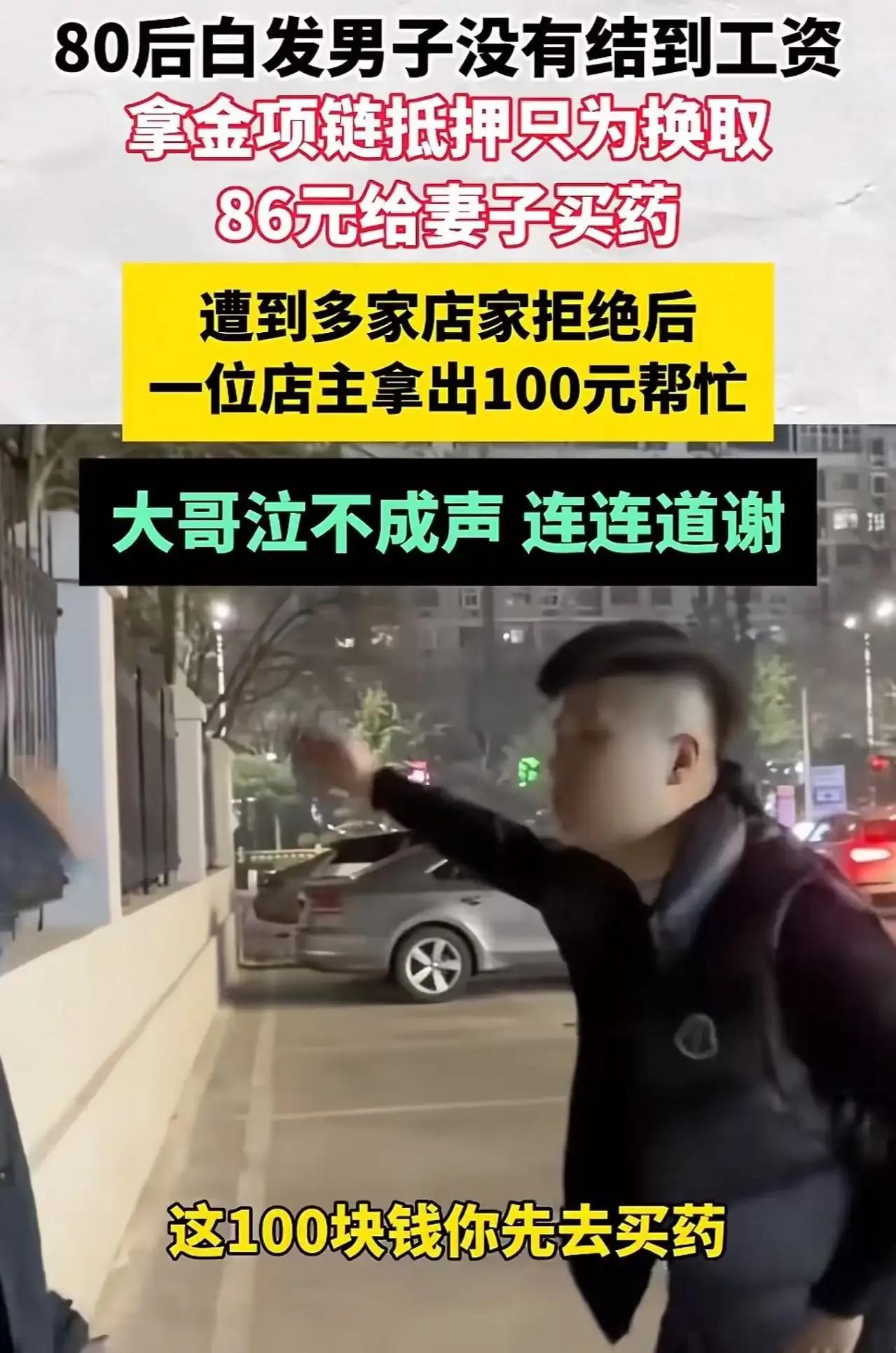 40岁男子满头白发,只为给妻子买药却差86块钱,拿金项链抵押却屡遭拒绝,这究竟是怎么回事? 近日,一段视频在网络上引发了广泛关注。视频中,一位40岁的男子满头白发,焦急地穿梭在多家药店之间。他手中的金项链闪闪发光,却不是为了炫耀,而是为了给生病的妻子买药,却因差86块钱而无法成交。男子尝试用金项链作为抵押,希望能暂时借到这笔钱,然而,多家店主都拒绝了他的请求。就在男子感到绝望,几乎要放弃的时候,一位好心的店主大哥出现了。他不仅给了男子100元,让他能够顺利买到药,还表示不需要男子抵押项链,就算被骗了他也认了。这份无私的善意和信任,让男子感动得热泪盈眶,也让无数网友为之动容。在这个物欲横流的社会,我们或许已经习惯了冷漠和防备,但这位店主大哥的举动,却让我们看到了人性中最美好的一面。 善意与信任,是这个世界最温暖的底色。感谢这位好心的店主大哥,用他的行动给我们上了一堂生动的课。如果你也被这个故事感动,欢迎在评论区留言分享你的感受。每日一善 你遇到过善吗