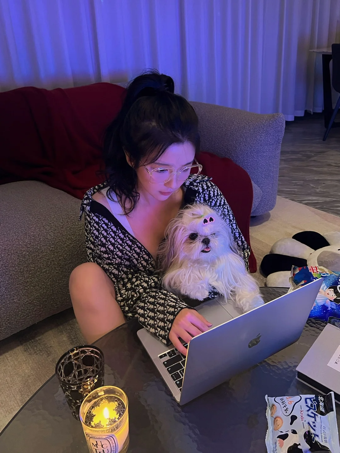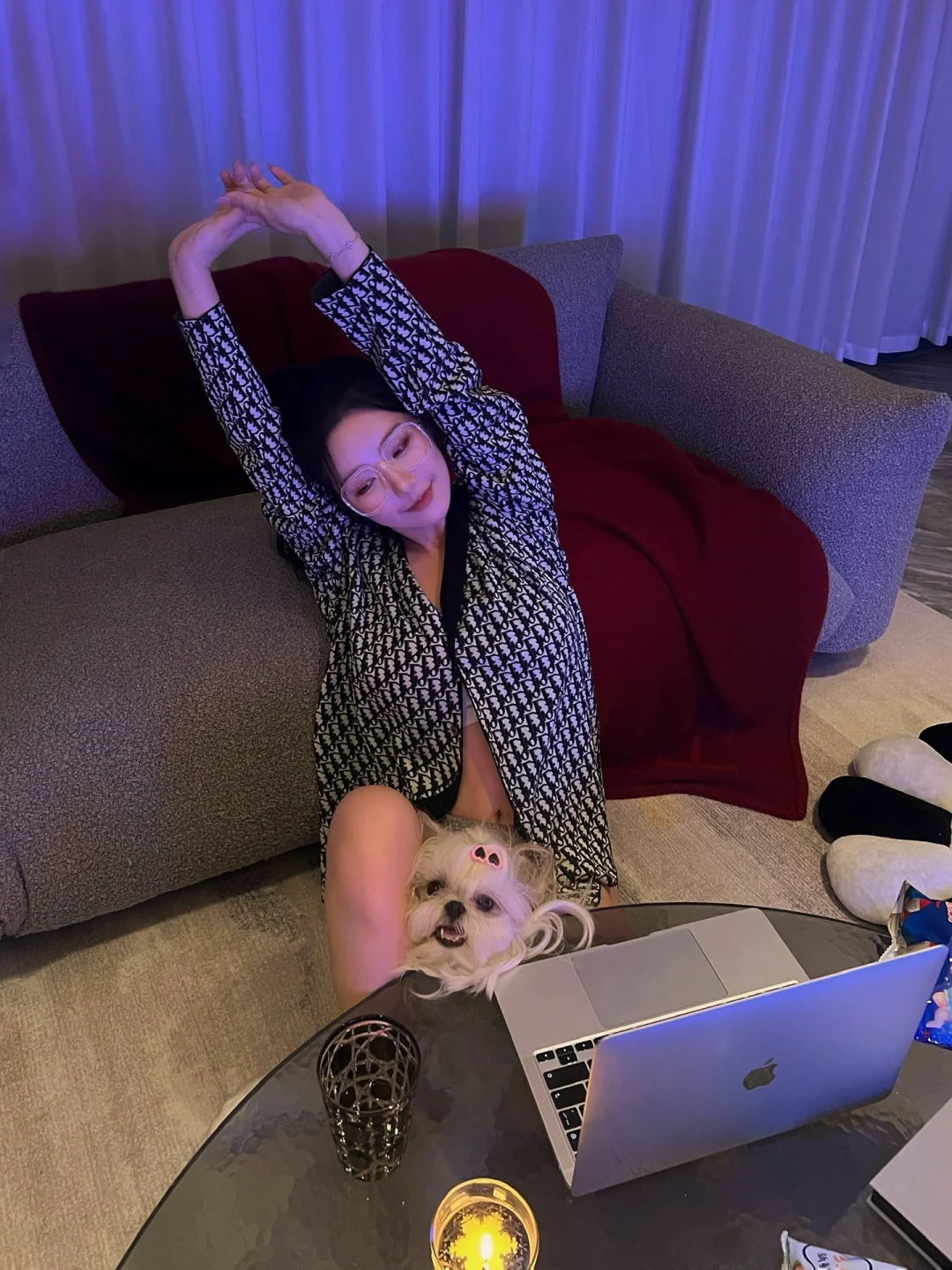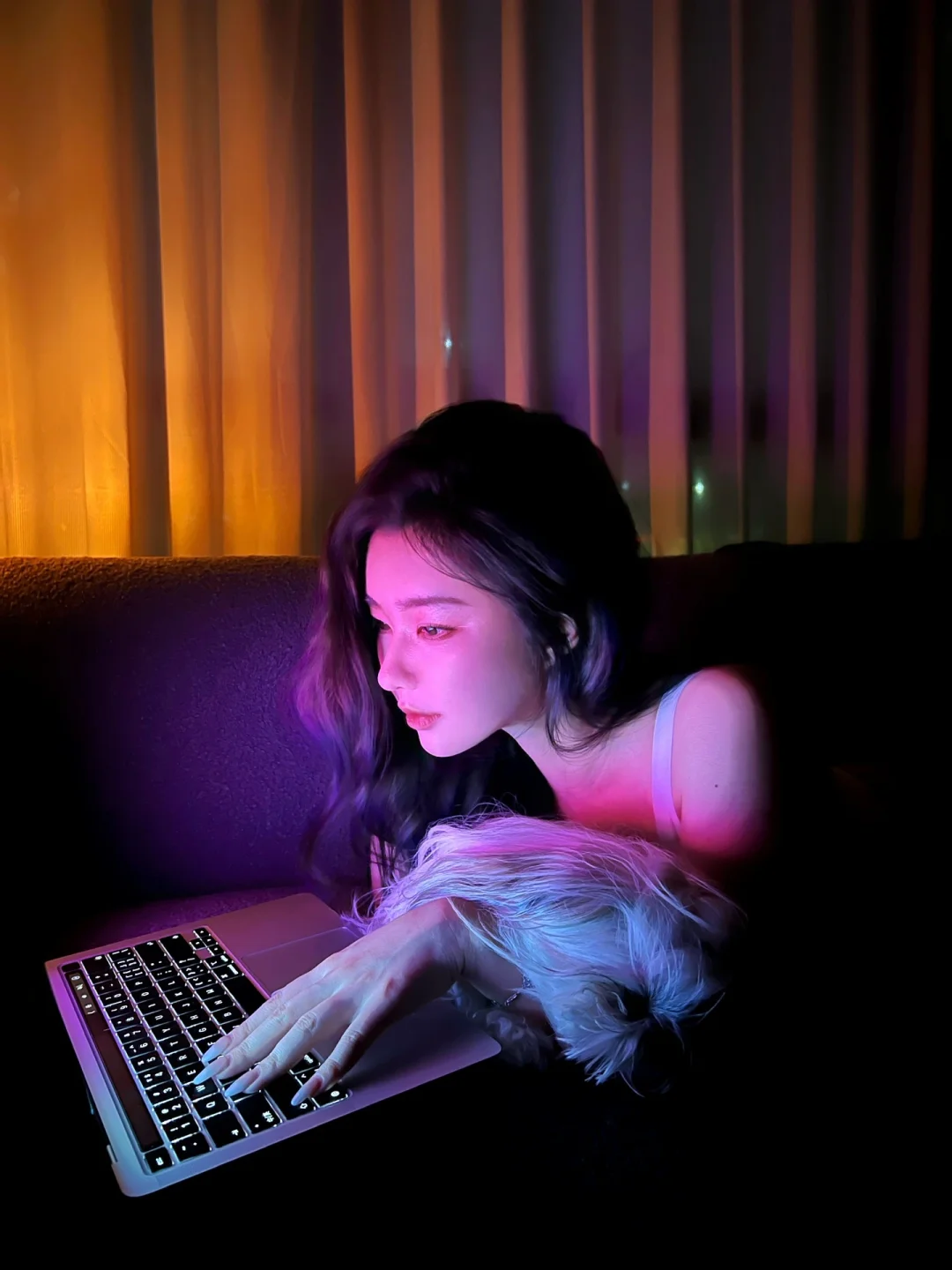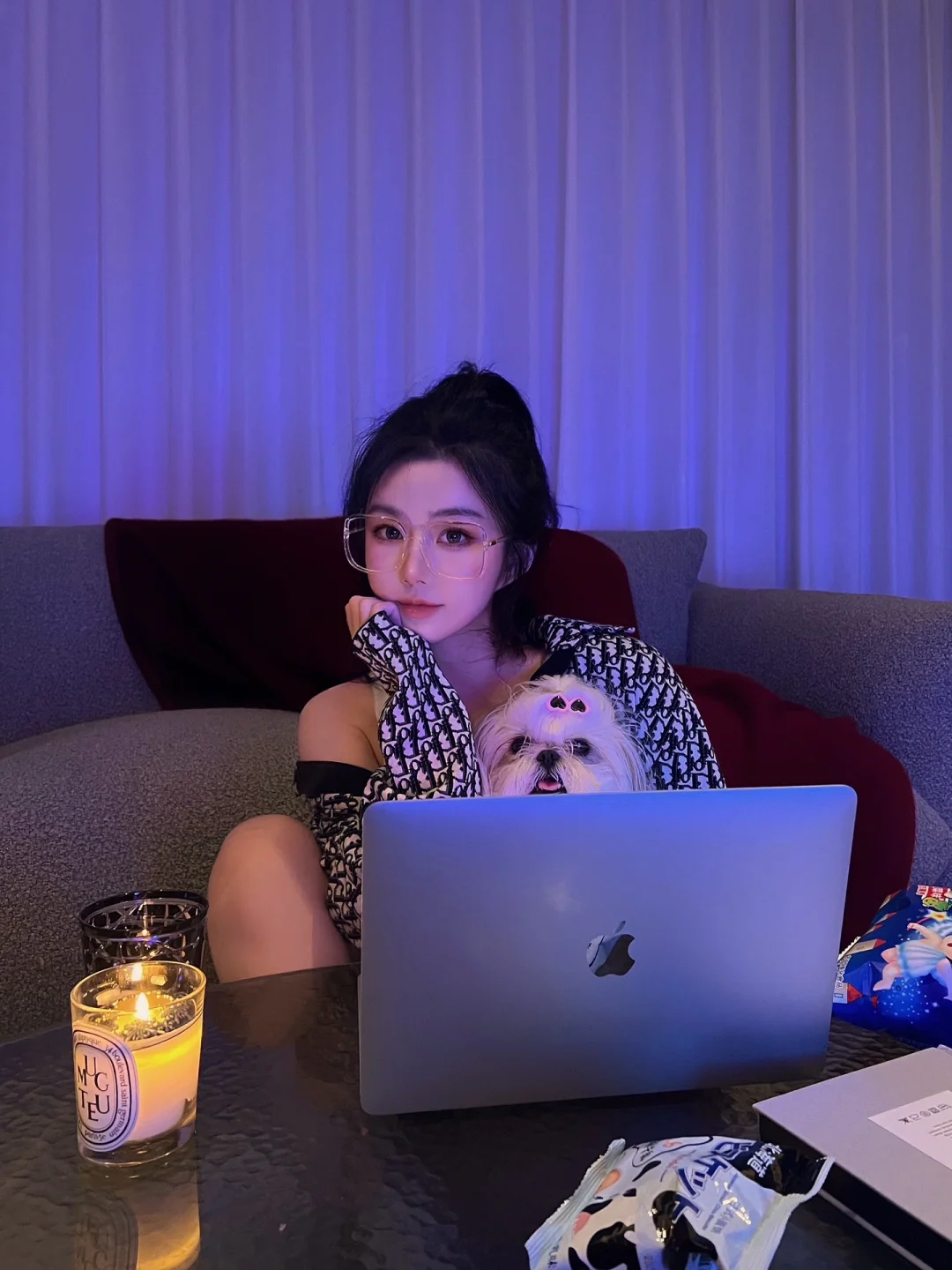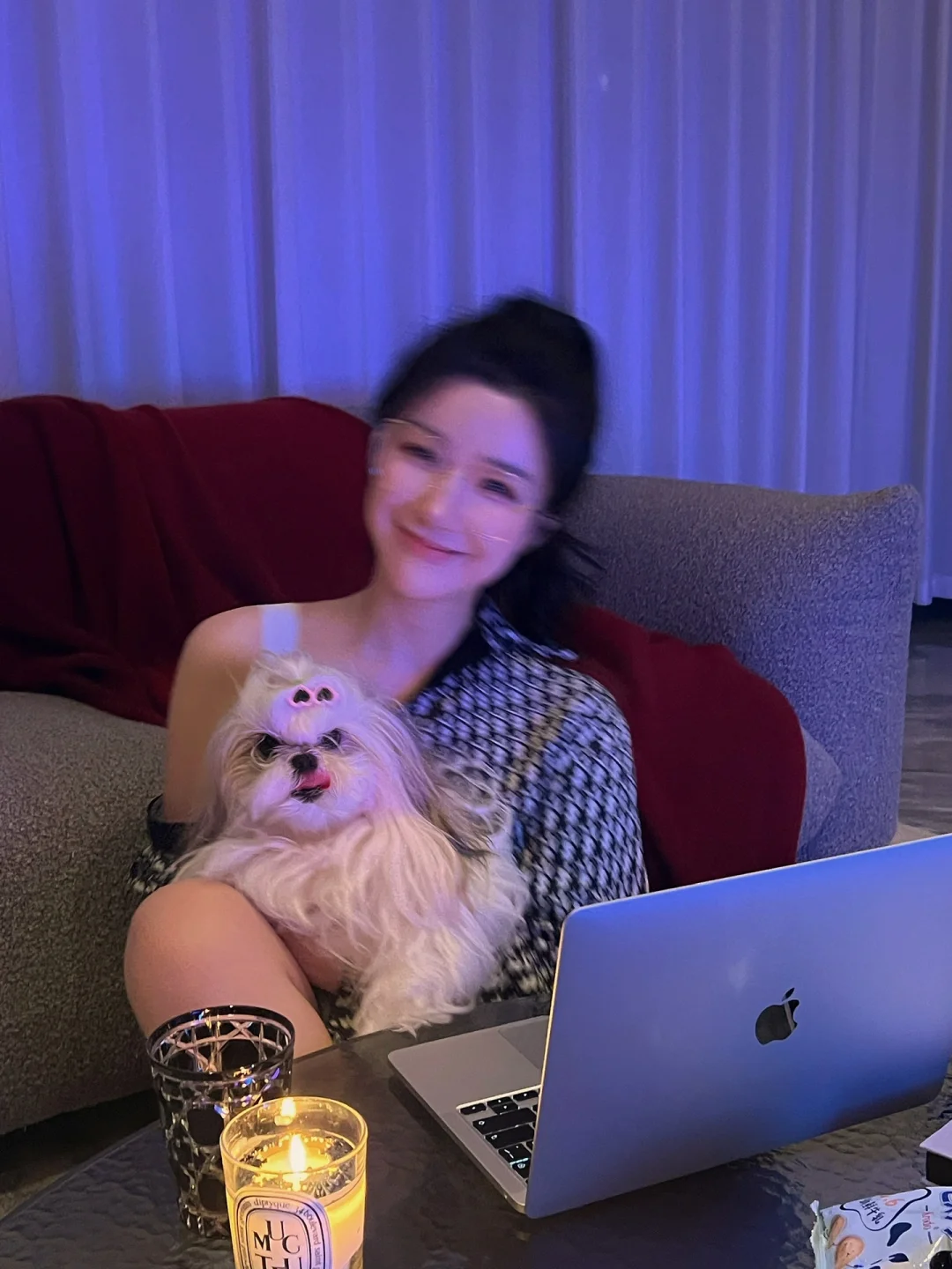 端午假期宅家无聊的老婆们可以尝试拍一组美美哒居家写真哦 超级简单包教包会 - 💻道具: 1⃣️笔记本电脑 2⃣️蜡烛/落地灯 3⃣️居家服,越舒适越随意越好 4⃣️沙发/床 5⃣️有狗狗/猫猫的可以抓来当工具汪一用 6⃣️没用狗狗/猫猫的可以准备些零食饮料 - 📸拍摄技巧: 1⃣️把灯都关掉,窗帘拉上 2⃣️电脑上找一张粉蓝渐变的图,全屏 3⃣️如果觉得太暗可以在需要光源的角落放个蜡烛/落地灯,灯不能太亮哦 4⃣️把工具汪抓来抱着假装玩电脑,没有的话假装喝饮料或吃零食 5⃣️趴在沙发/床上玩电脑更有感觉哦 - 虽然因为灯光昏暗画质很渣 但妥妥的氛围感💯 老婆们快试试吧 -