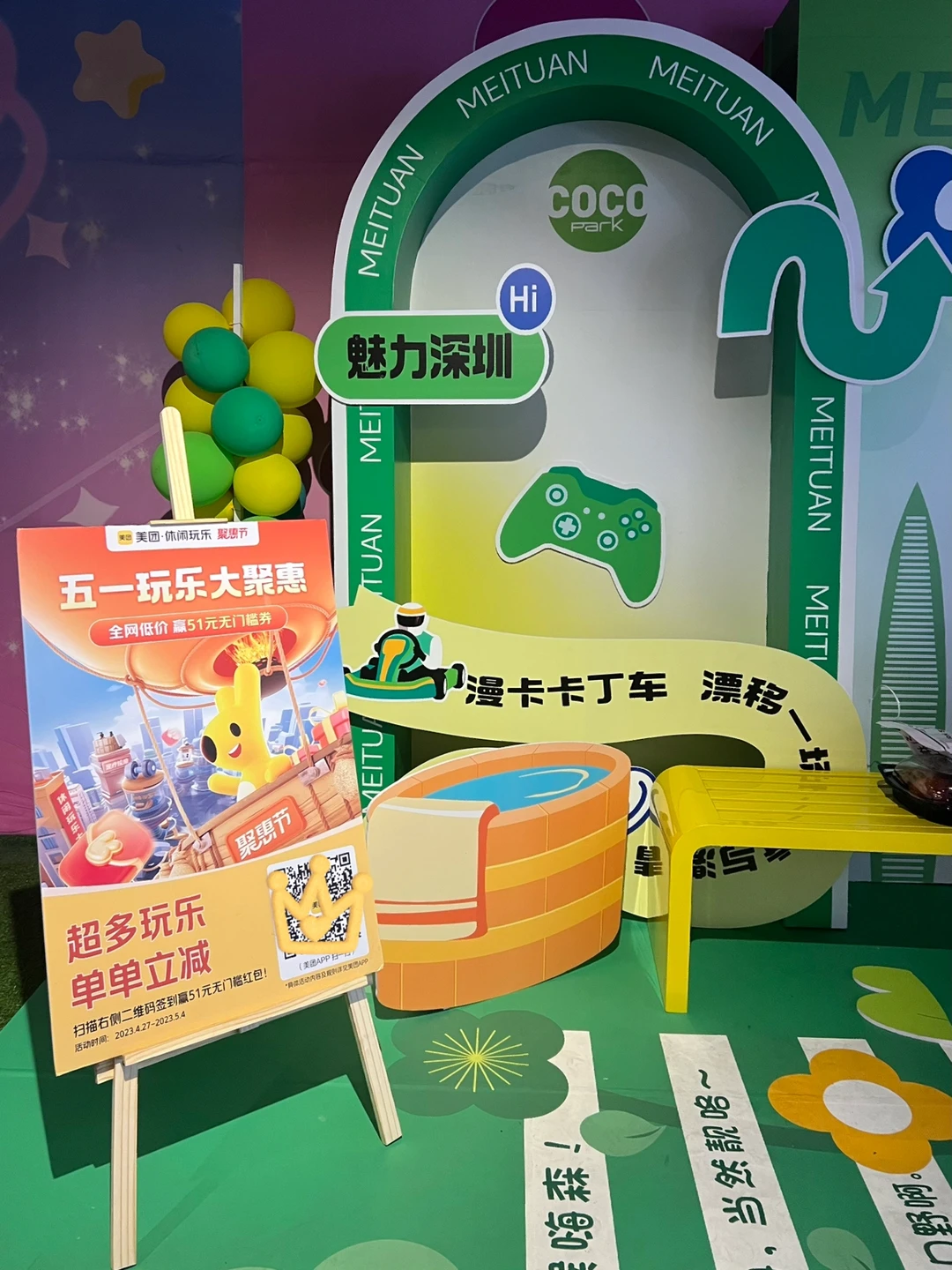 美团在深圳龙岗的Cocopark和布吉万象汇都设了五一聚惠节线下活动打卡点