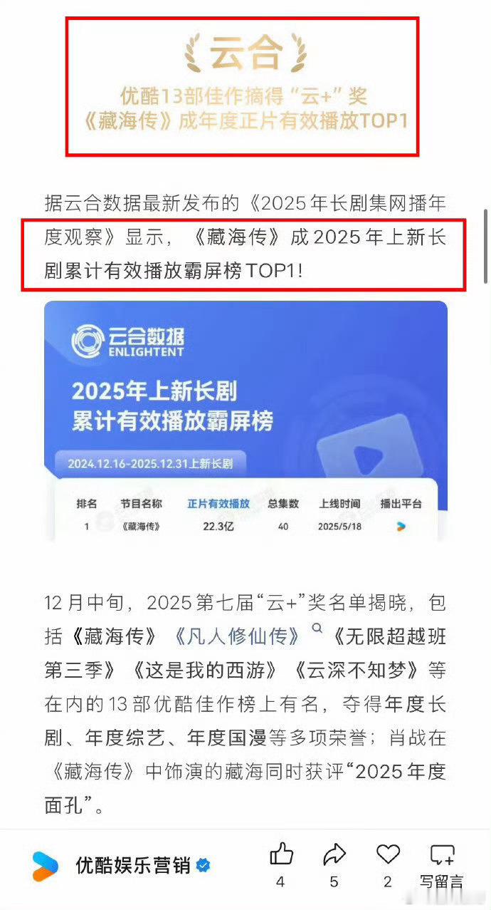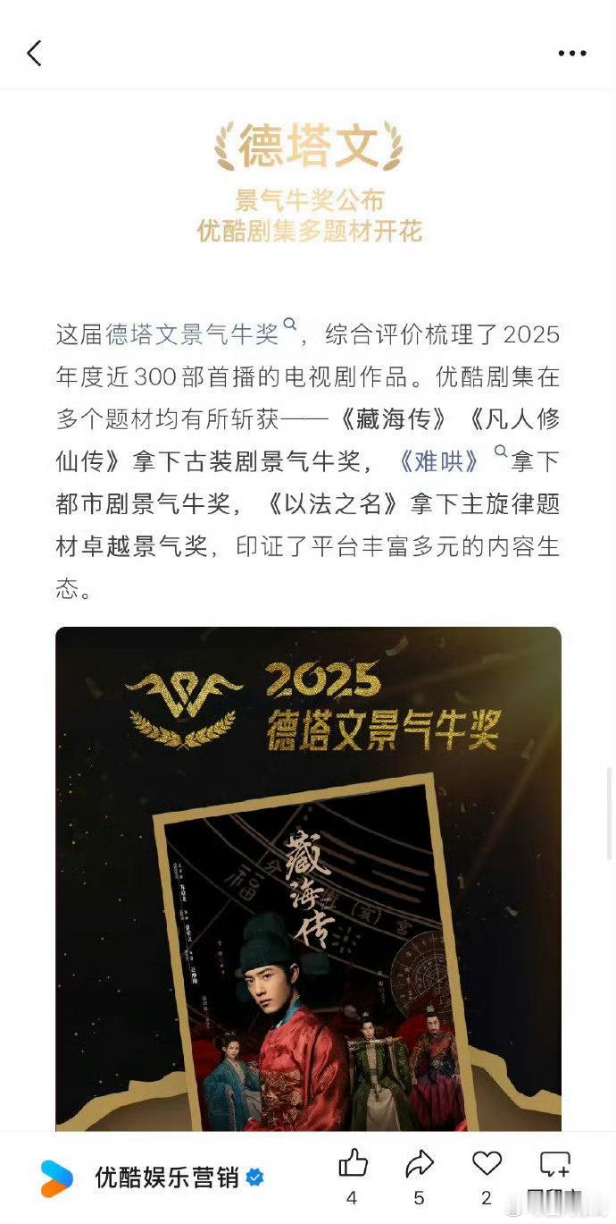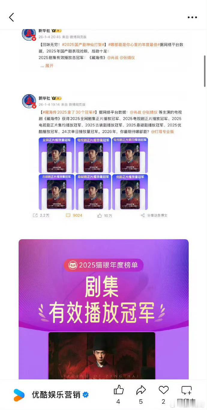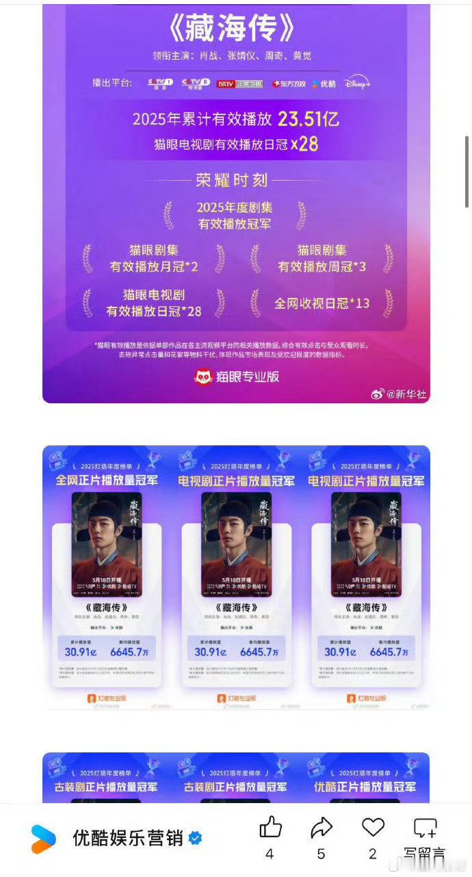 我已经不记得这是优酷官方第多少次夸肖战的藏海传了,反正就是从开播以后三天两头就要拿出来夸一夸,包括拿了多少个史冠、年冠,又破了什么记录,就是因为给👖赚了太多太涨脸面了,但也正常,谁让藏海传是剧王呢,谁让藏海传是2025年被rmrb官方认证的的“中国爆款”呢!