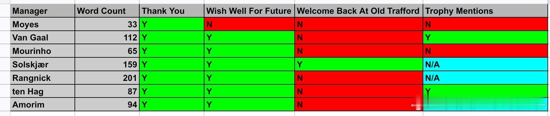 😅球迷对比了曼联历任主教练的下课官宣公告,从5个维度分析各位主帅的待遇1、公告字数2、是否感谢3、是否祝未来顺利4、是否欢迎重回曼联5、是否提及奖杯综合下来看,莫耶斯的待遇最差……(图3是原图)