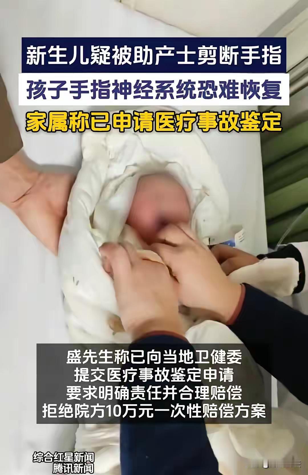 “一根手指才值10万吗?”江苏新生儿手指被助产护士剪断,院方称新生儿乱动所致,两次转运接指后神经肌腱难恢复,院方提10万元一次性赔偿,家属拒赔并向卫健委提交医疗事故鉴定。 这起令人震惊的事件再次敲响了社会对医疗行业诚信与责任的警钟。一个新生儿的手指被“意外”剪断,竟然变成了价值10万元的“交易”,这背后隐藏的,不仅仅是个别医务人员的失职,更是制度监管的漏洞和伦理底线的严重失守。 事件的始末令人心碎:助产护士在新生儿生产过程中,因为操作不当或疏忽,导致手指被剪断。院方试图以“新生儿乱动”为由推卸责任,甚至提出10万元的赔偿方案。家属坚决拒绝,选择追究医疗责任,并请求专业鉴定。这一系列动作,彰显了他们对孩子未来的责任感,也反映出家属对医疗行业诚信的期待。 然而,更令人愤怒的是,院方竟然用“价格标签”来衡量一根手指的价值——10万元。这种“交易式”的赔偿方案,令人质疑其背后的伦理底线。手指,代表的不仅是身体的完整,更是一个生命的尊严和未来的可能性。用金钱来衡量伤害的“价值”,无疑是一种极度的物化和冷漠。 这起事件折射出当前部分医疗机构在追求利益的同时,忽视了对患者的责任和人文关怀。医疗不仅仅是技术操作,更是关乎生命的尊重与呵护。每一次失误,都可能带来无法弥补的伤害。医务人员的职业操守、制度的监管、患者的权益保护,都是不可或缺的组成部分。 公众的愤怒和关注,正在推动社会对医疗行业的反思。我们期待,相关部门能够依法依规,进行公正的鉴定和处理。更希望的是,未来的医疗环境中,责任与诚信成为行业的底线,医患关系不再充满猜疑与恐惧。 这起事件告诉我们:生命的价值,不应用金钱衡量。每一个新生命都值得被温柔呵护,每一次医疗操作都应以“生命至上”为准则。只有这样,社会才能少一些“手指被剪断”的悲剧,多一些温暖与希望。让我们共同呼吁:尊重生命,坚守底线,让医疗行业回归初心,为每一个生命保驾护航。新生儿医疗事故 宝宝手指受伤