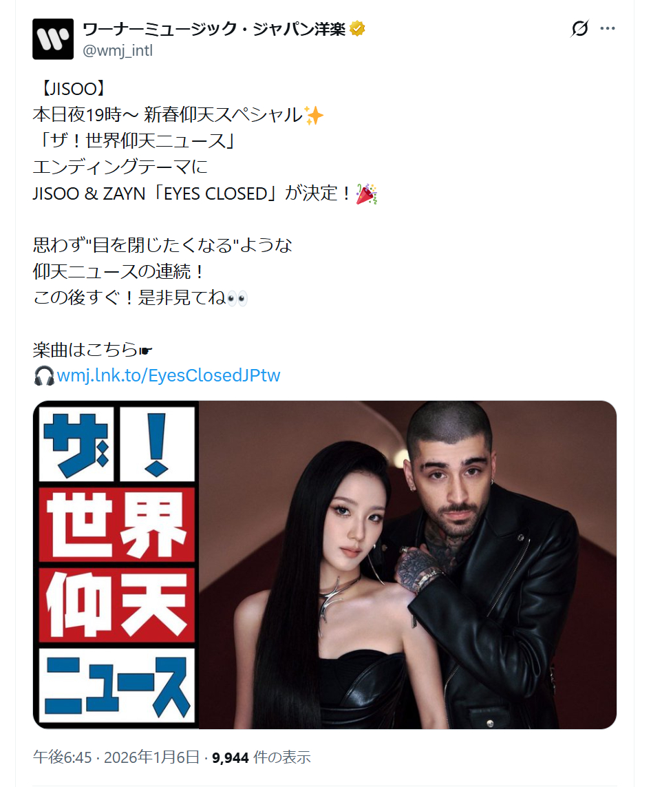 我靠!!这首歌上日本知名节目的片尾曲了??我昨天错过了!最近都没看电视!【JISOO】今晚19时起 新春惊喜特别篇✨《世界震撼新闻》片尾曲确定为JISOO & ZAYN「EYES CLOSED」!🎉接连不断的震撼新闻让人忍不住想"闭上眼睛"!即将播出!请一定收看👀