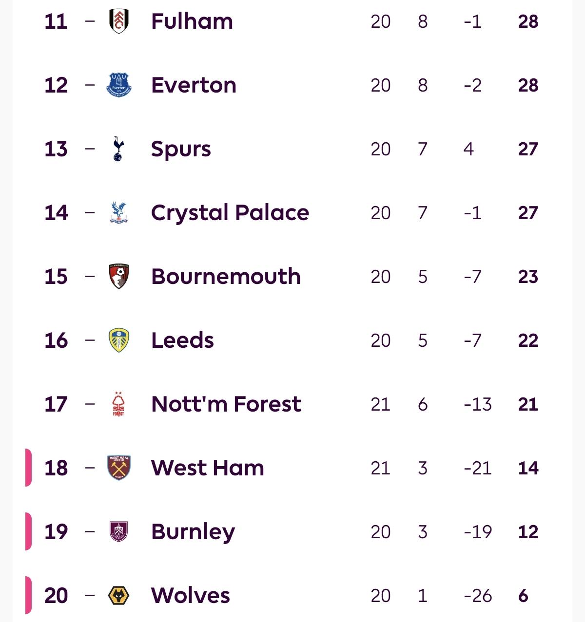 【西汉姆输掉保级关键战】英超第21轮,西汉姆联主场1-2不敌诺丁汉森林。输掉保级六分战后,西汉姆积14分排名第18,已落后第17的森林7分(图3),保级形势岌岌可危! 比赛开场第13分钟,西汉姆借助角球机会打破僵局,森林后卫穆里略解围不慎自摆乌龙。下半场局势反转,第55分钟,森林球员安德森开出角球,多明格斯前点头球破门扳平比分。第89分钟,西汉姆门将阿雷奥拉禁区内碰撞怀特,VAR介入后裁判判罚点球,怀特主罚命中完成绝杀。