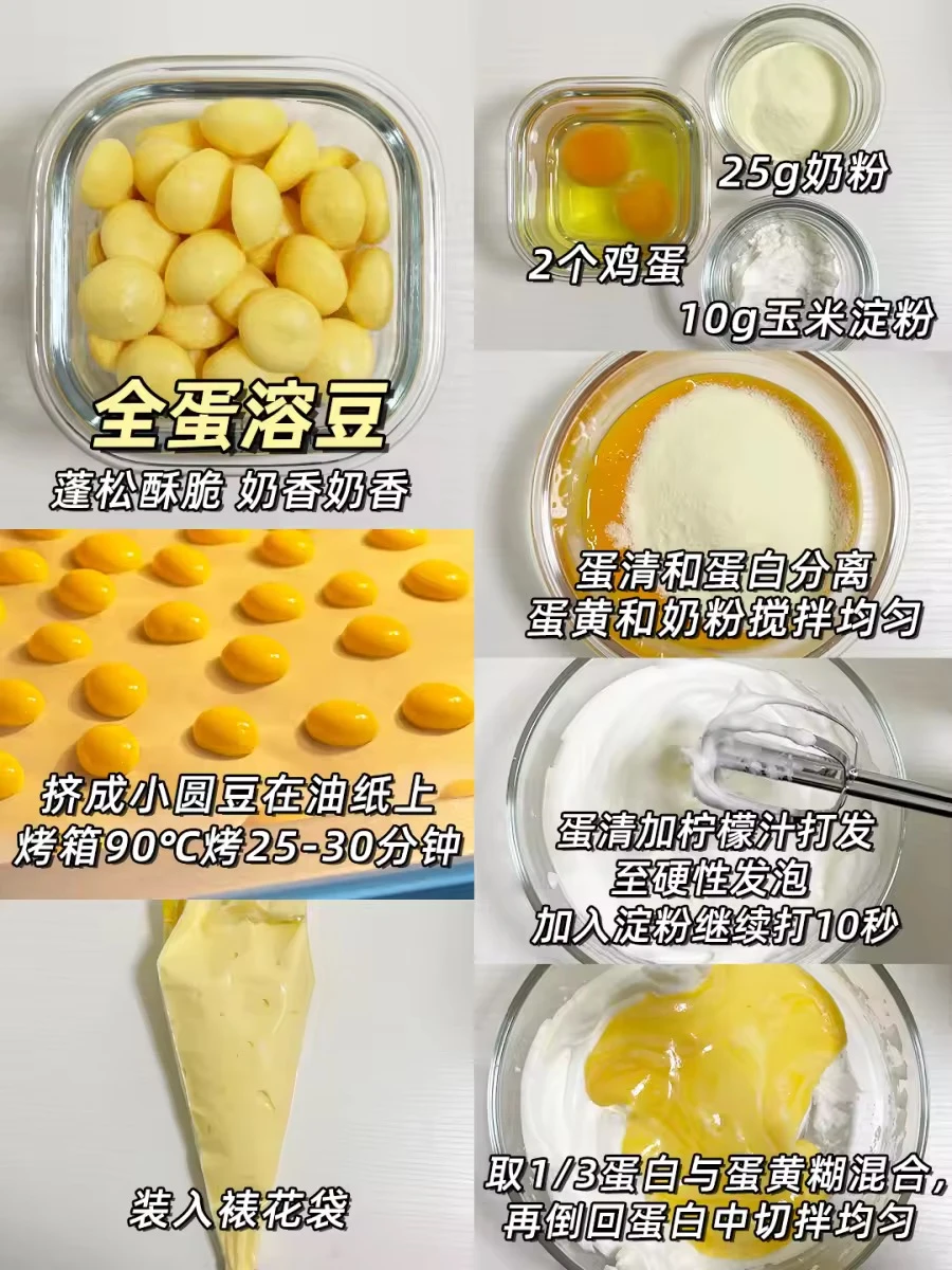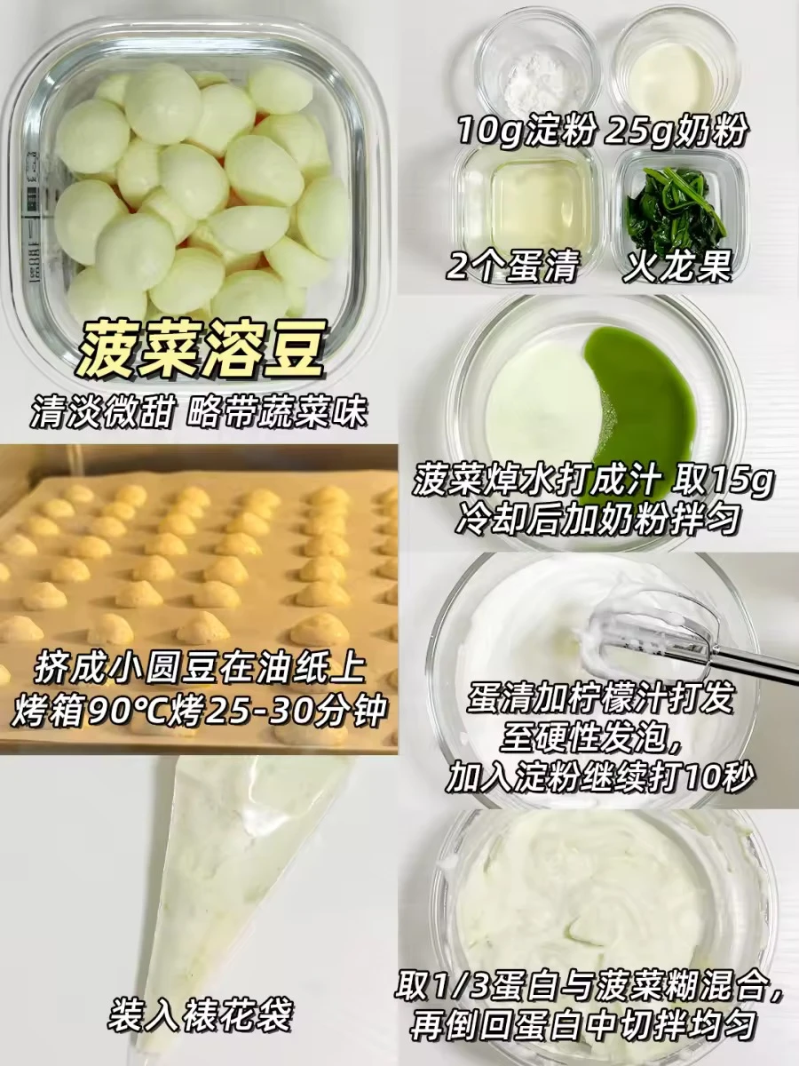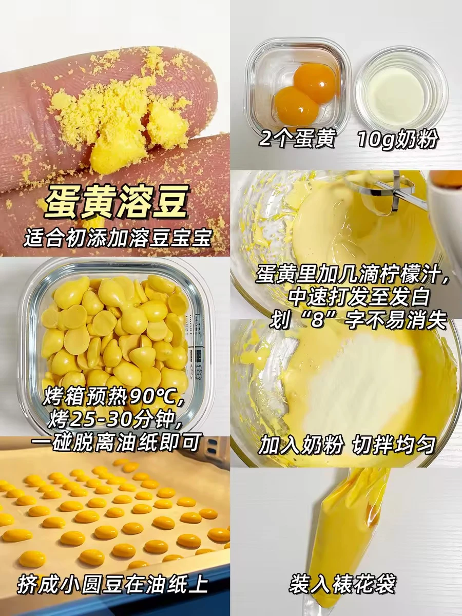 材料:主要是鸡蛋、奶粉、以及不同口味的果蔬泥。不同口味的溶豆在于添加不同果蔬成分;