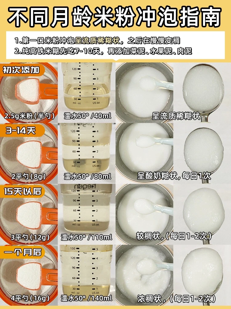 🥣15天+:12g米粉(3平勺)+温水50度/110ml=较稠状🥣1个月后:16g米粉(4平勺)+温水50度/140ml=浓稠状