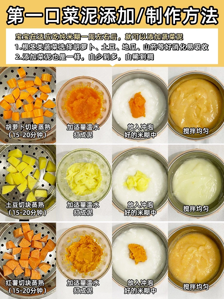 ⭕️6月龄可以添加蔬菜泥:吃纯米糊一周左右后,就可以添加蔬菜泥,以易消化,不易过敏为主。
