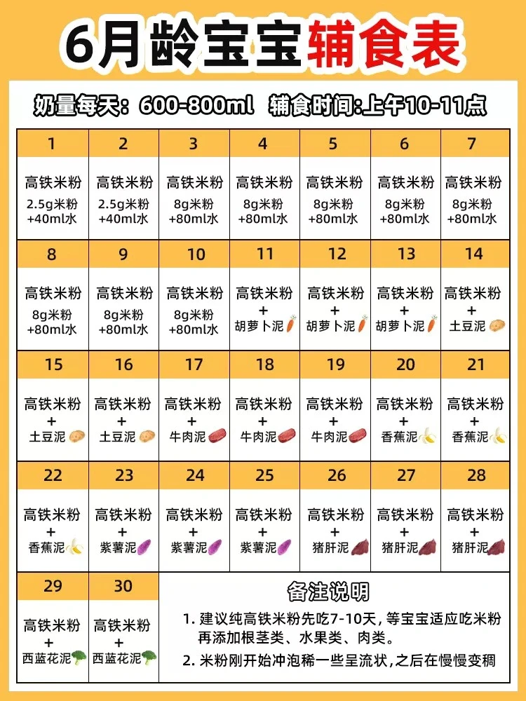 6月龄刚开始吃辅食,第一口建议是高铁米粉,冲泡呈流质状,比奶粉稍浓,宝宝这时还处于吞咽期,尝试为主,宝宝不吃不强求。🥣第一口:2.5g米粉(半勺)+温水50度/40ml=流质稀糊状🥣3-14天:8g米粉(2平勺)+温水50度/80ml=酸奶糊状