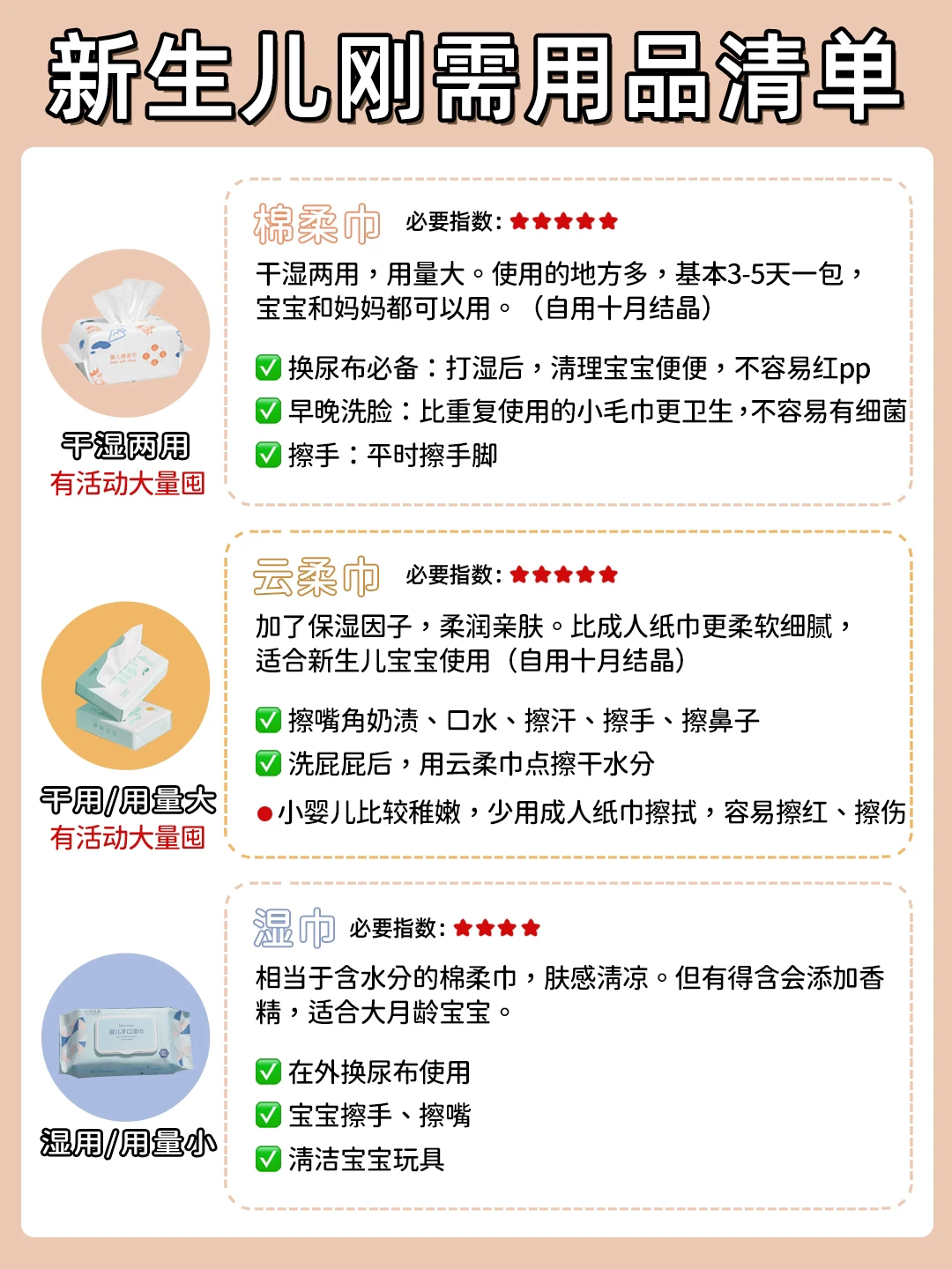 👩有好多新手妈妈不理解,为什么要买多种类型的纸巾,具体有什么区别吗⁉️以我家举例一共是买了三种,棉柔巾、云柔巾、湿巾!