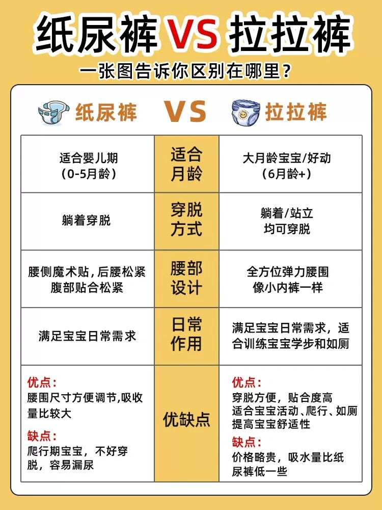 适合小月龄(0-5月龄),躺着穿脱,舒适度高,吸水量大,腰围尺寸方便调节。大宝宝不配合很难穿上,贴合度没有拉拉裤好。